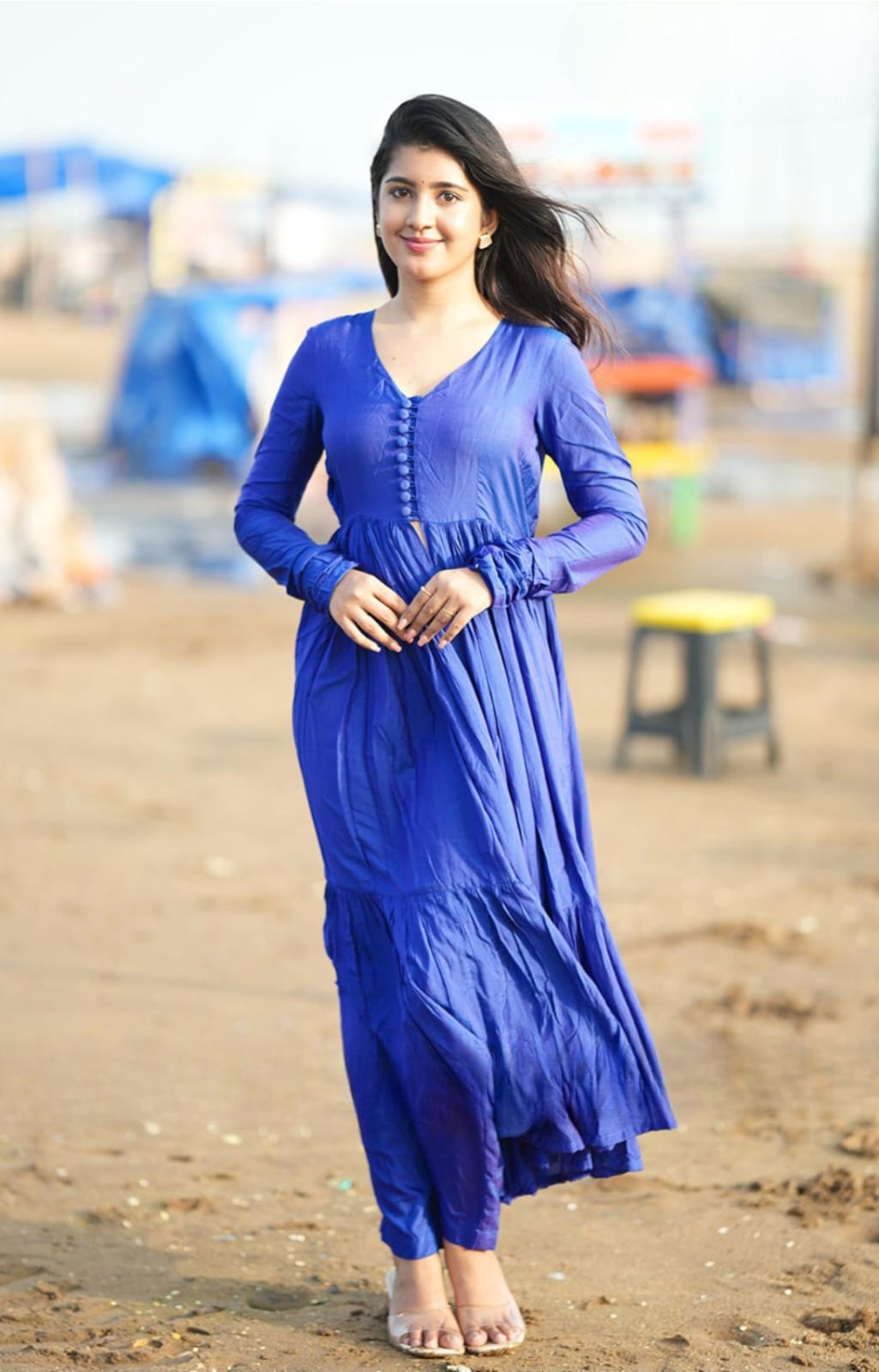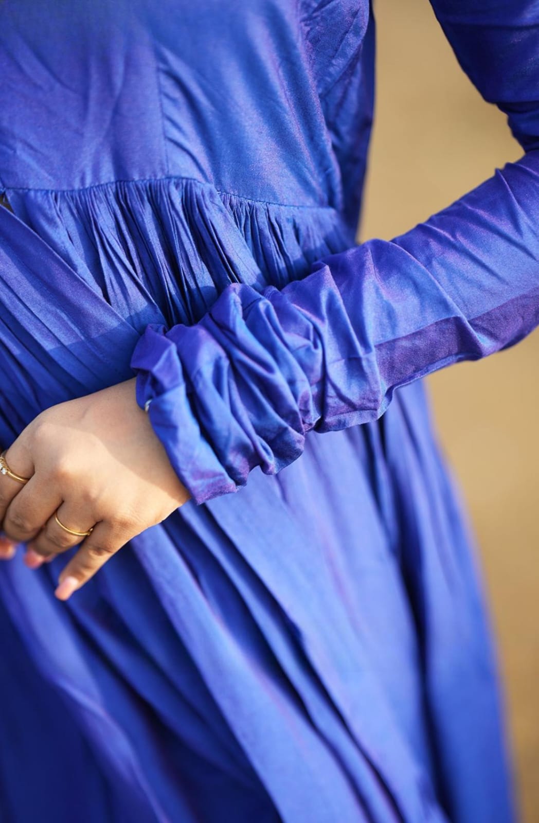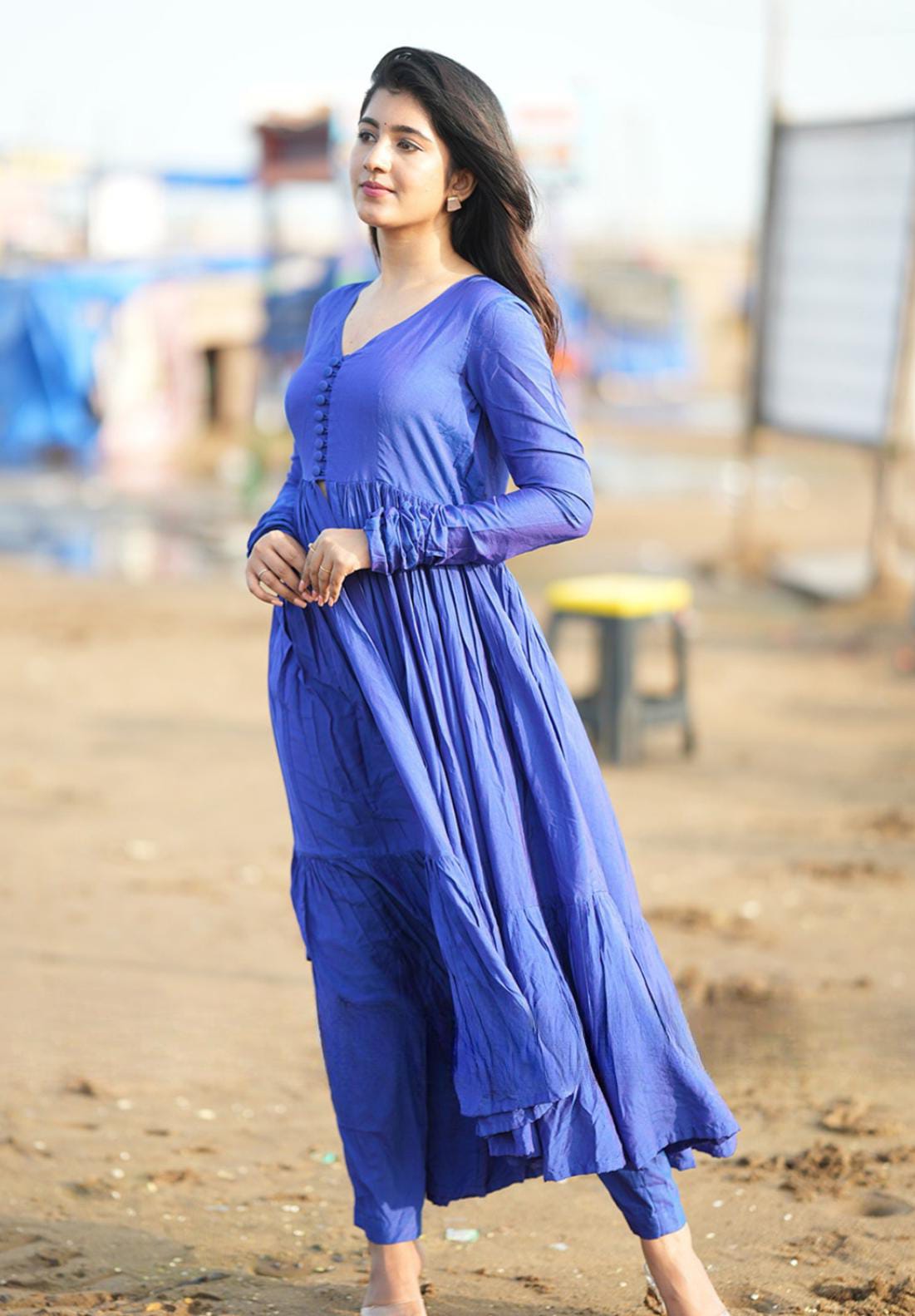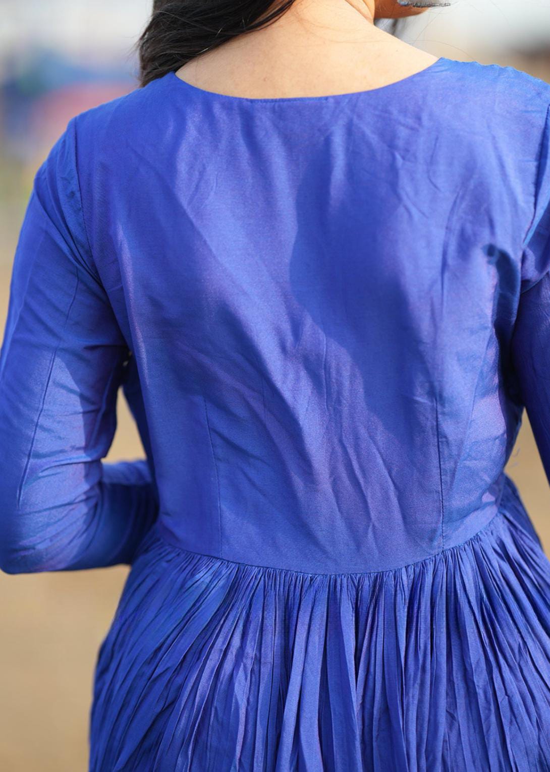 Feminine charm meets effortless elegance in our Leher kurta set in blue color. Crafted from soft muslin fabric, it features a stylish and flowy flare. The kurta has a V-neckline with a Lupi fabric (potli)button and a front cut from the yoke part to the down. A delicate gathered pleats on the bottom layer of the kurta. The straight-cut pant perfectly matches the kurta, which gives comfort and is easy to carry. This shillohttes will be the ideal choice for poolside outings and special occasions with a pearl necklace and earrings for an elegant look. (Side zip in the dress and elastic with zip in the bottom)