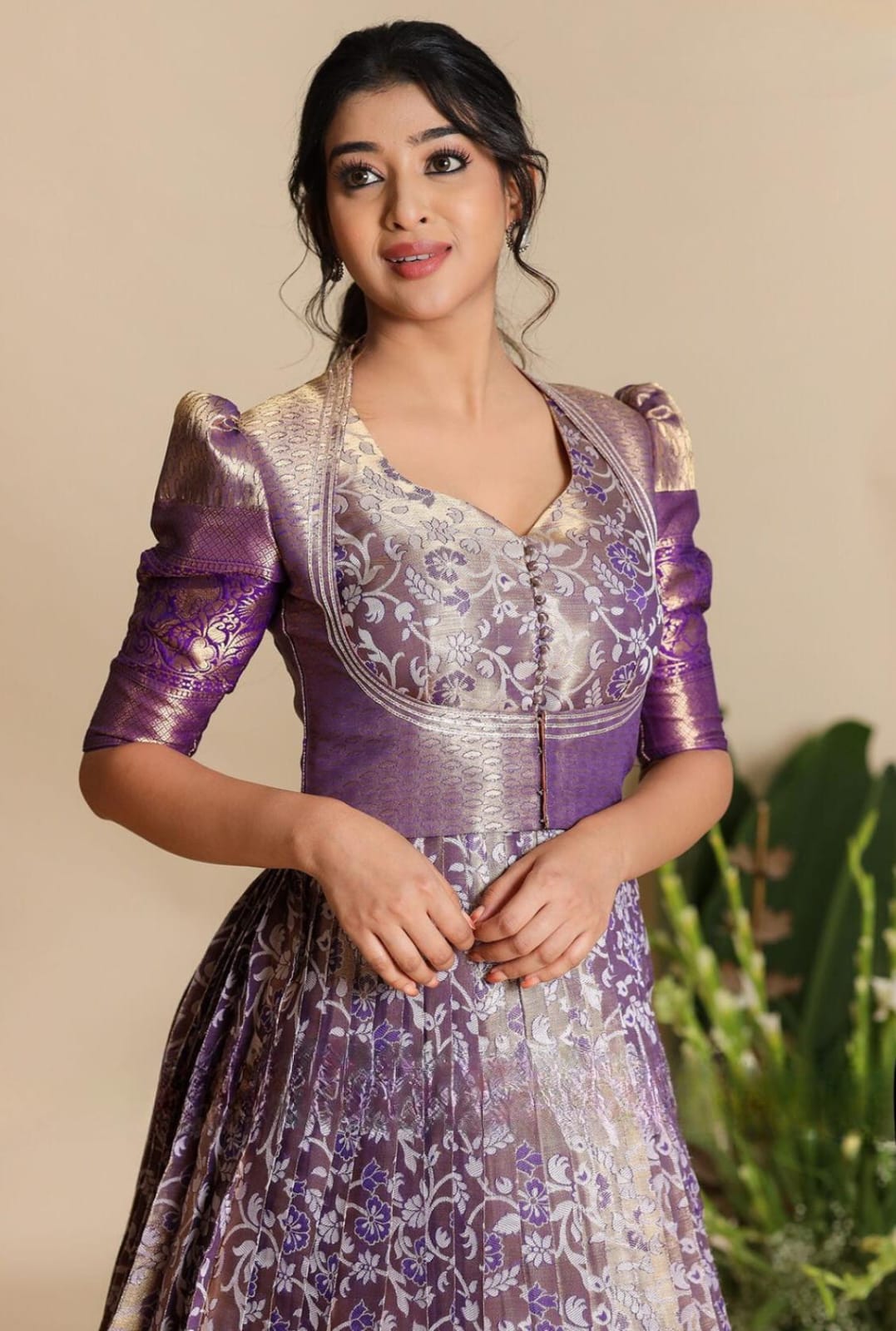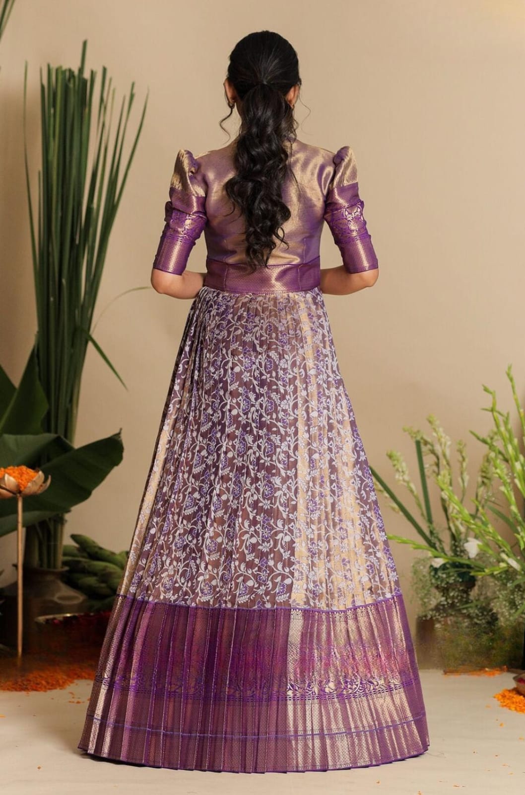 Experience the charm of Indian textiles with This Banarasi two-piece dress. Crafted in Banarasi silk fabric, the Jacket highlights fantastic features, such as puff sleeves with gotta lace on the yoke, potli detailing on the front opening, and a sweetheart neckline. Twirl your heart out, as it will definitely give you an Indian princess vibe in this dress. The edge of the dress and the sleeves feature some intricate, detailed, broad Pattu designs.