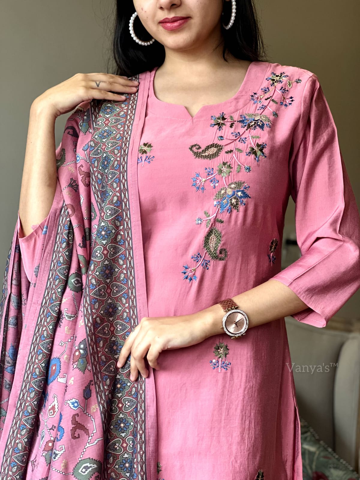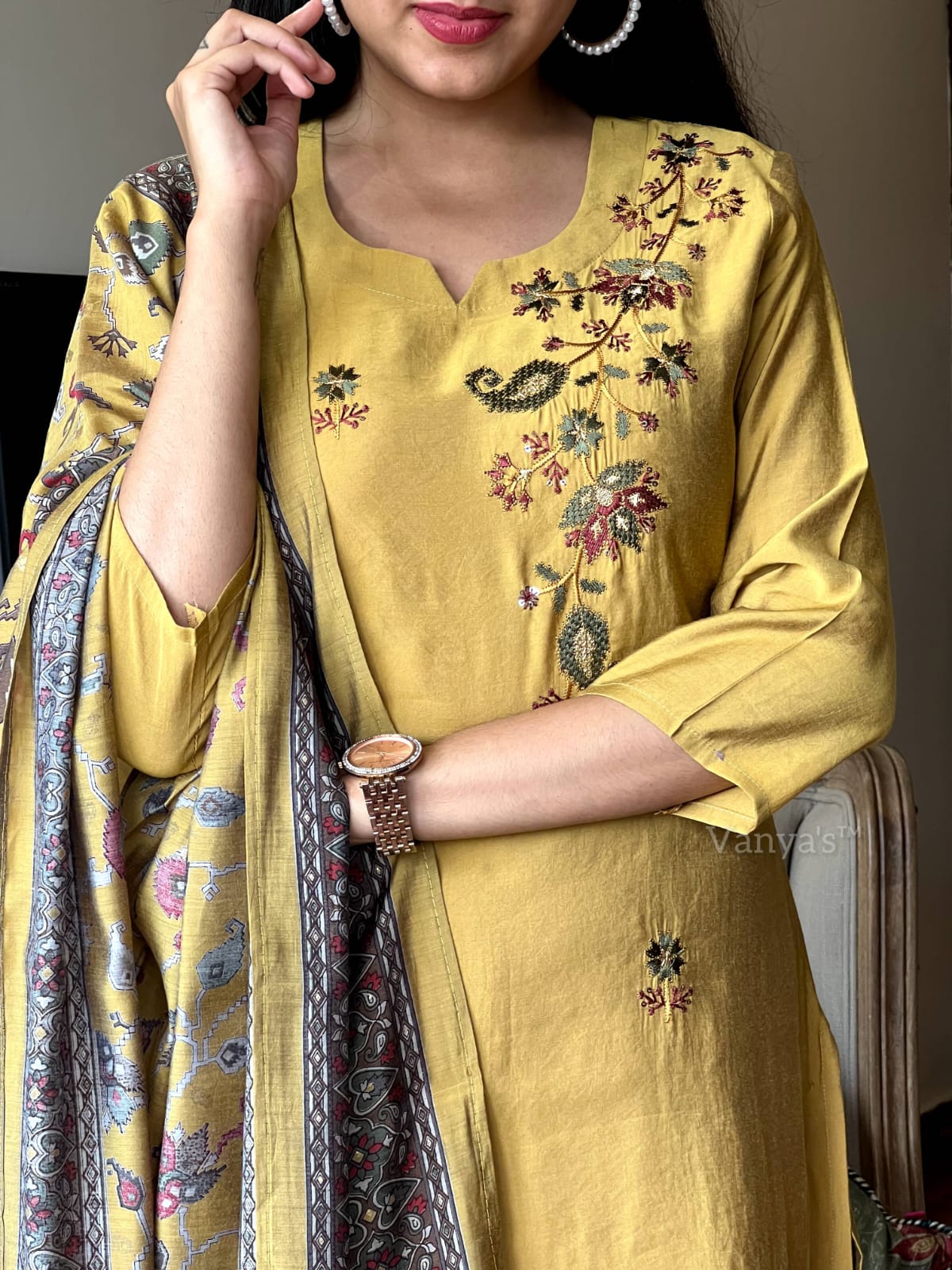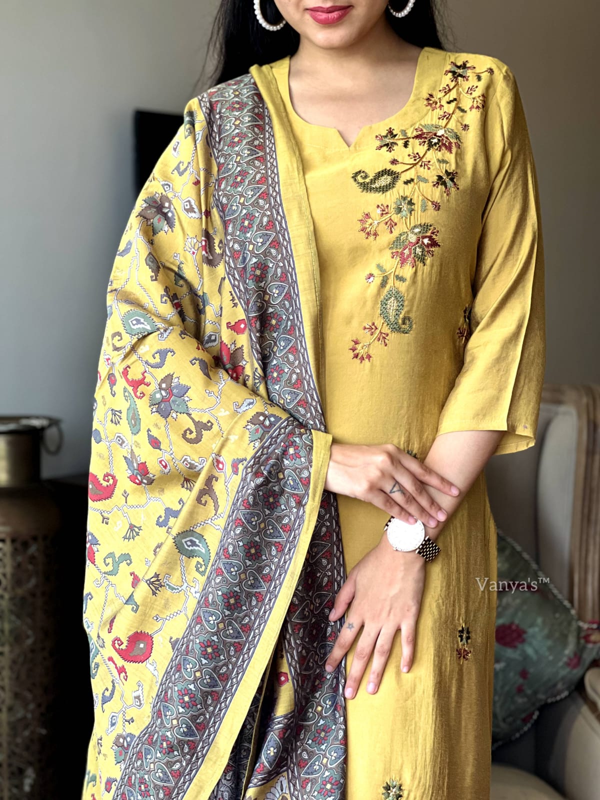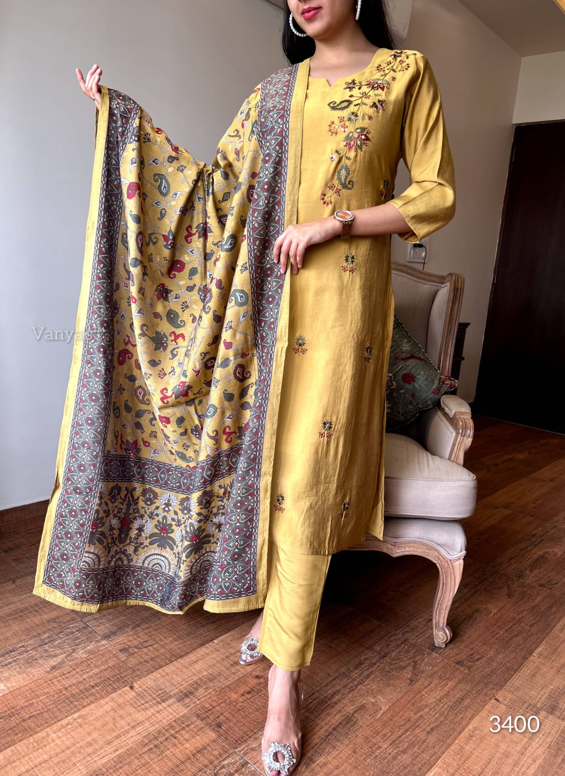 LOTUS dola silk elegant kurta is given an exquisite touch. Added Same printed very comfort dola silk fabric pant and paired with our MIL DYE Bombay printed chanderi silk duppata.
