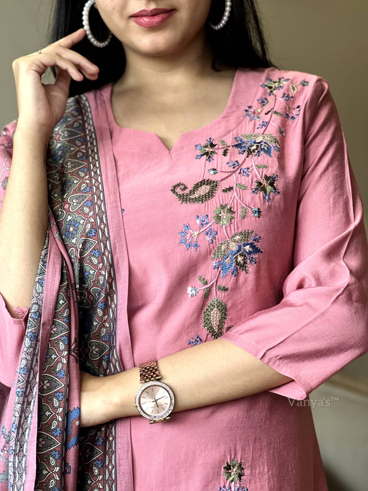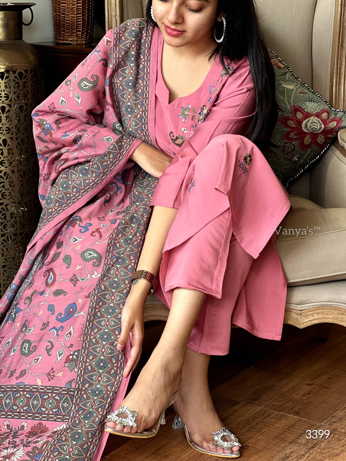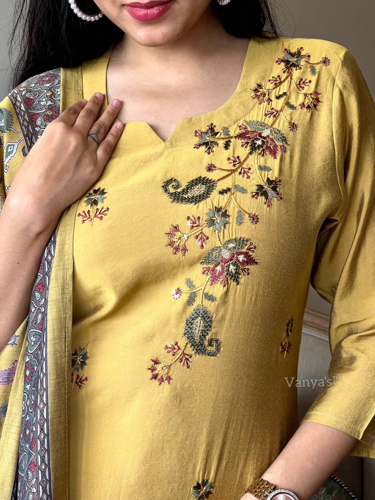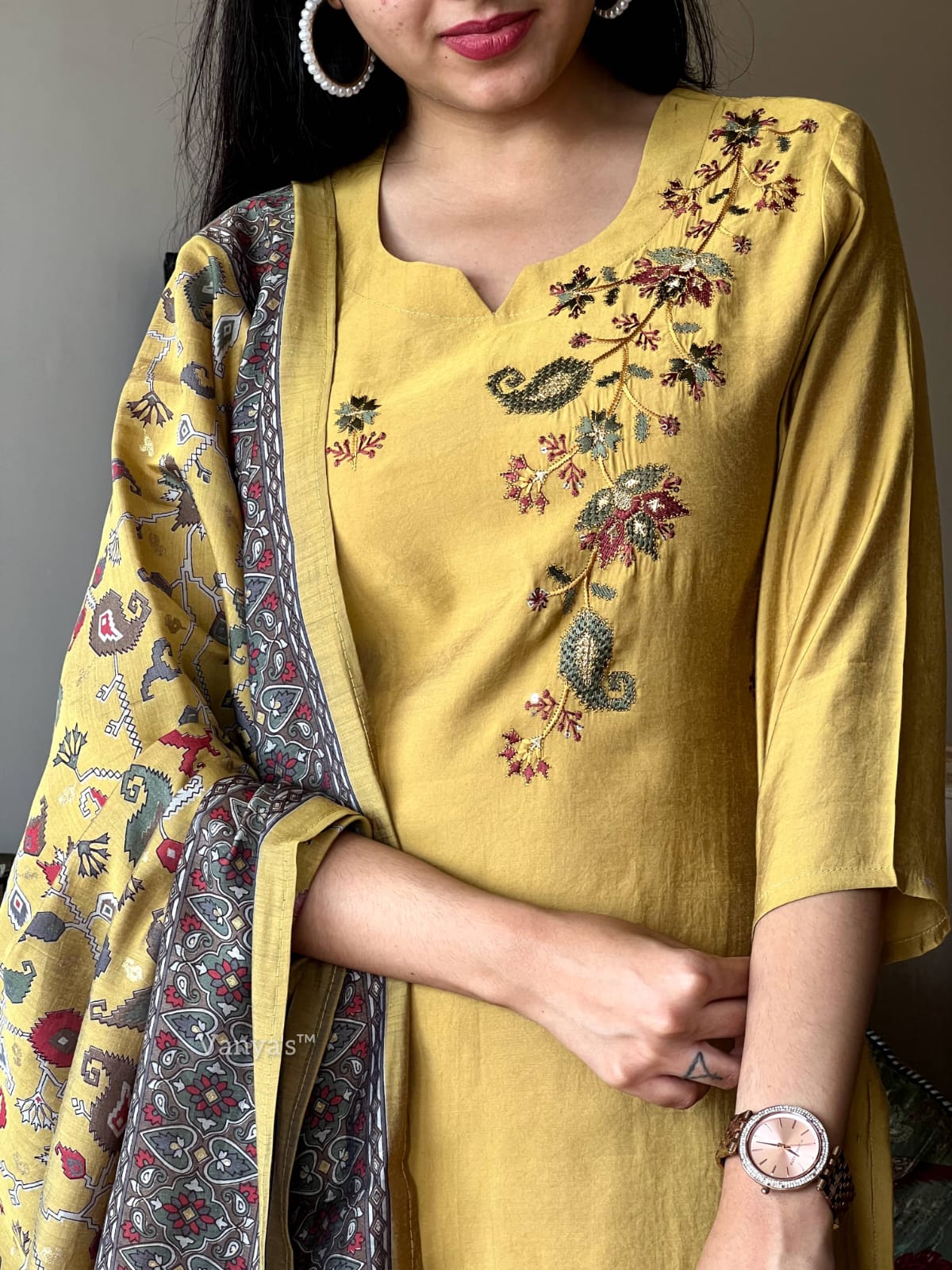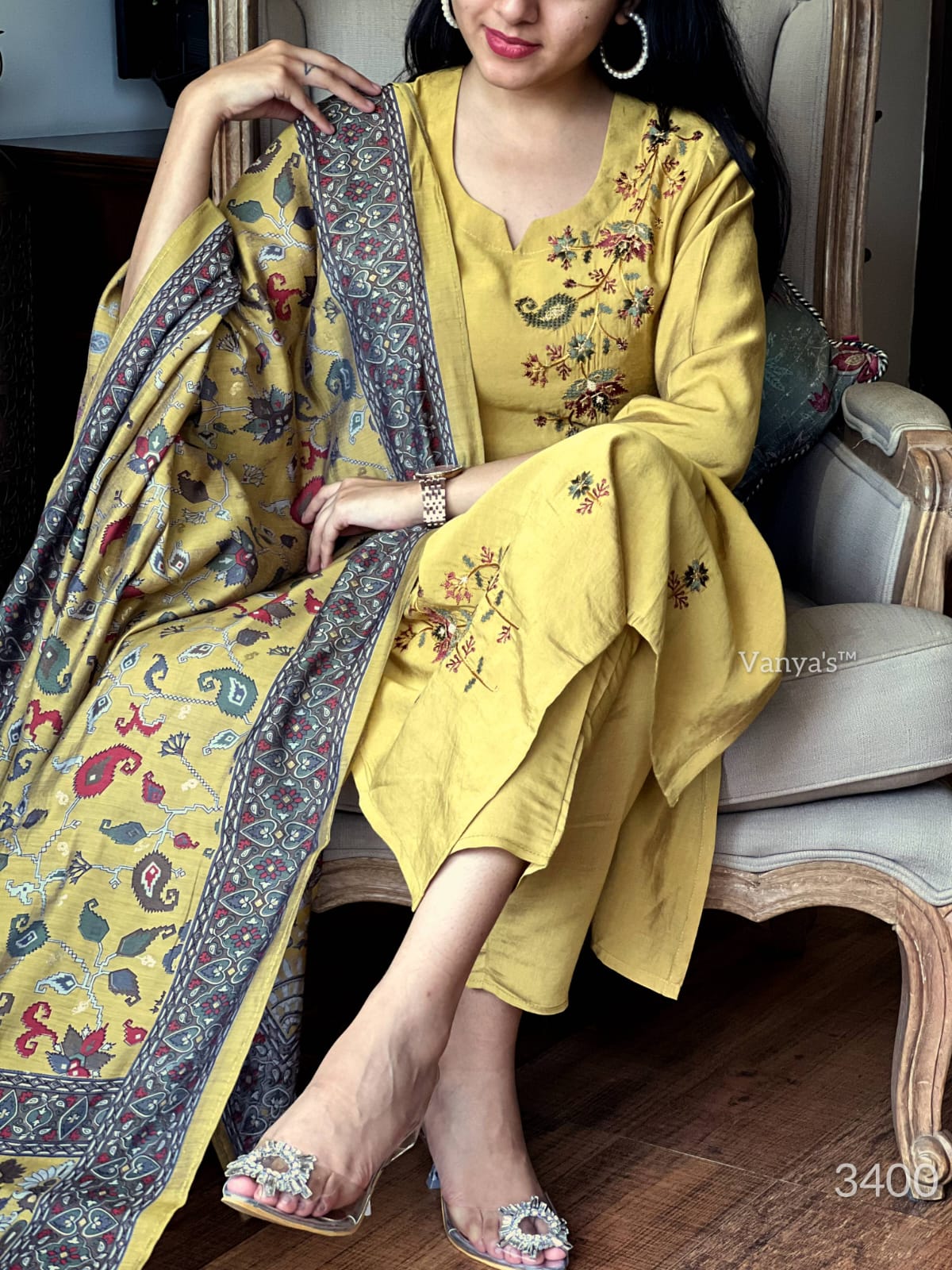 LOTUS dola silk elegant kurta is given an exquisite touch. Added Same printed very comfort dola silk fabric pant and paired with our MIL DYE Bombay printed chanderi silk duppata.