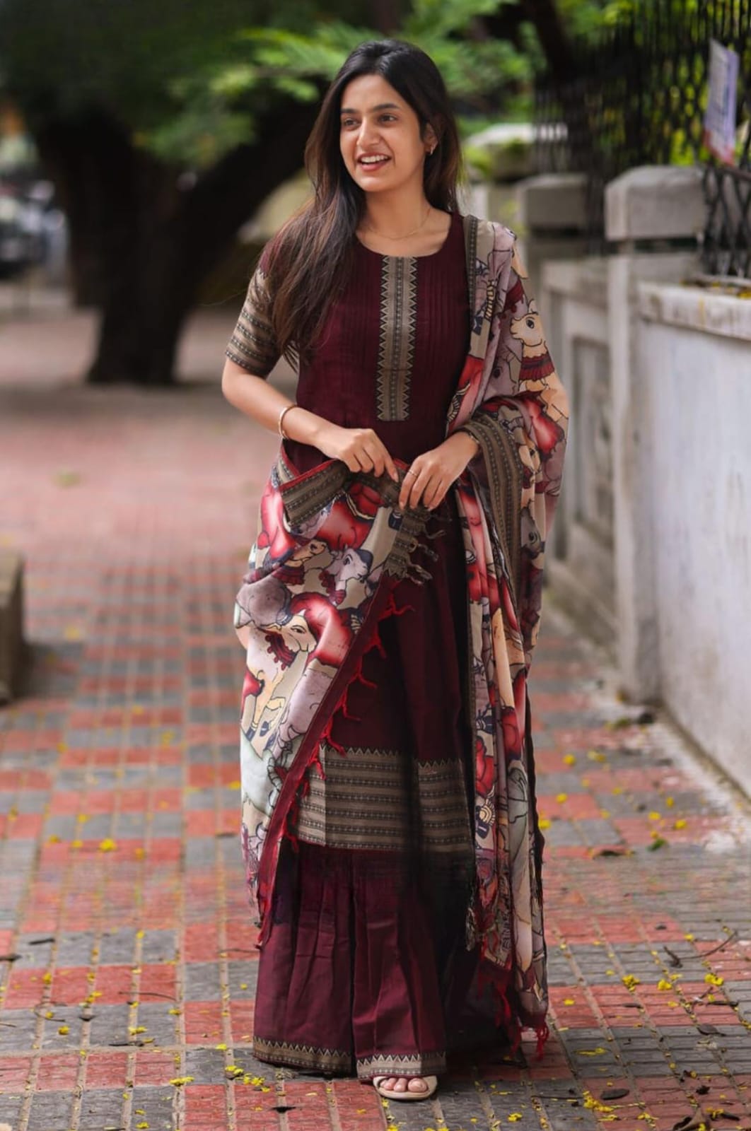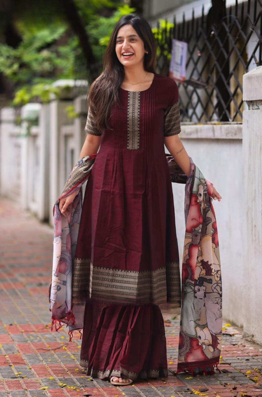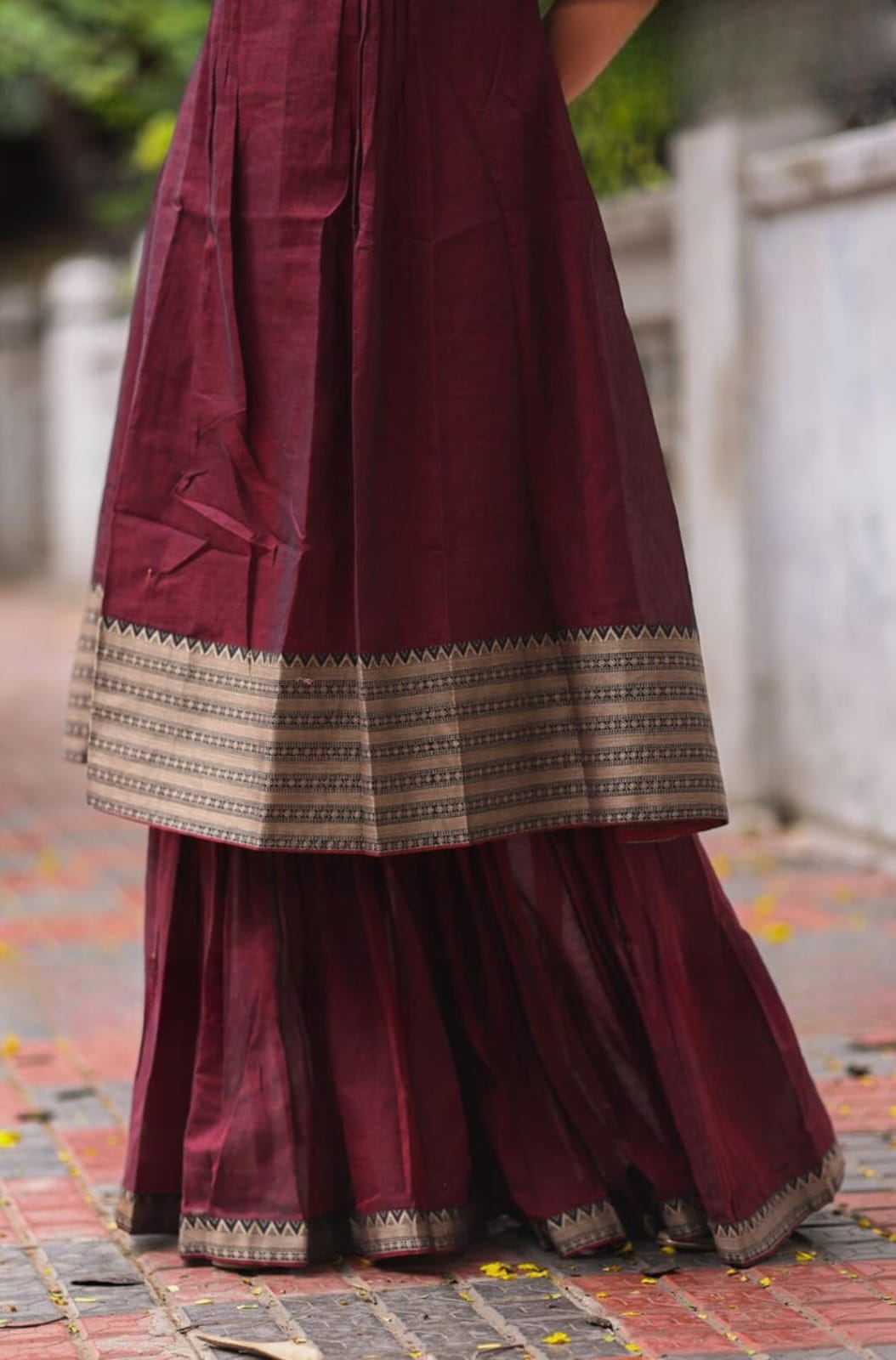 Crafted from lightweight fabric, This Maroon Pure handloom Sharara set is perfect for Casual and professional wear. It Features Detailed Pleating with a woven border on the yoke, sleeves, the edge of the dress, and the edge of the sharara. Pair this ensemble with a kalamkari-printed dupatta with a woven border on the edges and a thread tassel. Complete this look with minimal accessories.