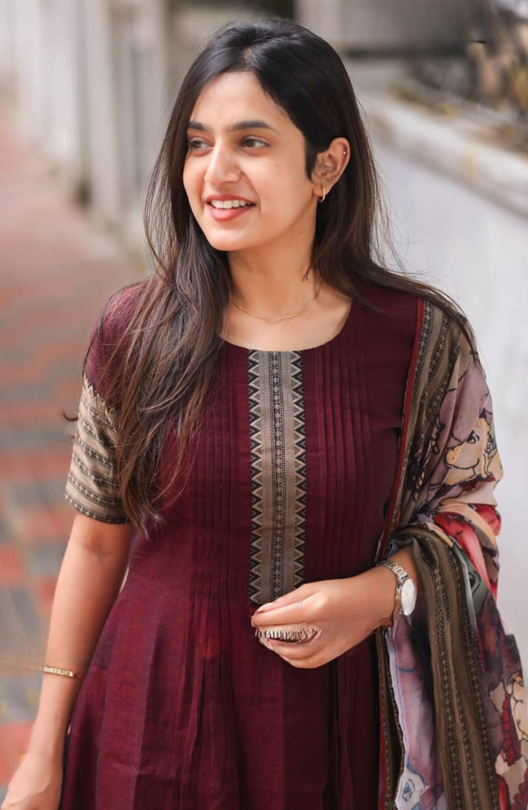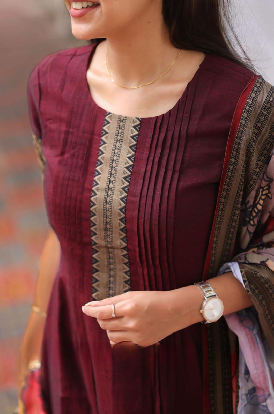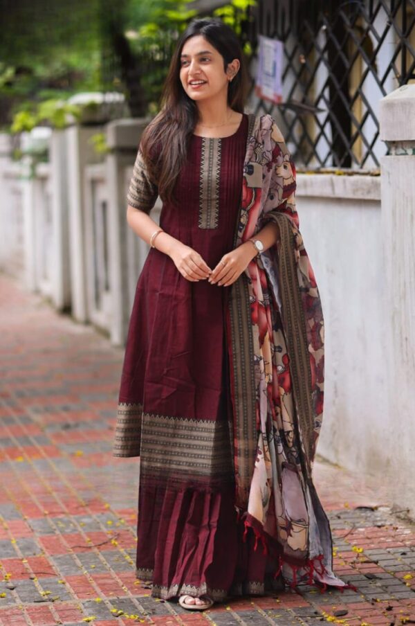 Crafted from lightweight fabric, This Maroon Pure handloom Sharara set is perfect for Casual and professional wear. It Features Detailed Pleating with a woven border on the yoke, sleeves, the edge of the dress, and the edge of the sharara. Pair this ensemble with a kalamkari-printed dupatta with a woven border on the edges and a thread tassel. Complete this look with minimal accessories.
