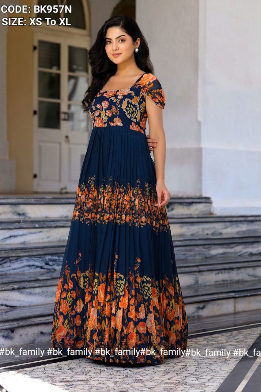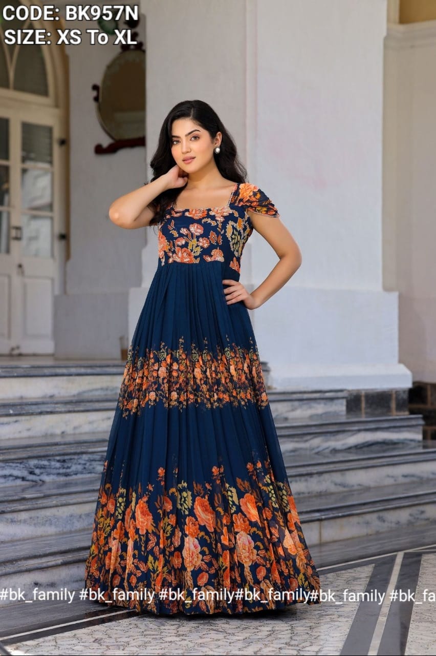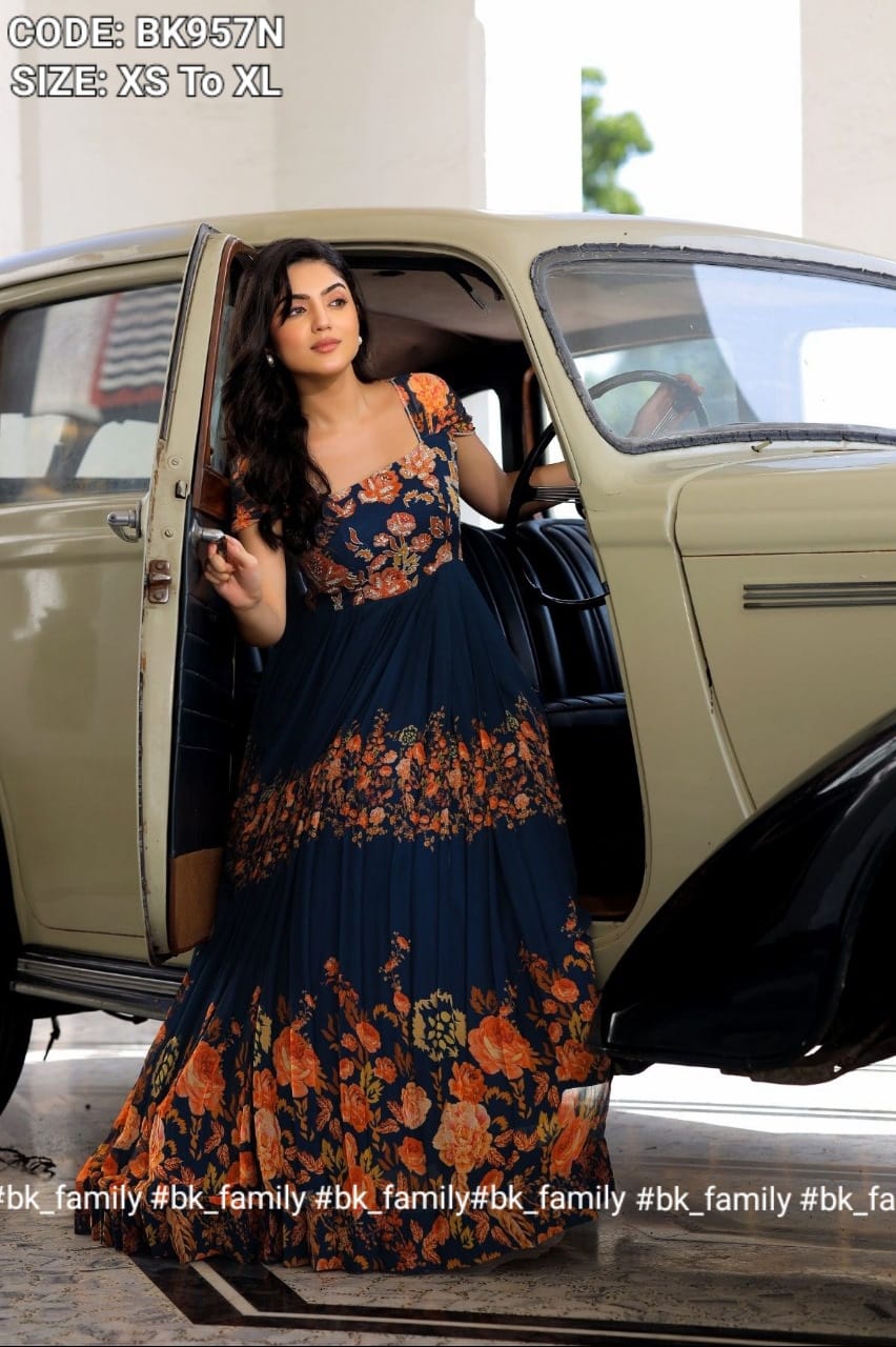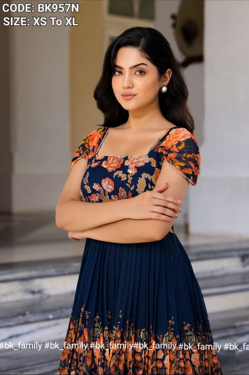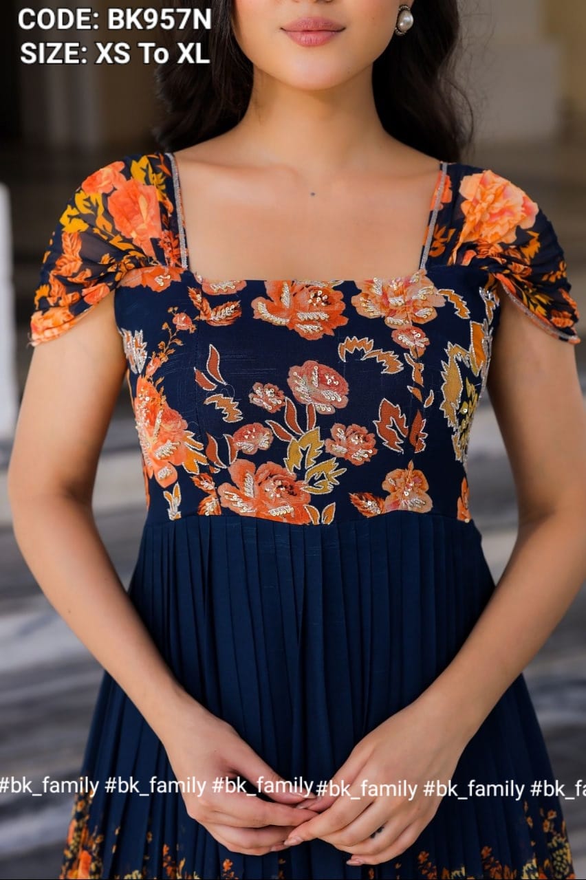 Presenting our new design: an elegant navy-blue dress adorned with intricate floral prints in vibrant shades of green, orange, and yellow. This dress features a square neckline and stylish sleeves that effortlessly elevate your look. The floral patterns are thoughtfully placed on the upper part and along the hemline, adding a touch of charm. Perfect for a grand outdoor setting, pair it with minimal pearl jewelry to create a look that is both refined and timeless.
