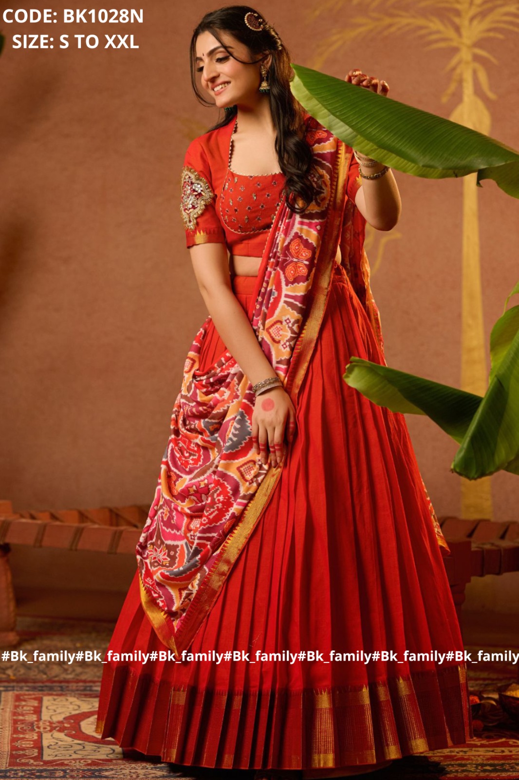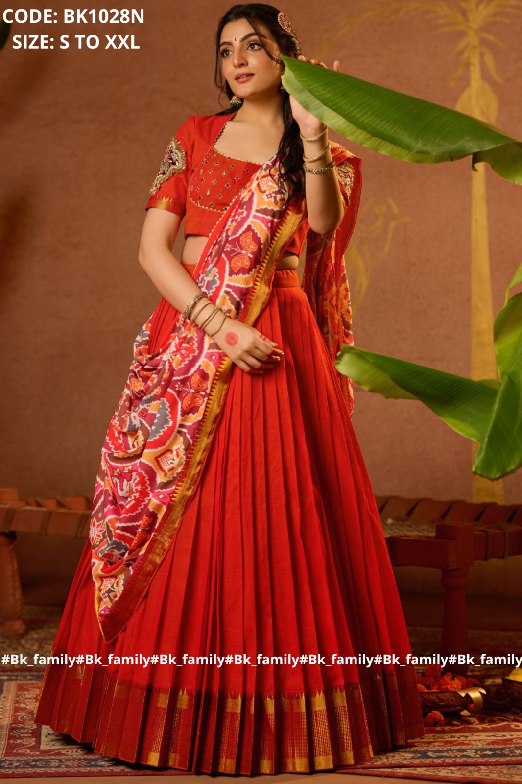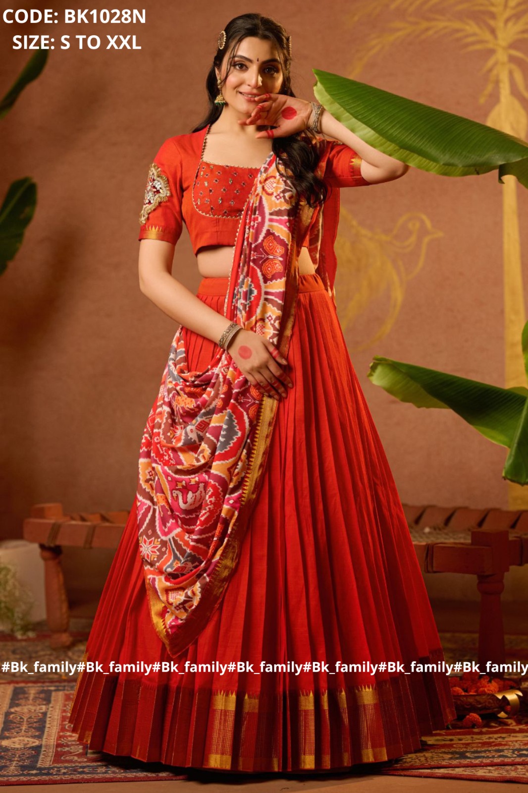 Introducing a gorgeous Nakshatra Lehenga Set in Bright Orange Color, a beautiful Madhubala blouse pattern with subtle mirror work, and creative aplic work on sleeves for traditional charm. Overall, the patola design of the dupatta with a 5-meter flare pleated skirt and a golden zari border for more grace and comfort. This traditional yet cultural lehenga voni will be perfect for Homely functions, traditional occasions, and pooja. As attire itself creates a traditional vibe.