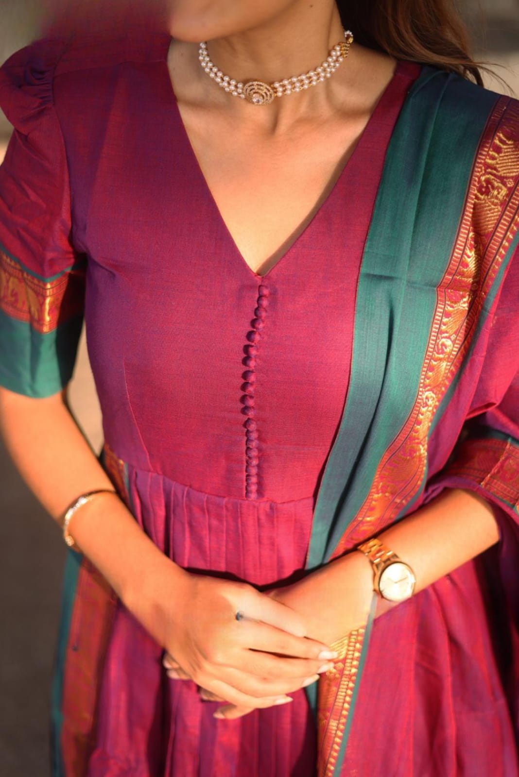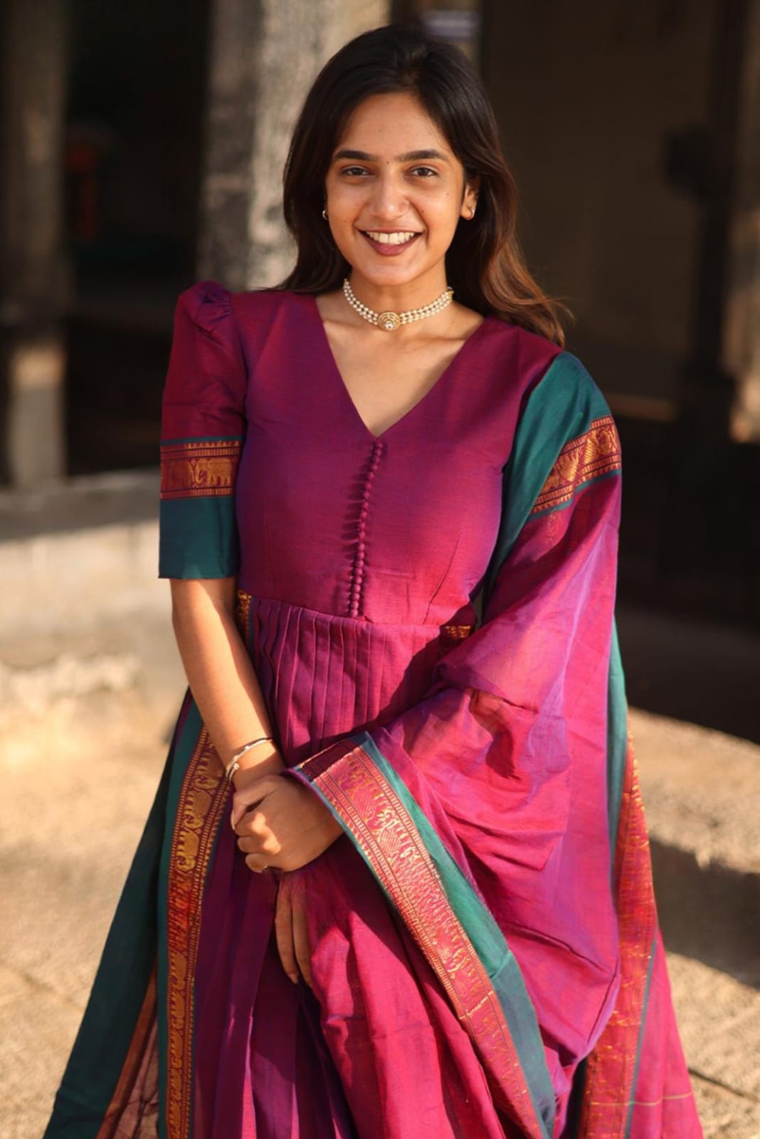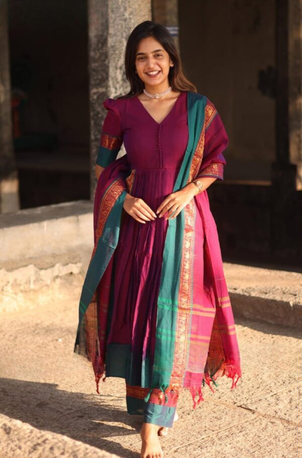 Look at this stunning yet beautiful Narthaki most comfortable and perfect kurta set has a vibrant Magenta color. It features a V-neckline and potli (fabric button) with a front gathering that ensures comfort while enhancing the dress’s movement, making this kurta set perfect for every body type. In this kurta set, the puffy sleeves, dupatta, and even bottom have the same contrast matching zari weaving of golden elephant motifs at the edge of the cotton handloom fabric. It adds a touch of casual and festive vibe and is also perfect for formal occasions. (Side Zip in dress and elastic with zip in the bottom)