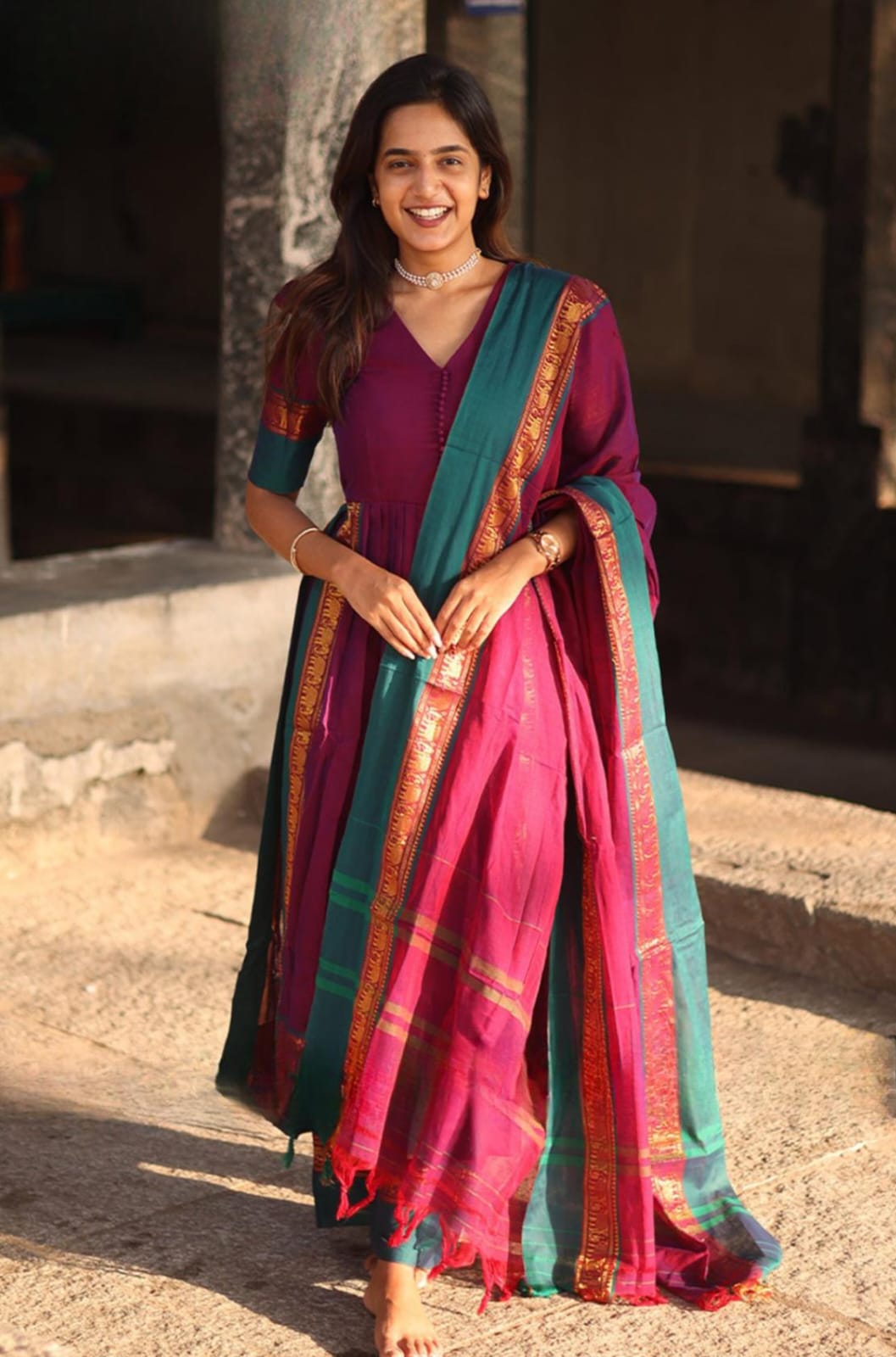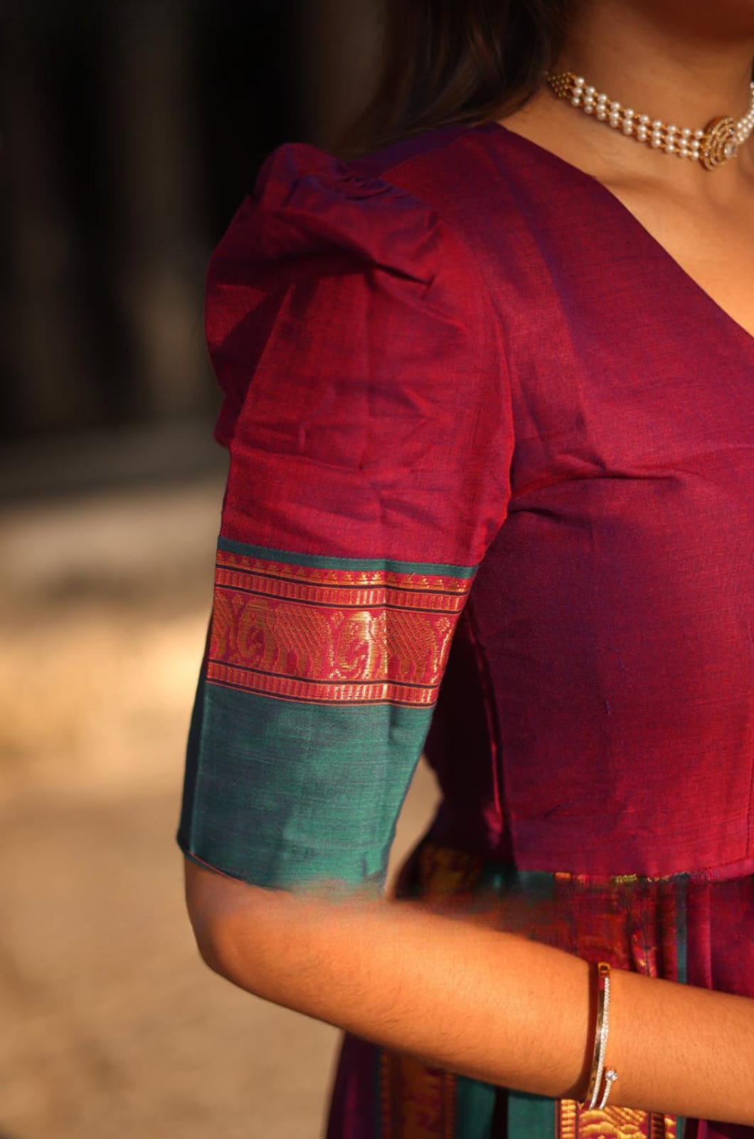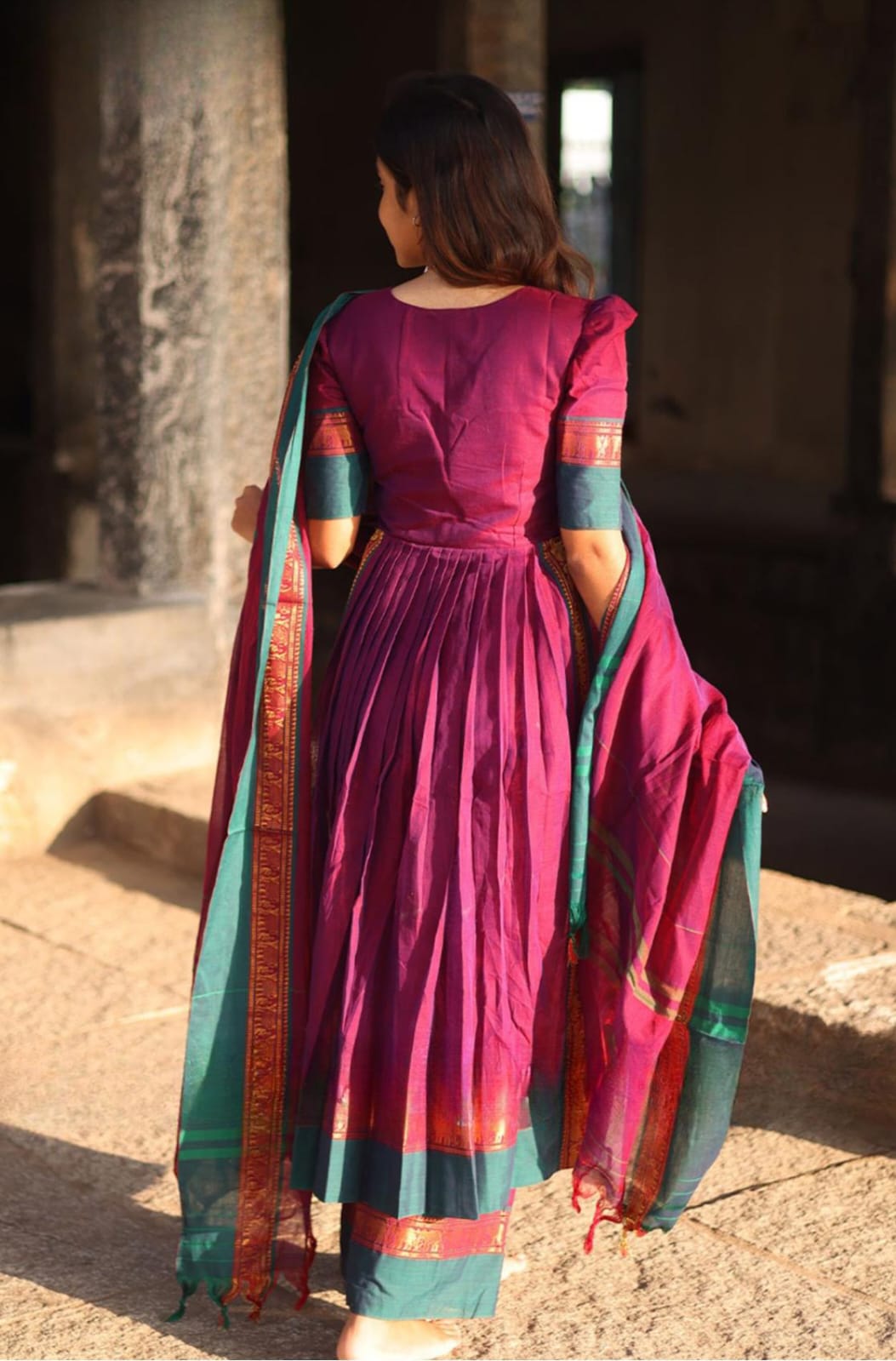 Look at this stunning yet beautiful Narthaki most comfortable and perfect kurta set has a vibrant Magenta color. It features a V-neckline and potli (fabric button) with a front gathering that ensures comfort while enhancing the dress’s movement, making this kurta set perfect for every body type. In this kurta set, the puffy sleeves, dupatta, and even bottom have the same contrast matching zari weaving of golden elephant motifs at the edge of the cotton handloom fabric. It adds a touch of casual and festive vibe and is also perfect for formal occasions. (Side Zip in dress and elastic with zip in the bottom)