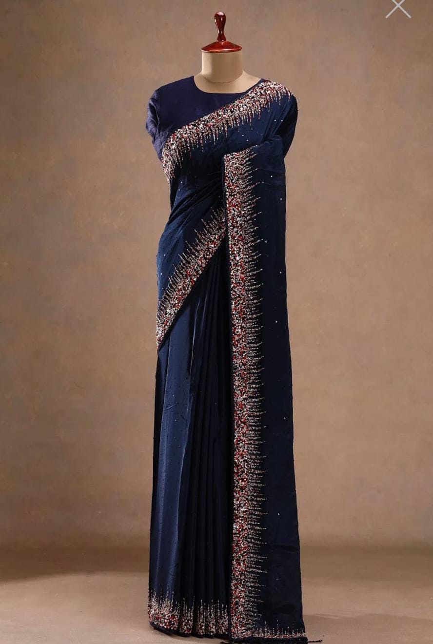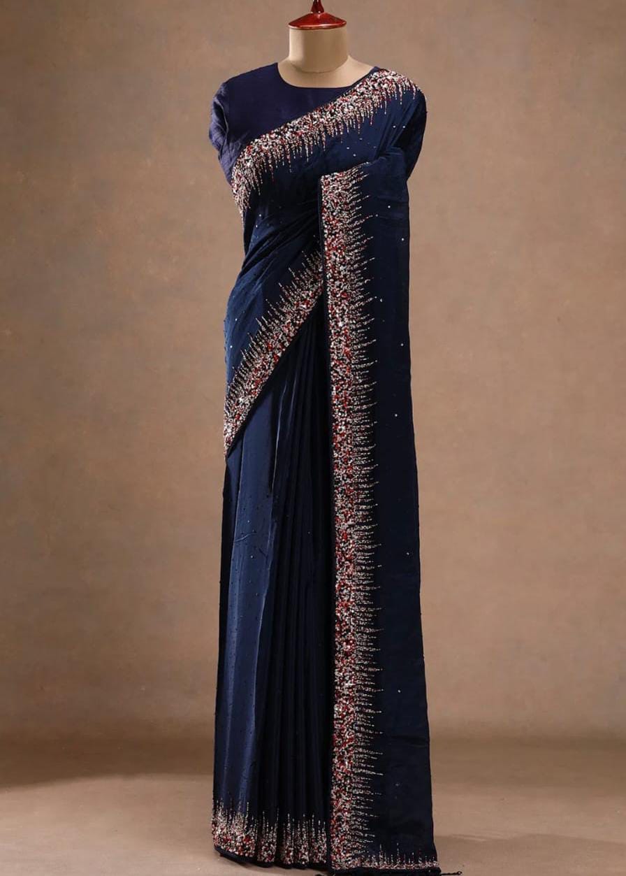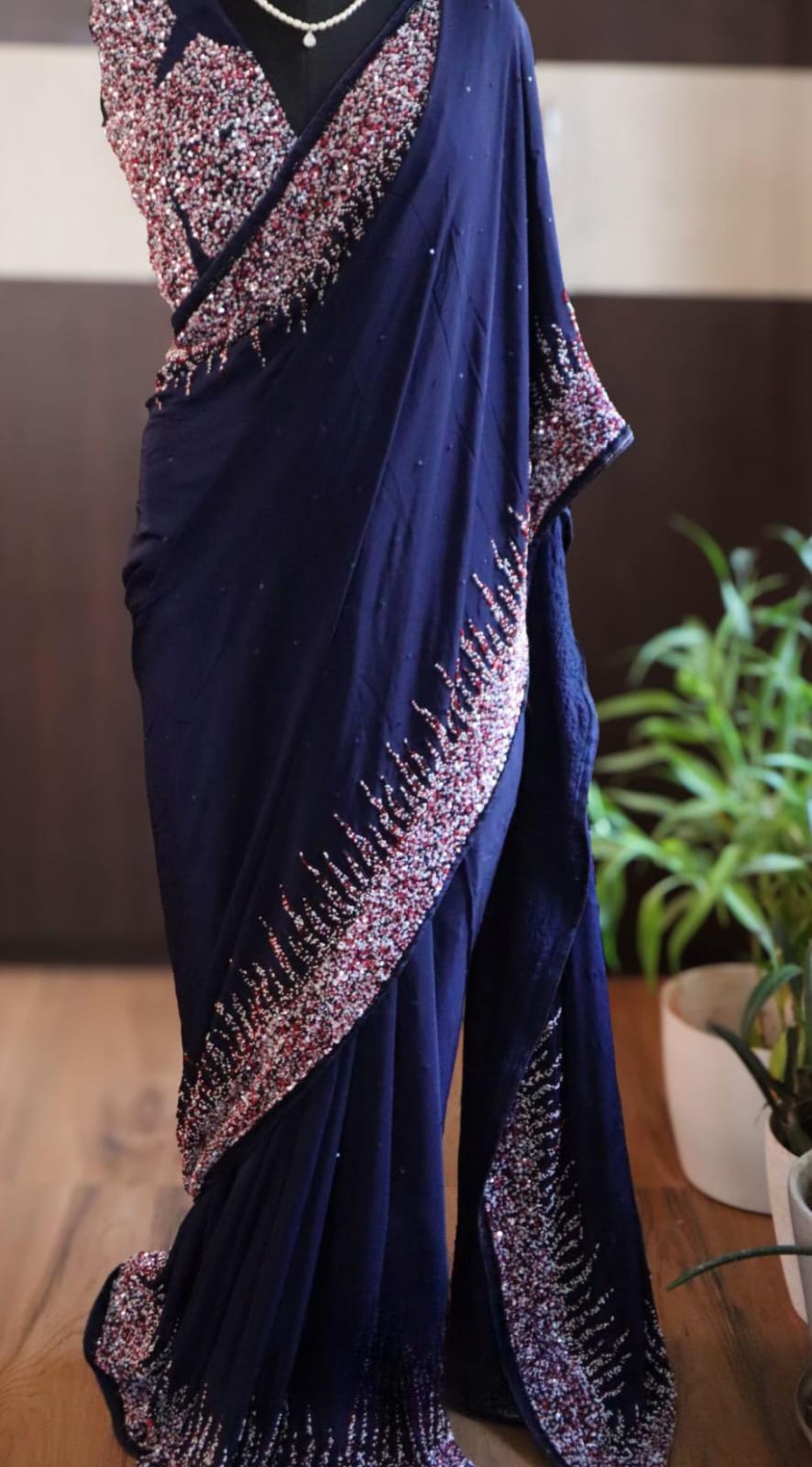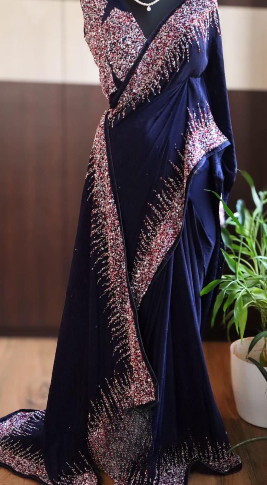 Navy Blue Sequins Embroidered Designer Crepe Saree