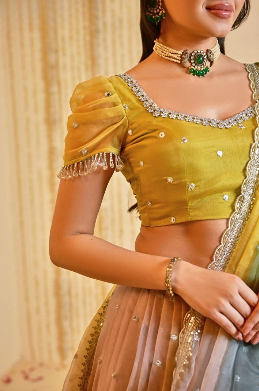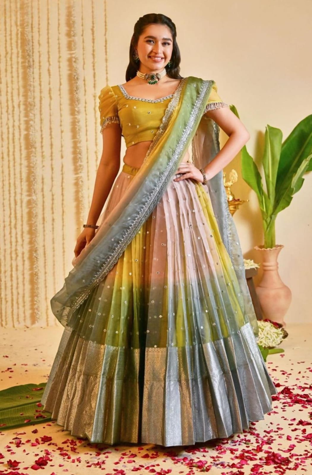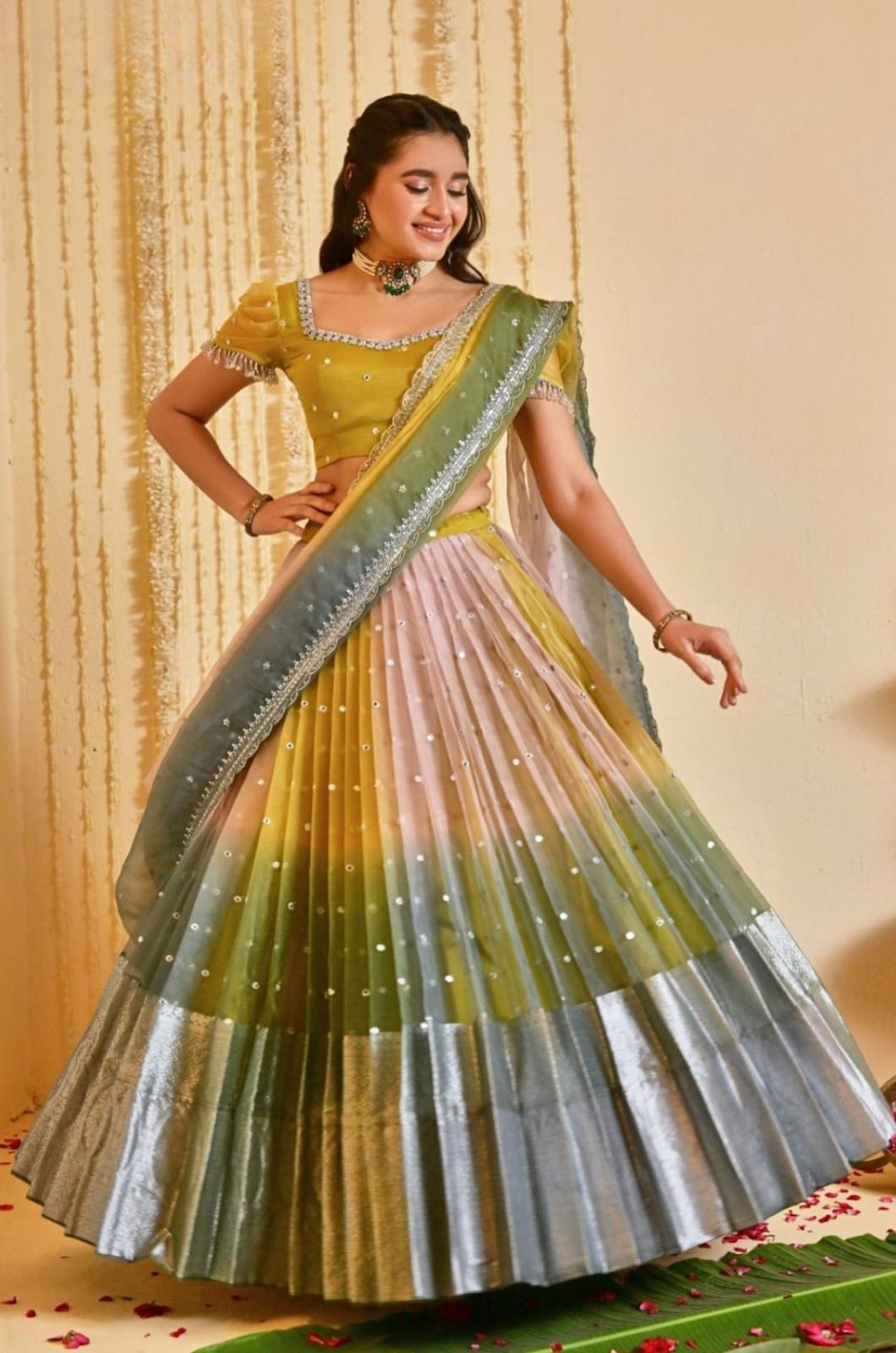 Turn every eye with this vibrant organza lehenga, glowing in gorgeous yellow with soft mehendi and peach shaded tones – made for festive hearts and grand occasions.The lehenga features a flowy 5.5-meter flair, highlighted with sparkling mirror work and a rich zari border that adds a touch of regal grace. The matching organza blouse is styled with trendy puff sleeves, mirror detailing, delicate diamond lace, and playful hanging latkans – giving it a perfect balance of tradition and charm.The 3-meter dupatta is finished with elegant embroidery and beautiful latkans, completing the set with flair. Styled in a fashionable co-ord pattern, this outfit is ideal for weddings, mehendi functions, sangeets, receptions, and festive get-togethers.Bright, beautiful, and made to shine – this lehenga is your perfect festive pick!