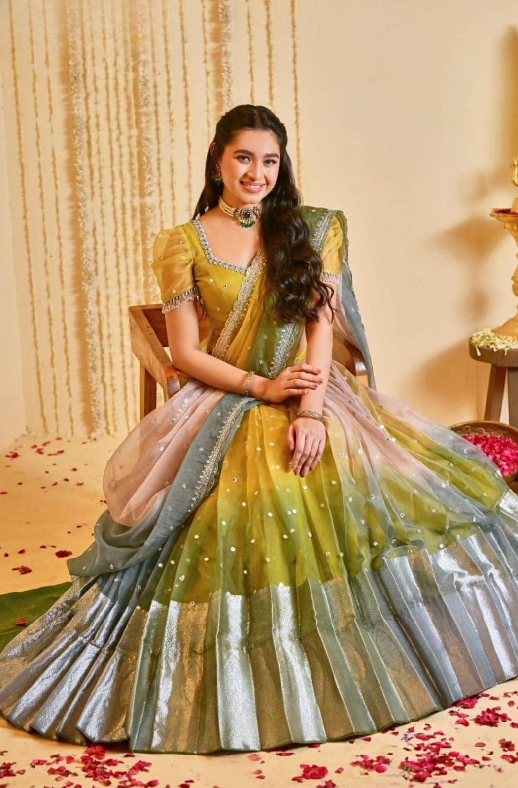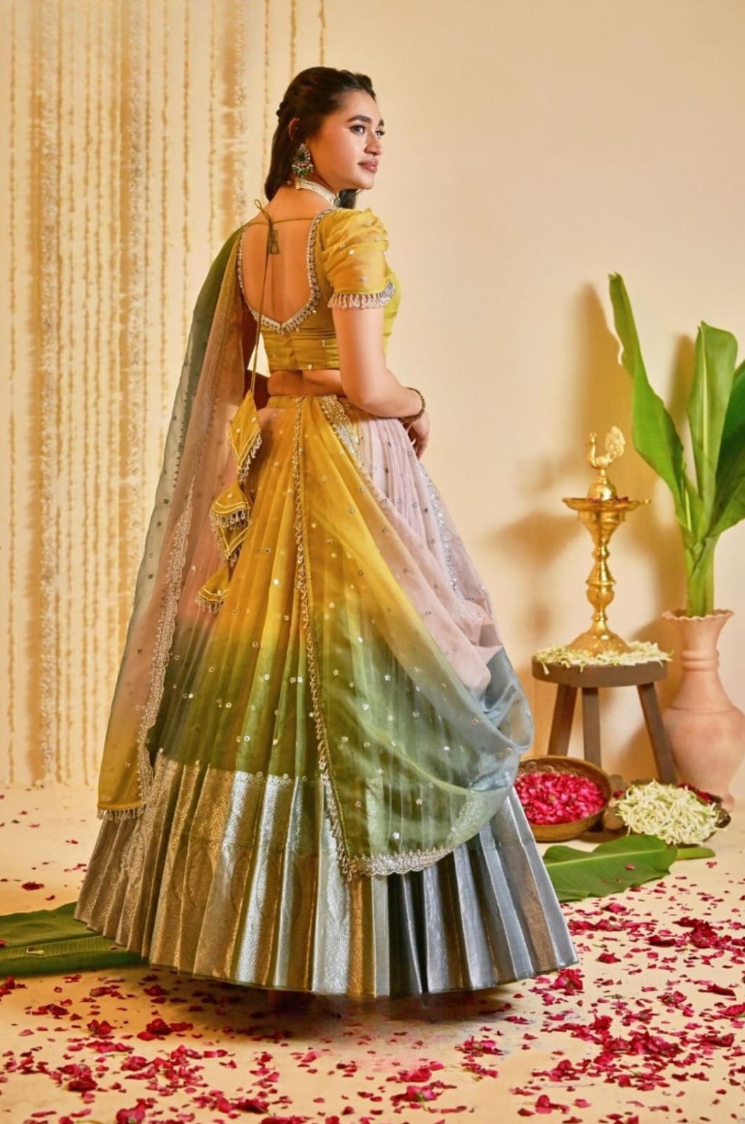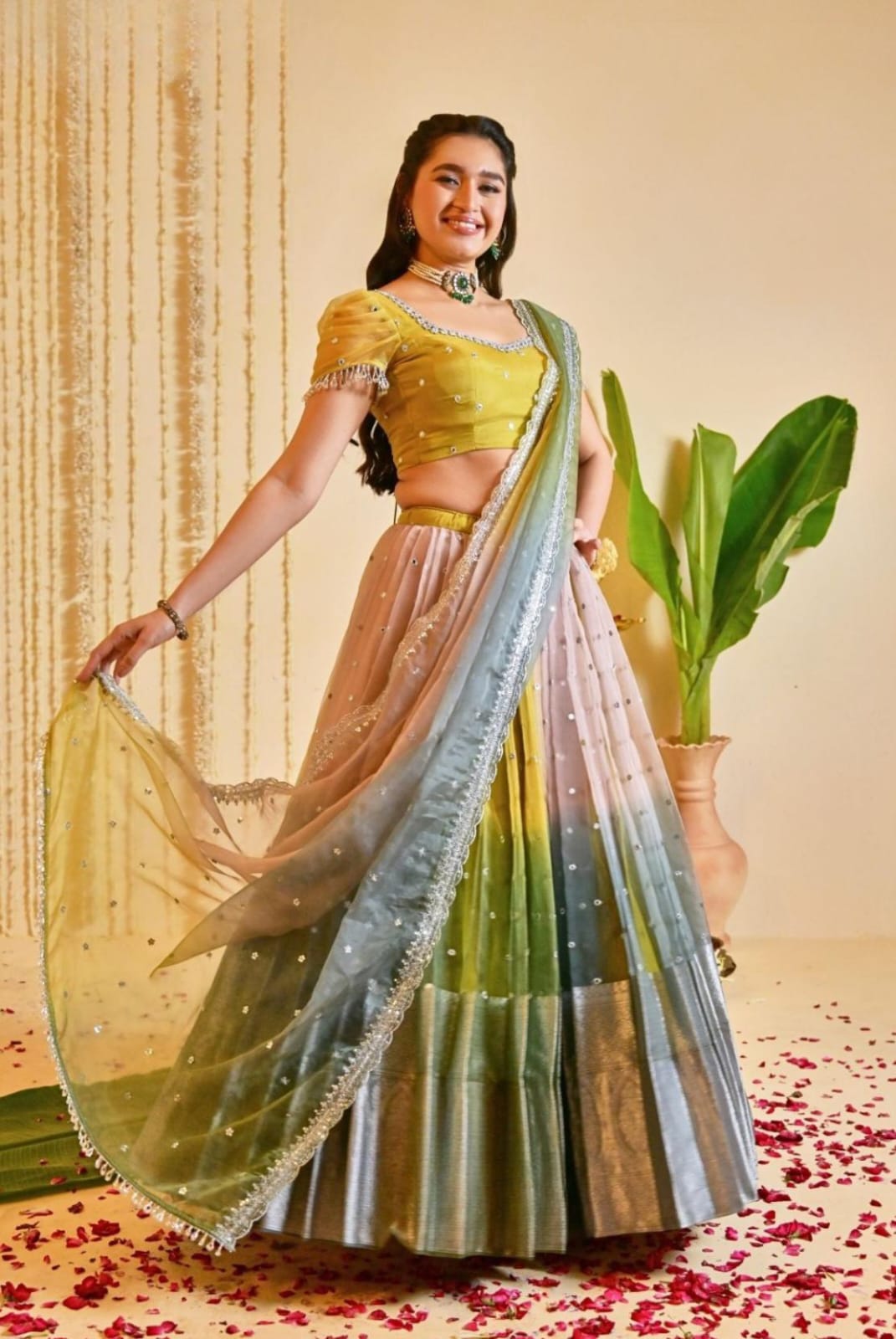 Turn every eye with this vibrant organza lehenga, glowing in gorgeous yellow with soft mehendi and peach shaded tones – made for festive hearts and grand occasions.The lehenga features a flowy 5.5-meter flair, highlighted with sparkling mirror work and a rich zari border that adds a touch of regal grace. The matching organza blouse is styled with trendy puff sleeves, mirror detailing, delicate diamond lace, and playful hanging latkans – giving it a perfect balance of tradition and charm.The 3-meter dupatta is finished with elegant embroidery and beautiful latkans, completing the set with flair. Styled in a fashionable co-ord pattern, this outfit is ideal for weddings, mehendi functions, sangeets, receptions, and festive get-togethers.Bright, beautiful, and made to shine – this lehenga is your perfect festive pick!