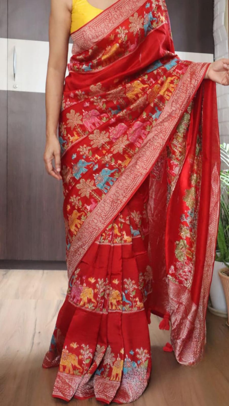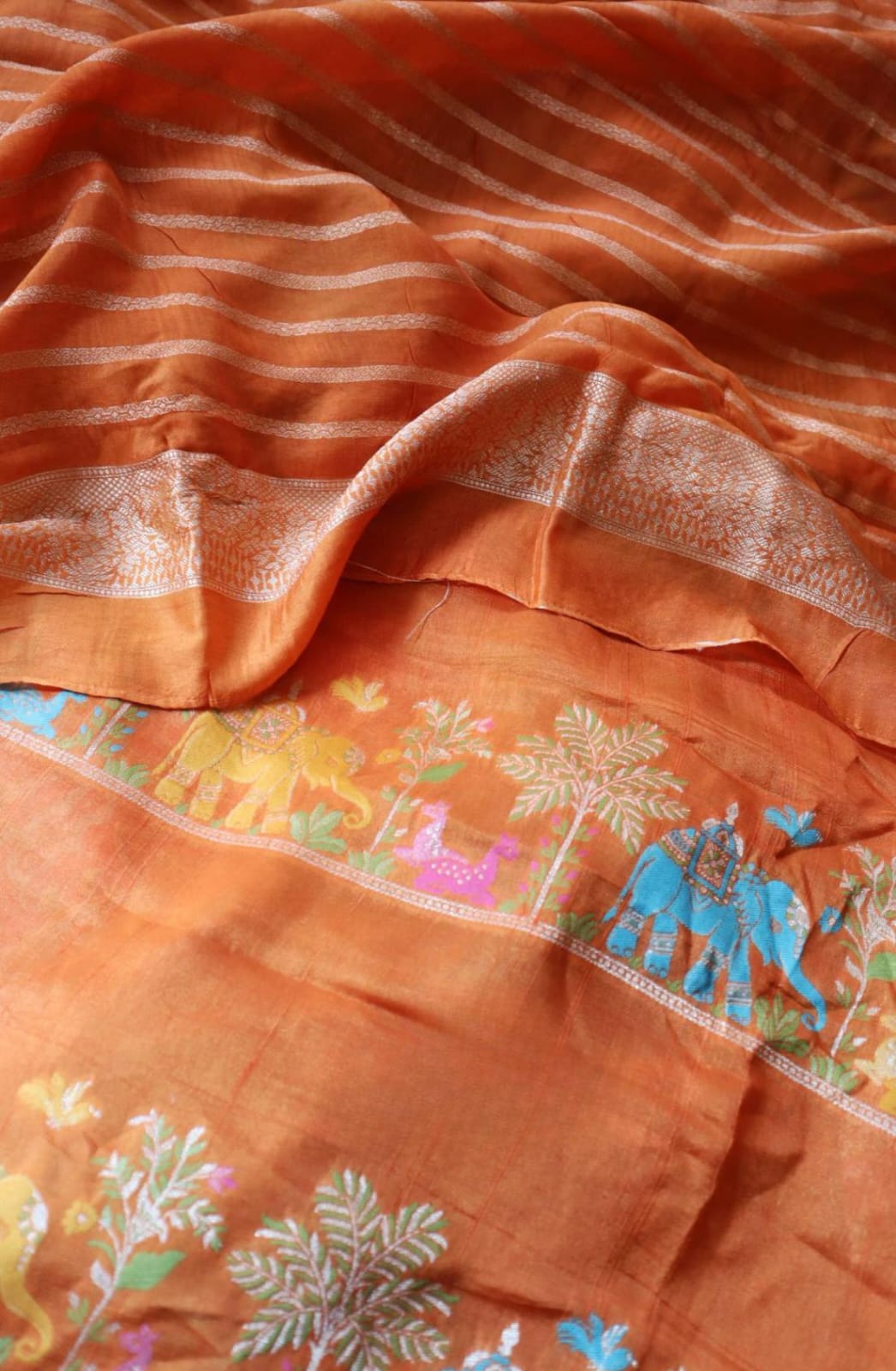 Exquisite shikargah parallel weaves on this elegant pure tussar silk saree, bringing timeless beauty to every drape