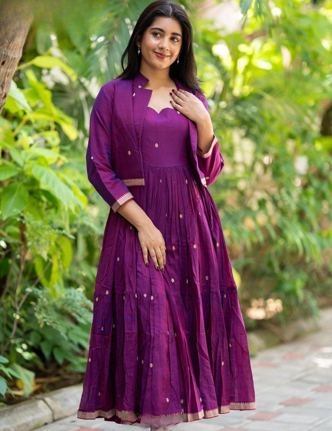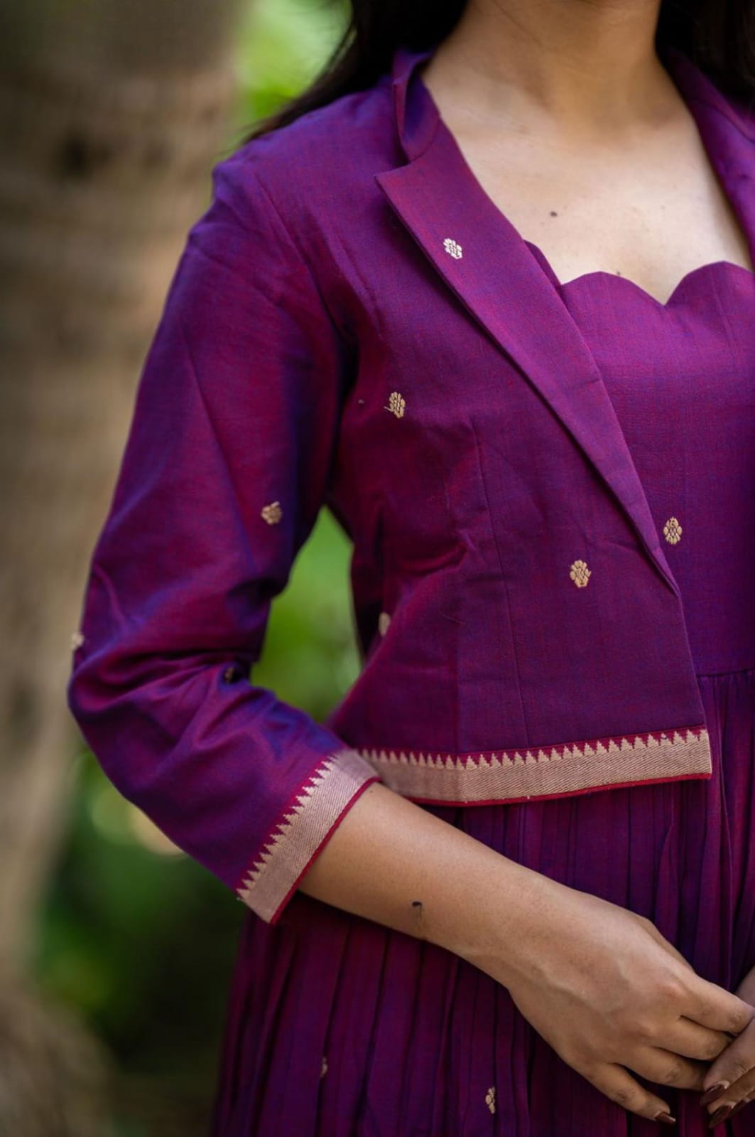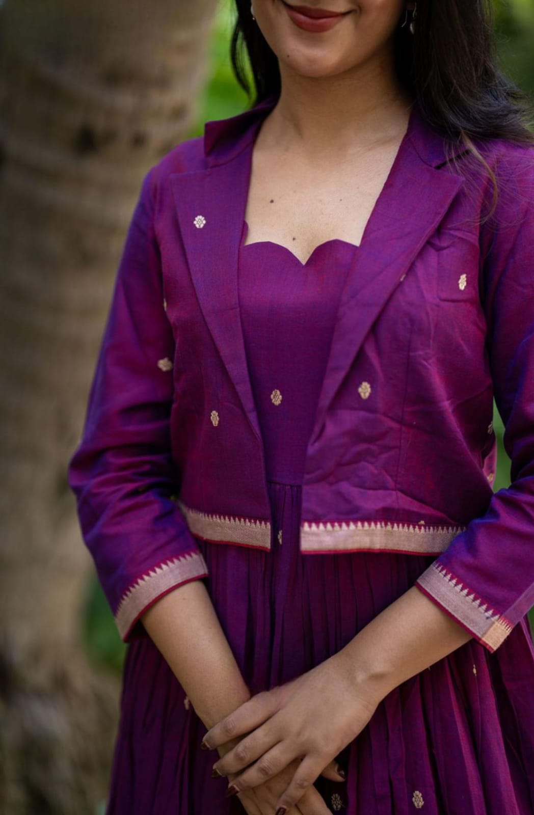 Elevate your ethnic wardrobe with this elegant handloom dress ensemble, designed for both comfort and timeless style. Crafted from rich handloom fabric, this outfit features a deep plum/Magenta flared dress adorned with subtle golden polka-style embellishments, adding a touch of festive charm. The dress boasts a scalloped sweetheart neckline, perfectly balancing modern aesthetics with traditional craftsmanship. Paired with a matching handloom jacket, this ensemble adds sophistication with its 3/4th length sleeves, delicate zari-like border on the hem, and minimal detailing to keep the look clean yet refined. Perfect for festive gatherings, cultural events, or casual celebrations, this set promises a graceful silhouette while keeping you rooted in traditional weaves.