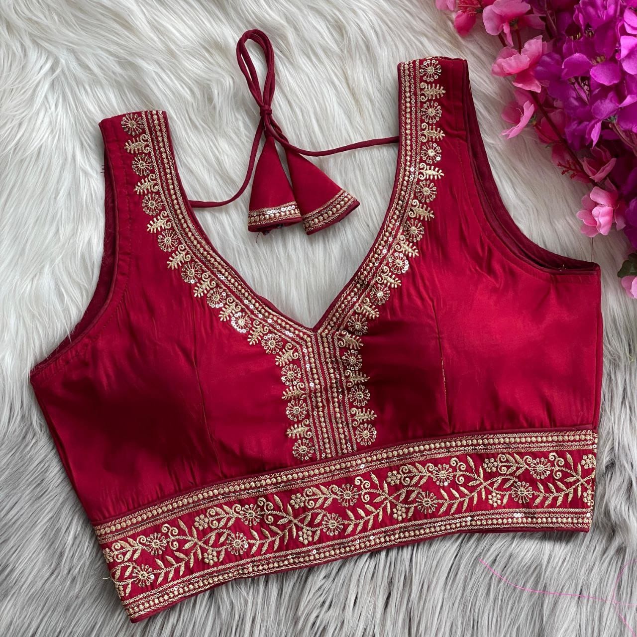 The blouse is nicely finished with rainbow sequin work, thread embroidery, and