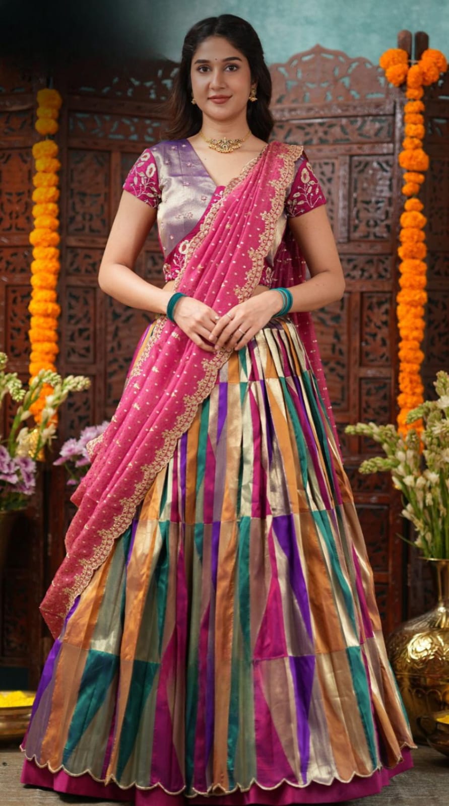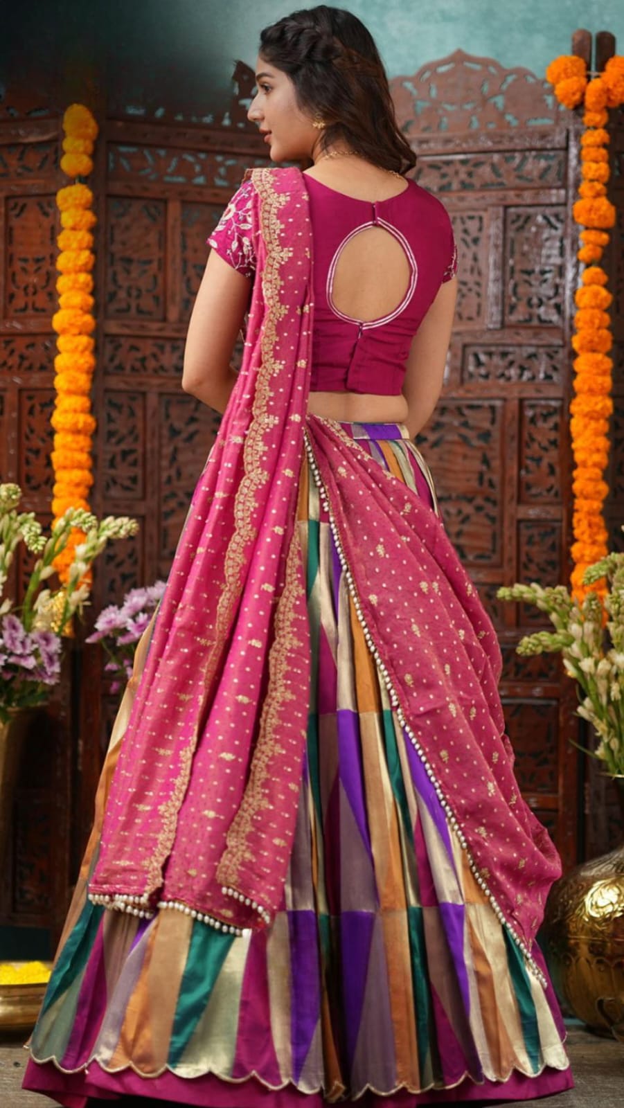 Speciality: Geometric, multicoloured zari-work lehenga with a refined, rich, contemporary look.