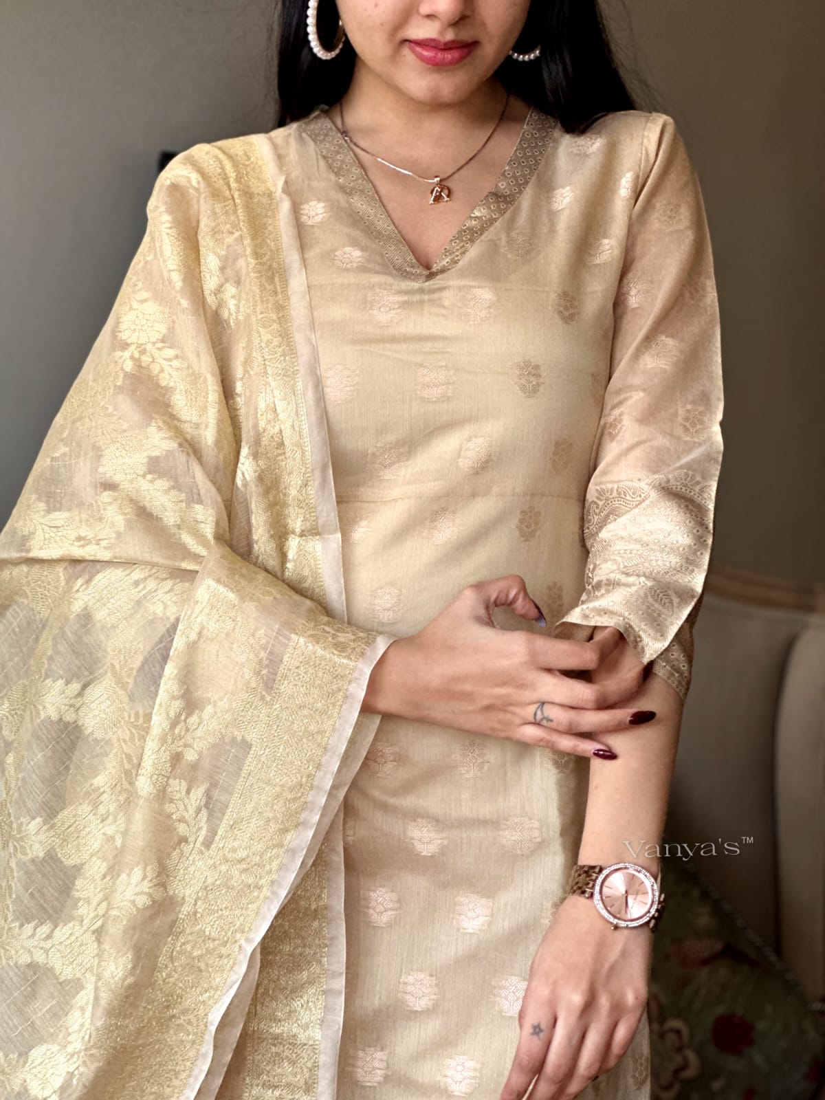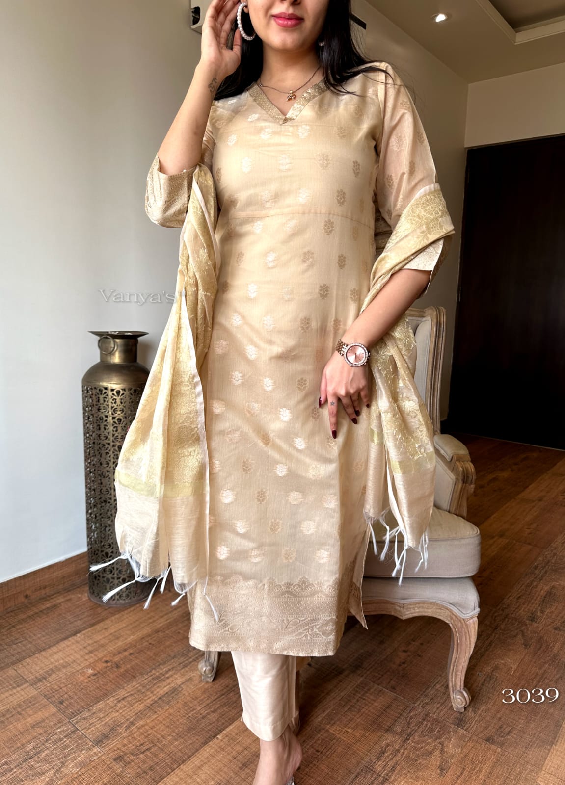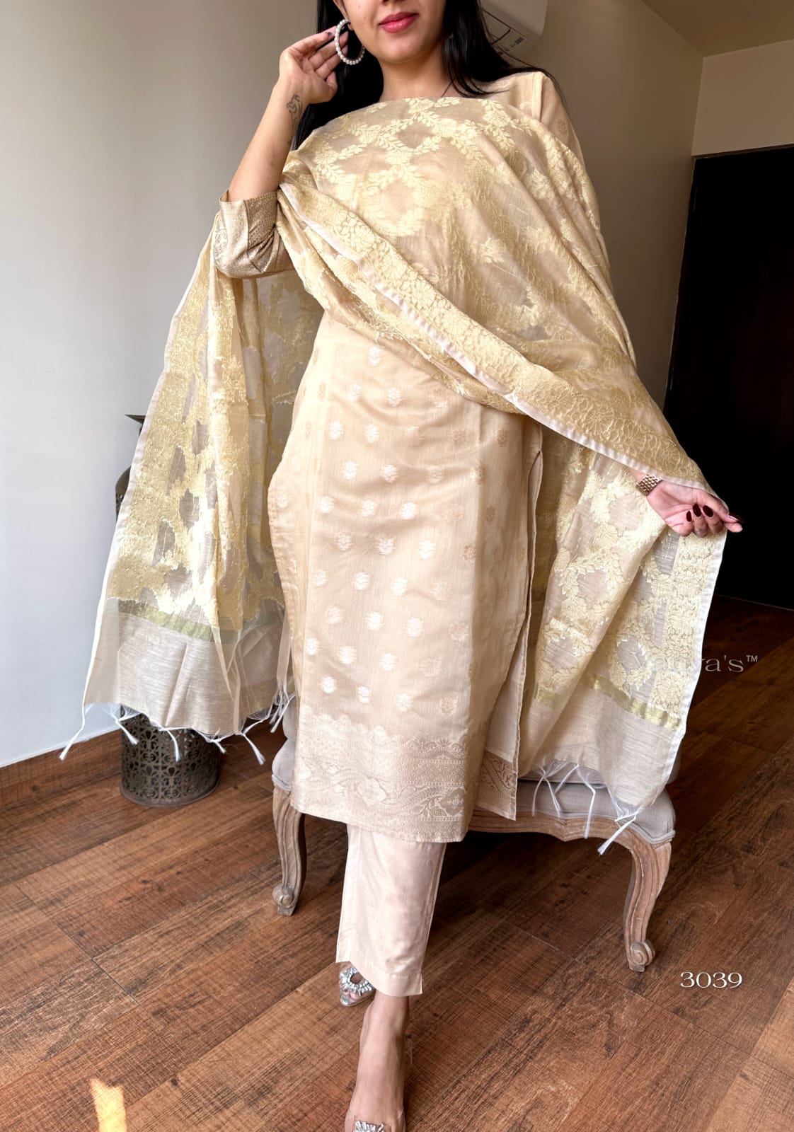 Elegant pure banarsi silk jacquard self zari thread banarsi suits are evergreen and must’ve in your wardrobe, so don’t forget to invest in this sophisticated design. This Suit Set is beautifully crafted It is paired with matching silk pant and pure heavy banarsi self zari jacquard duppata.