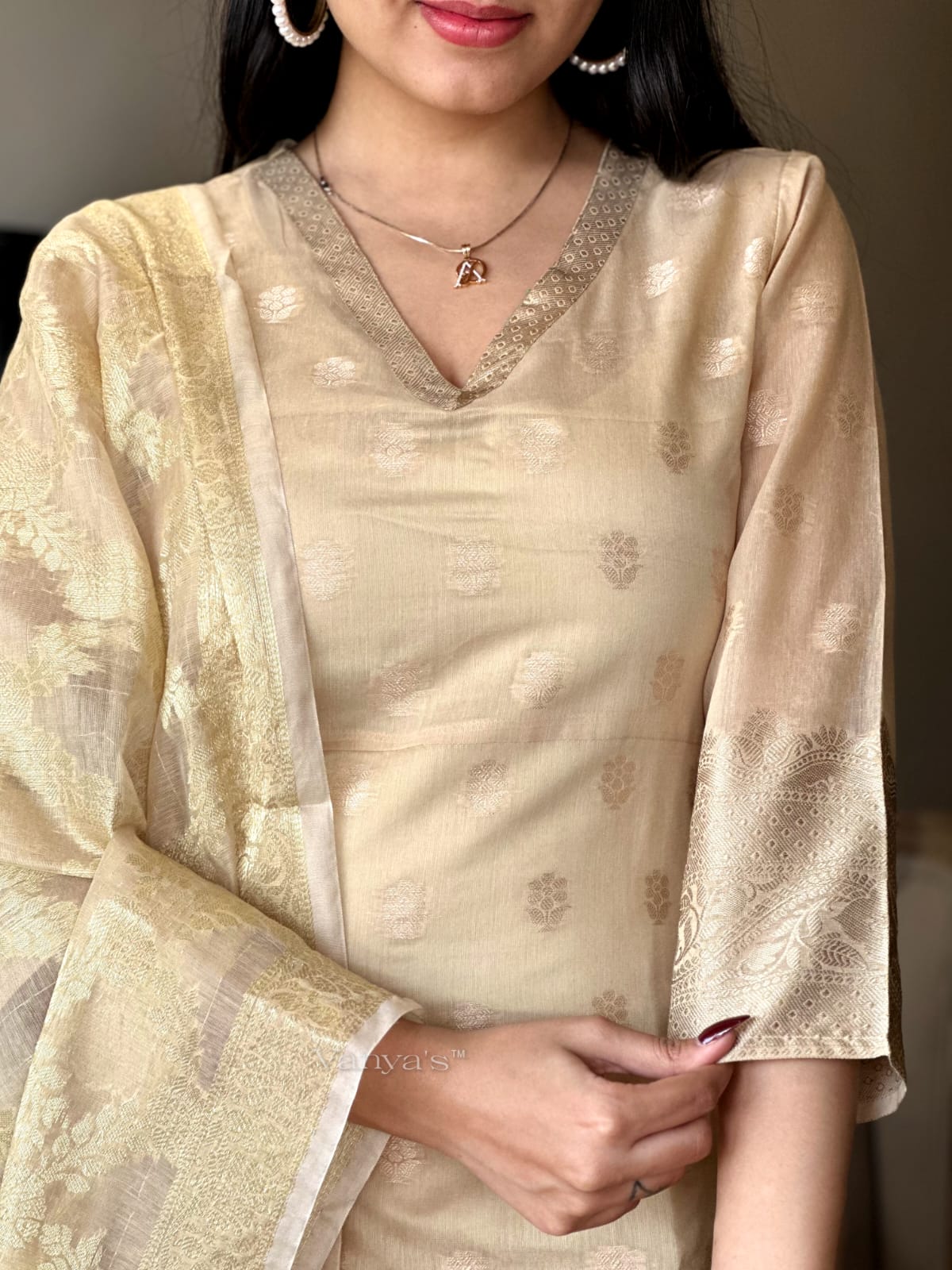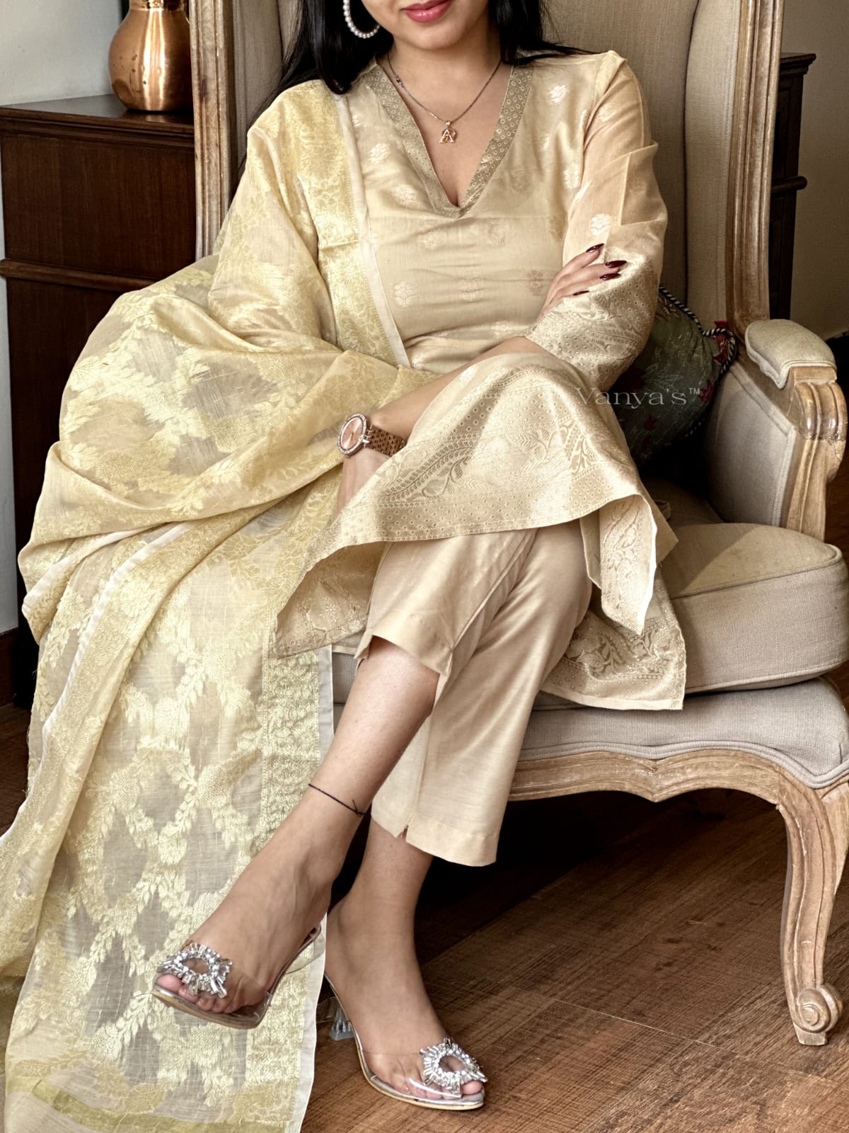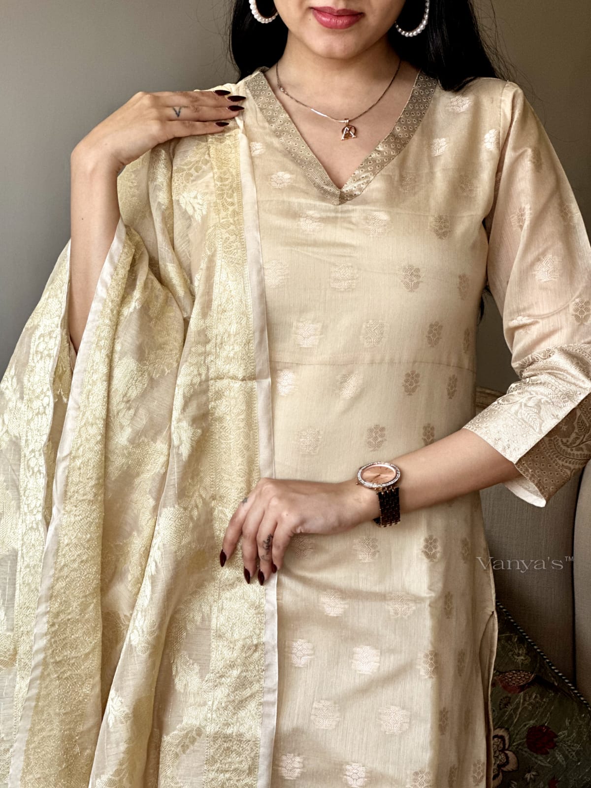 Elegant pure banarsi silk jacquard self zari thread banarsi suits are evergreen and must’ve in your wardrobe, so don’t forget to invest in this sophisticated design. This Suit Set is beautifully crafted It is paired with matching silk pant and pure heavy banarsi self zari jacquard duppata.