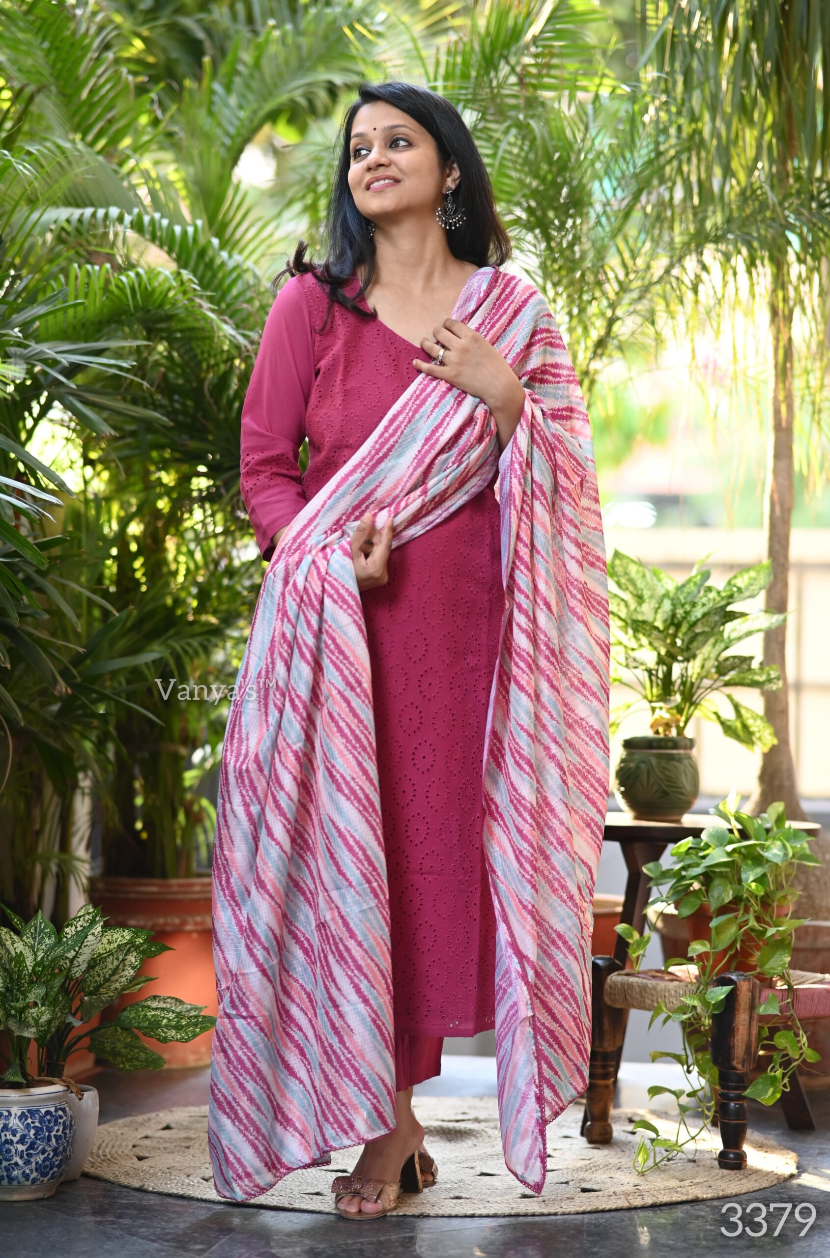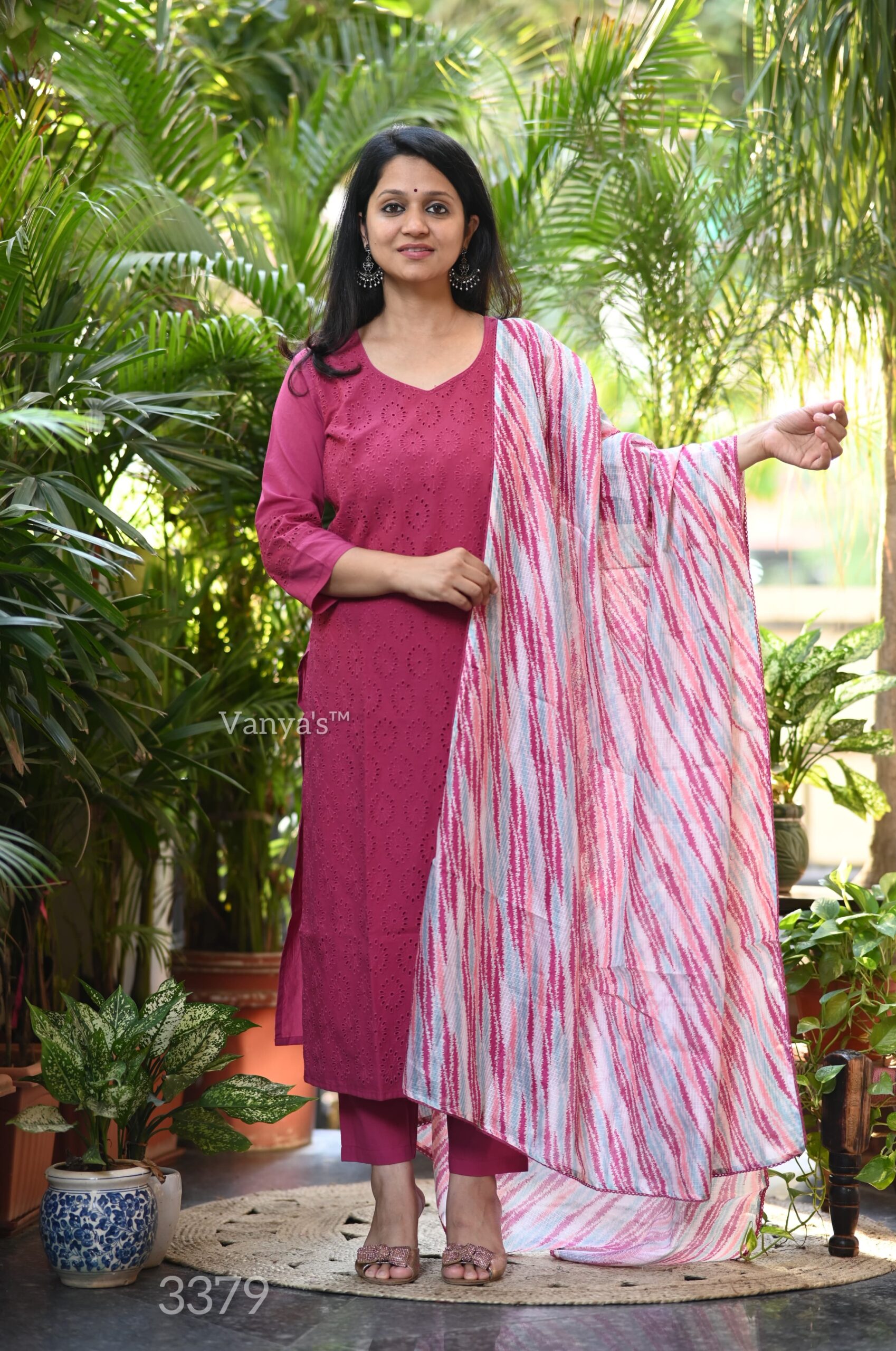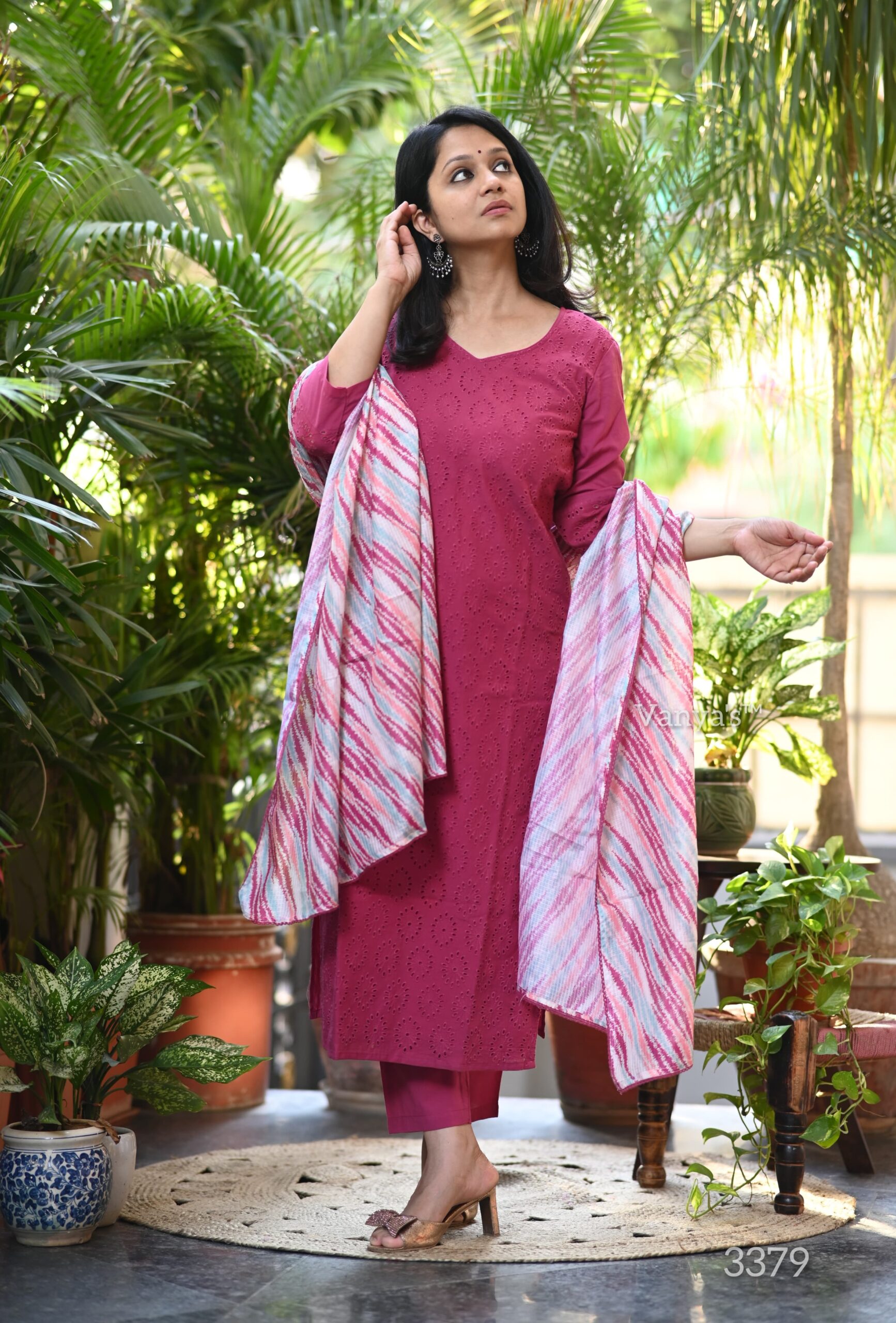 Effortless, lightweight, and breathable, our Gulaabi pink schifflie suit set is everything you need from an outfit!
