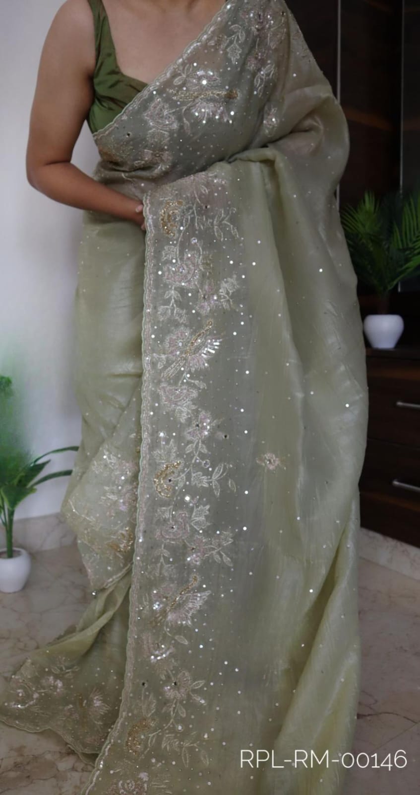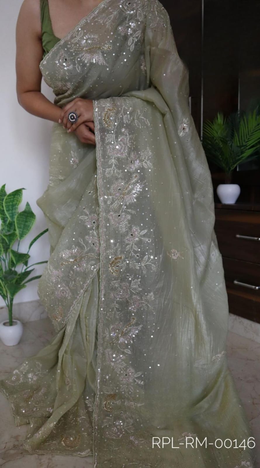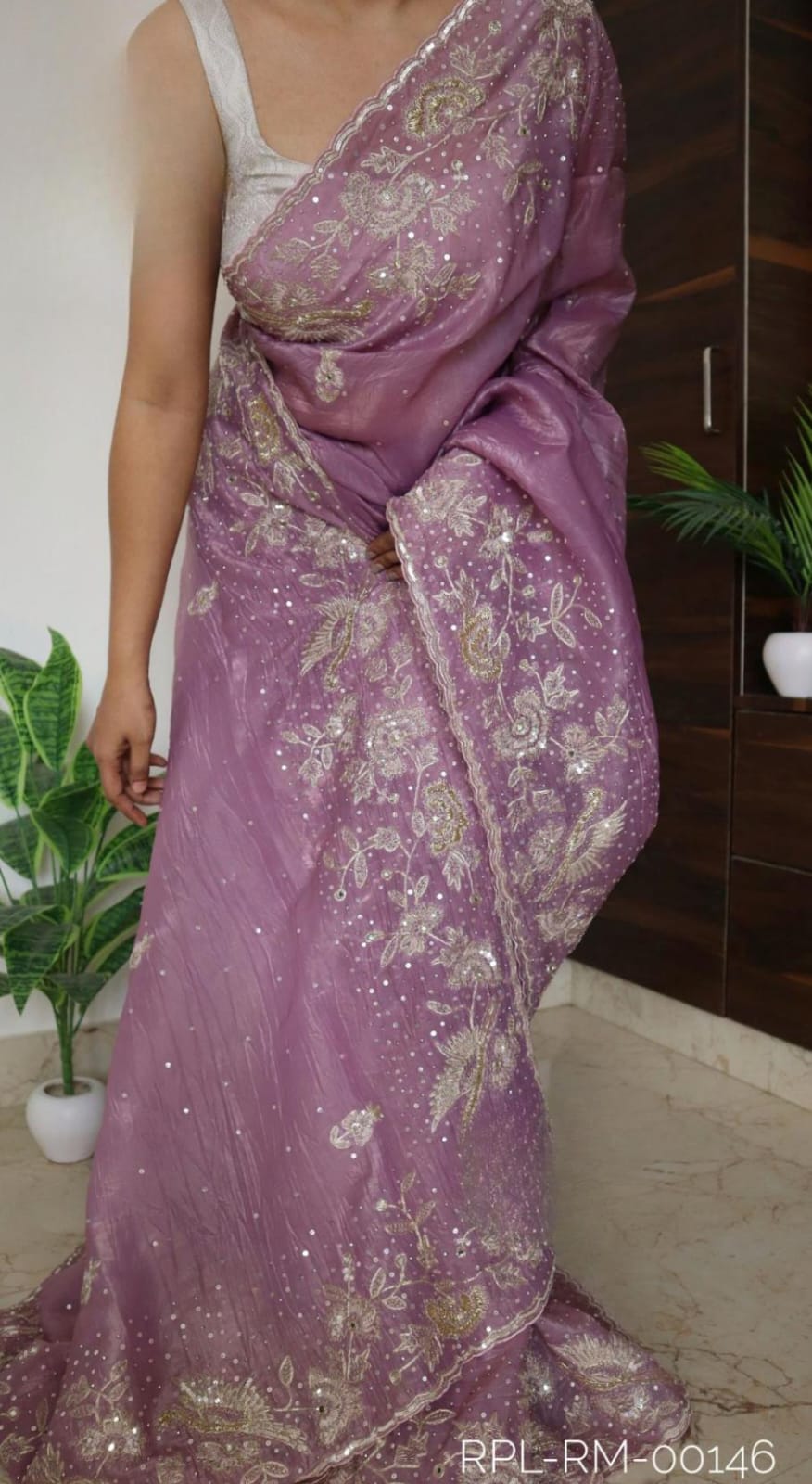 An ode to elegance, this beautiful pure crushed tissue Banarasi silk saree features sequin, cutdana, mirror, and pita handwork