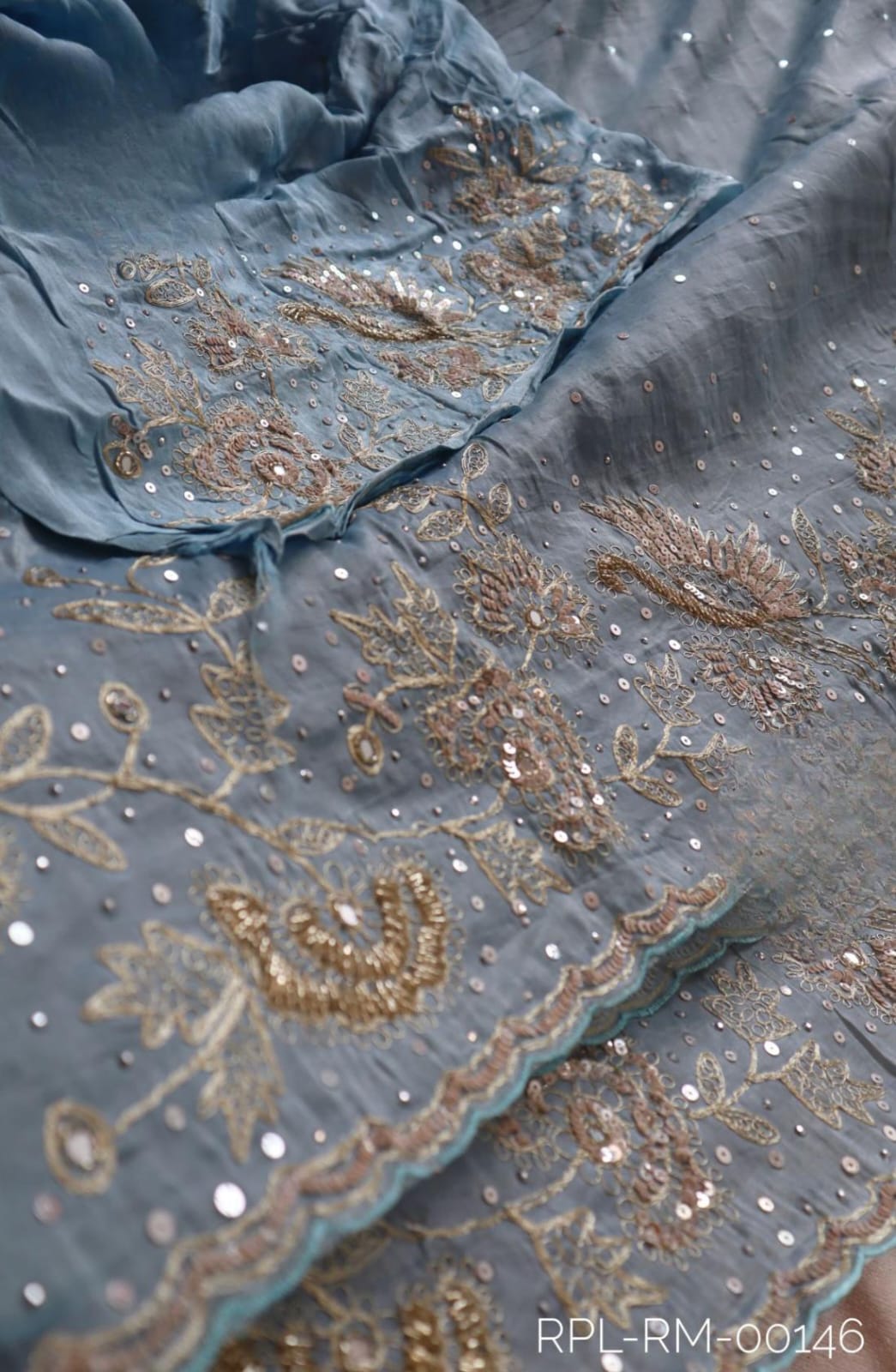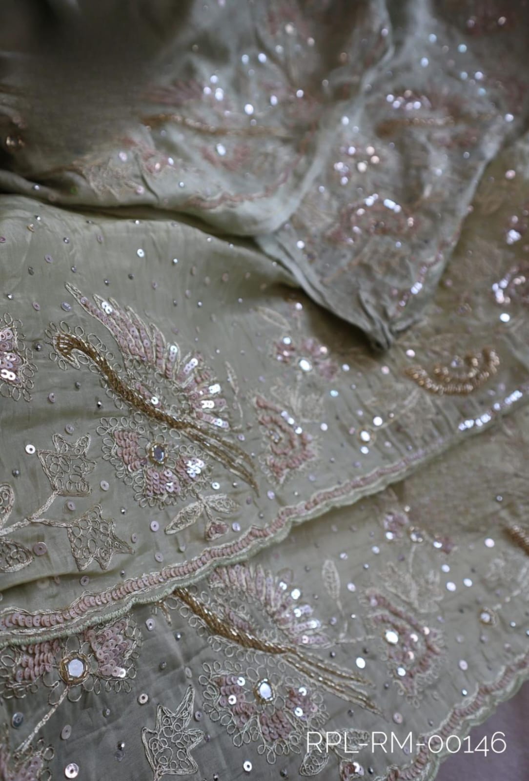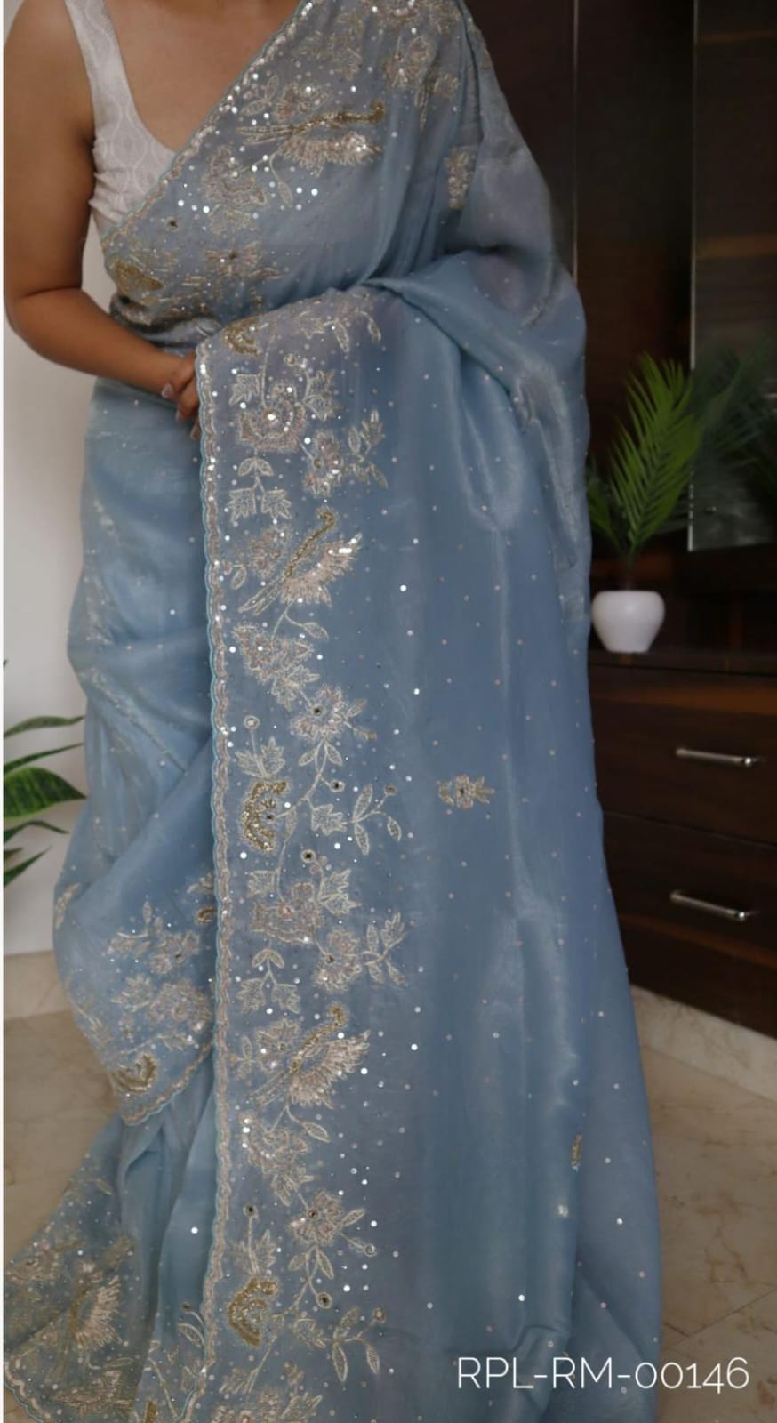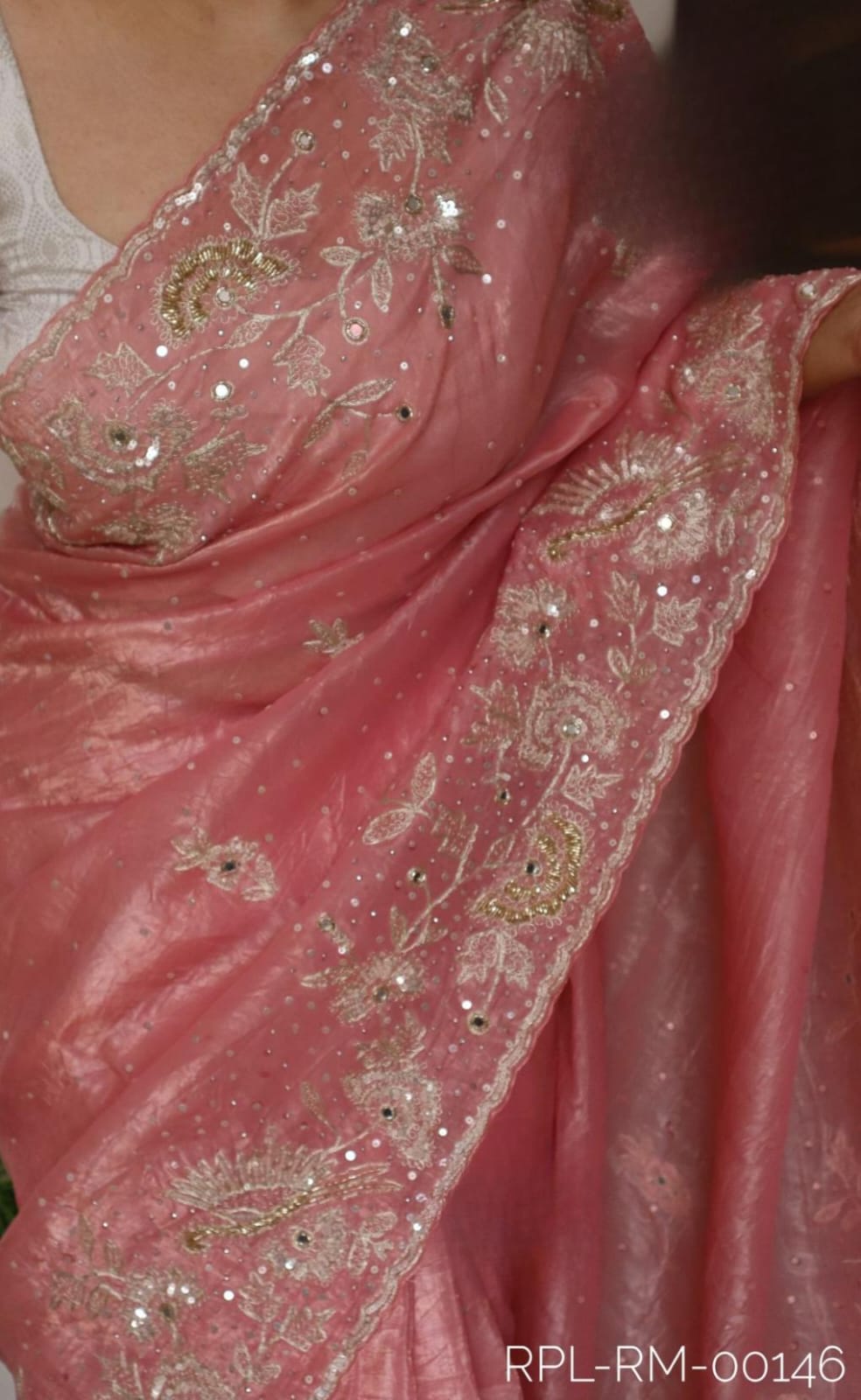 An ode to elegance, this beautiful pure crushed tissue Banarasi silk saree features sequin, cutdana, mirror, and pita handwork