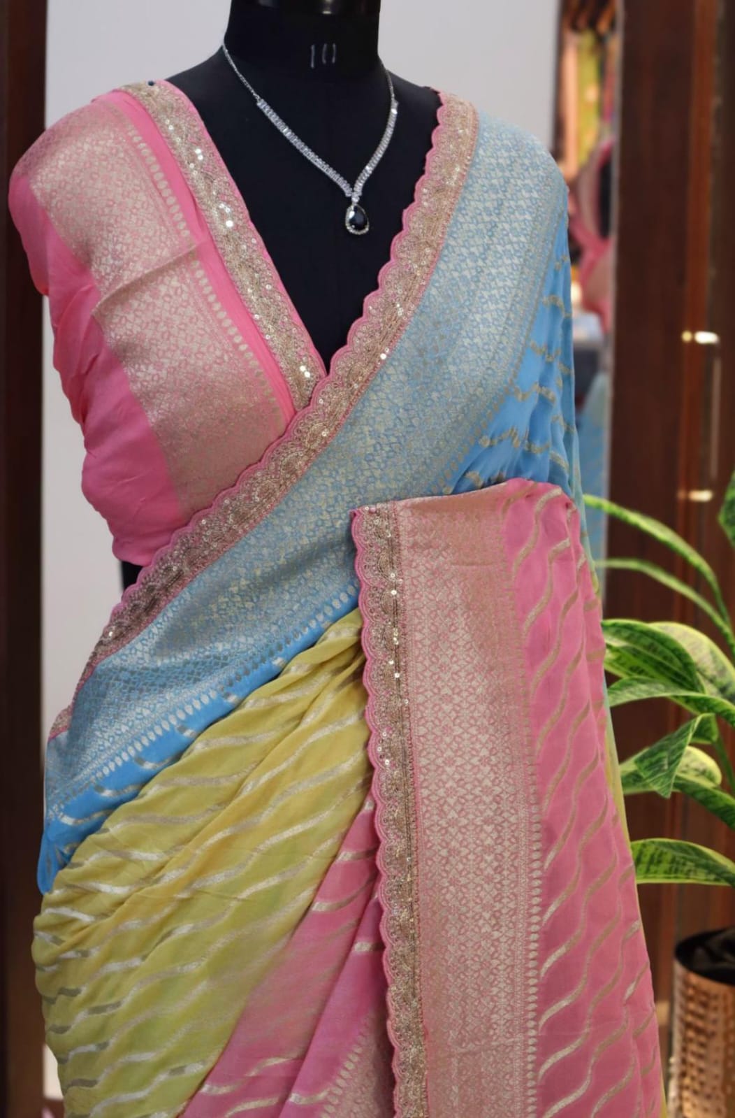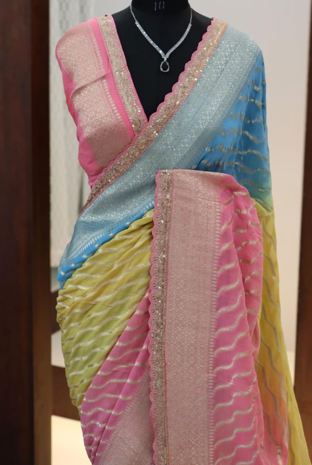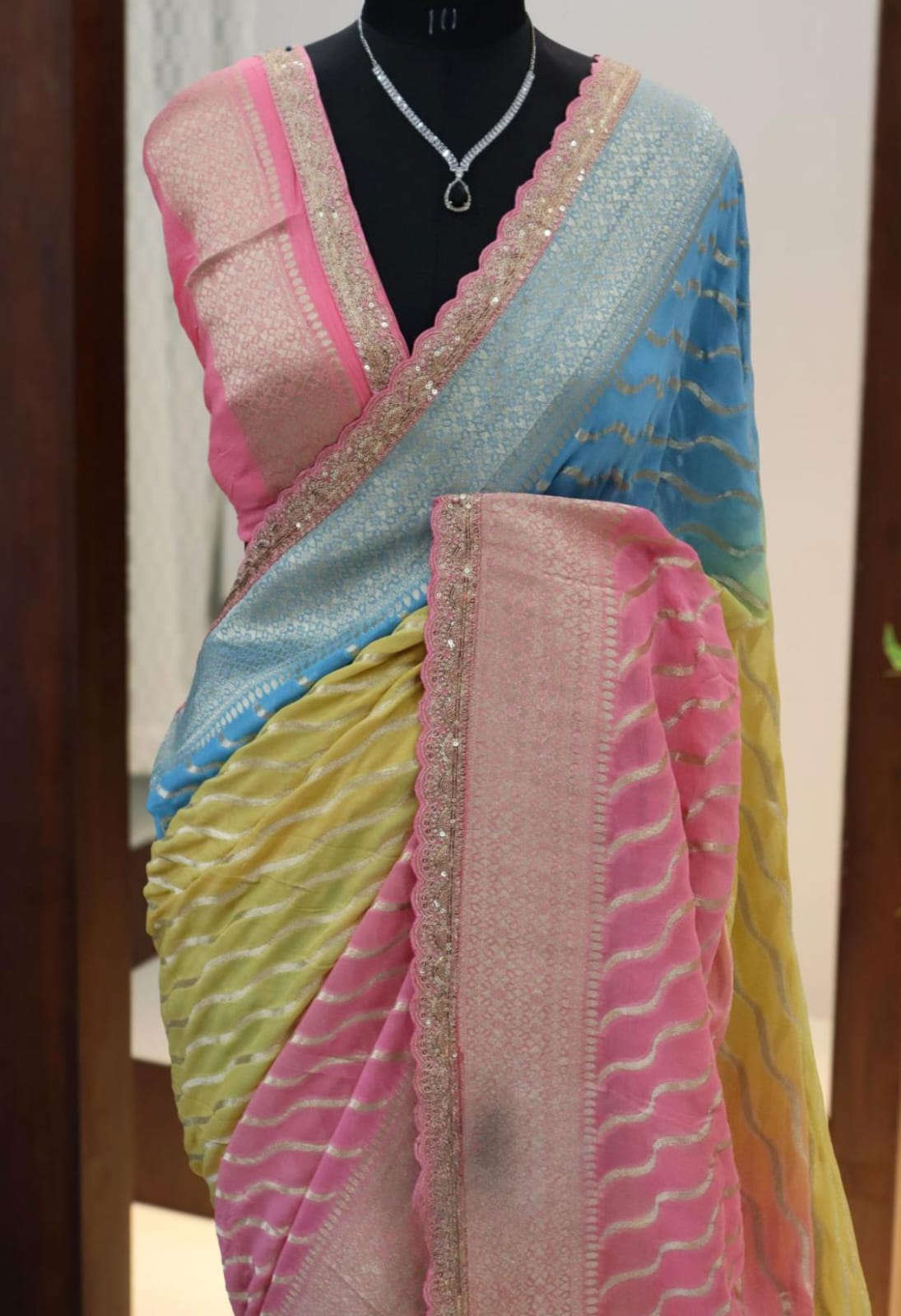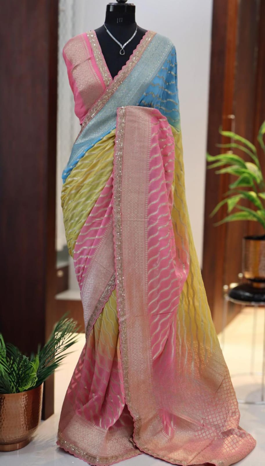 *Adorn yourself in this beautiful and charming pure georgette triple colour designer saree in lehariya weaving with Sabyasachi scalloped intricate borders*