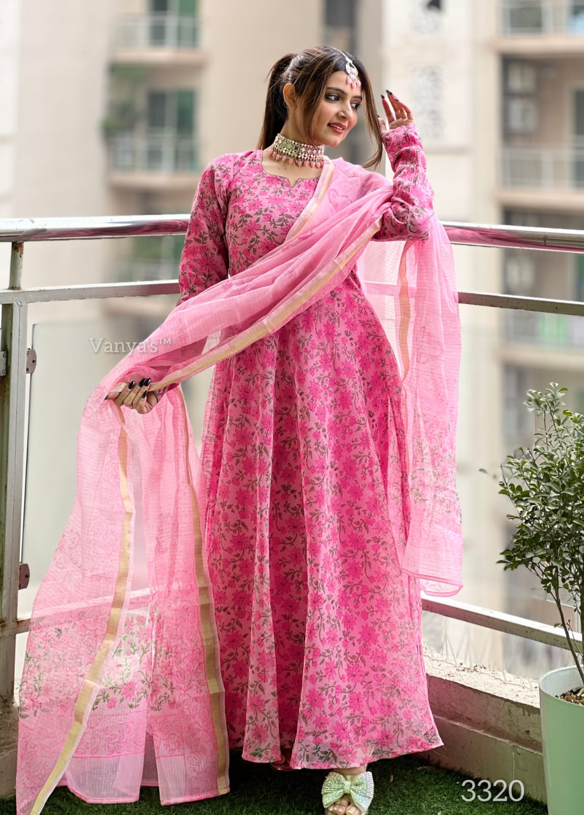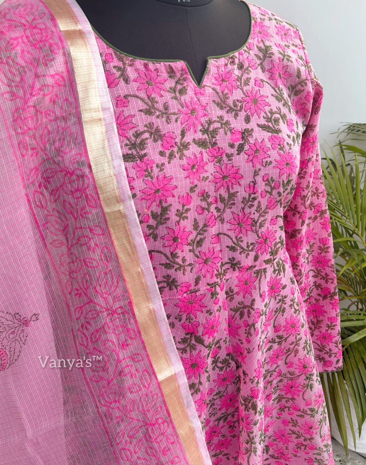 Fine anarkali style block print flower print over kota doria anarkali umbrella style kurti with inside cotton mul lining. *Chudidaar sleeves full length inside mul lining in sleeves too*