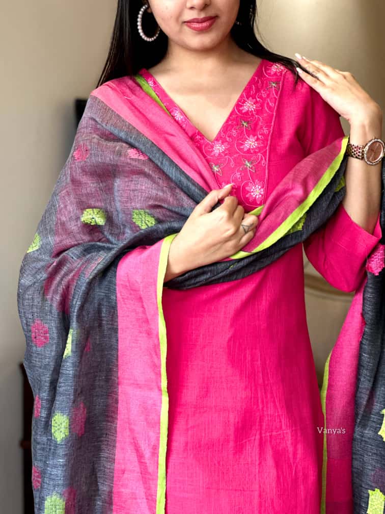 What better way to enjoy your days in our handloom cotton suit and pure linen dupatta set which gives a classy look.