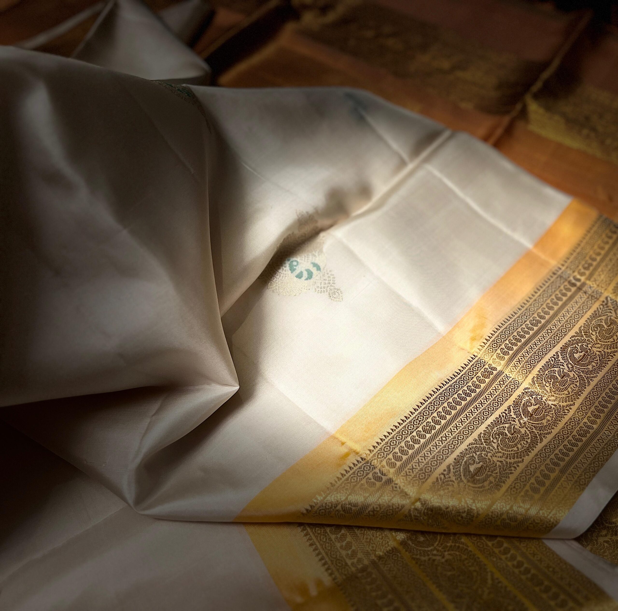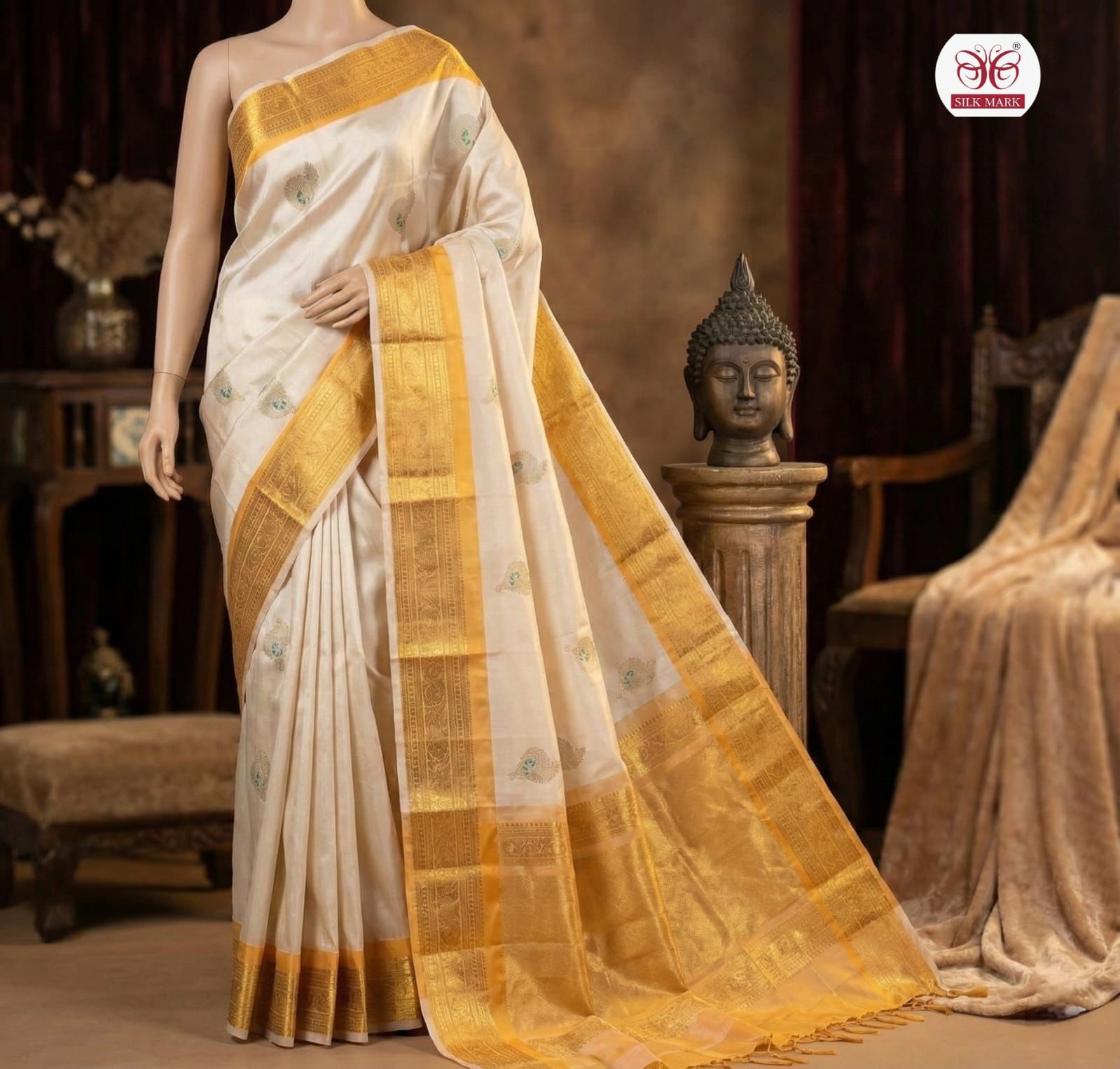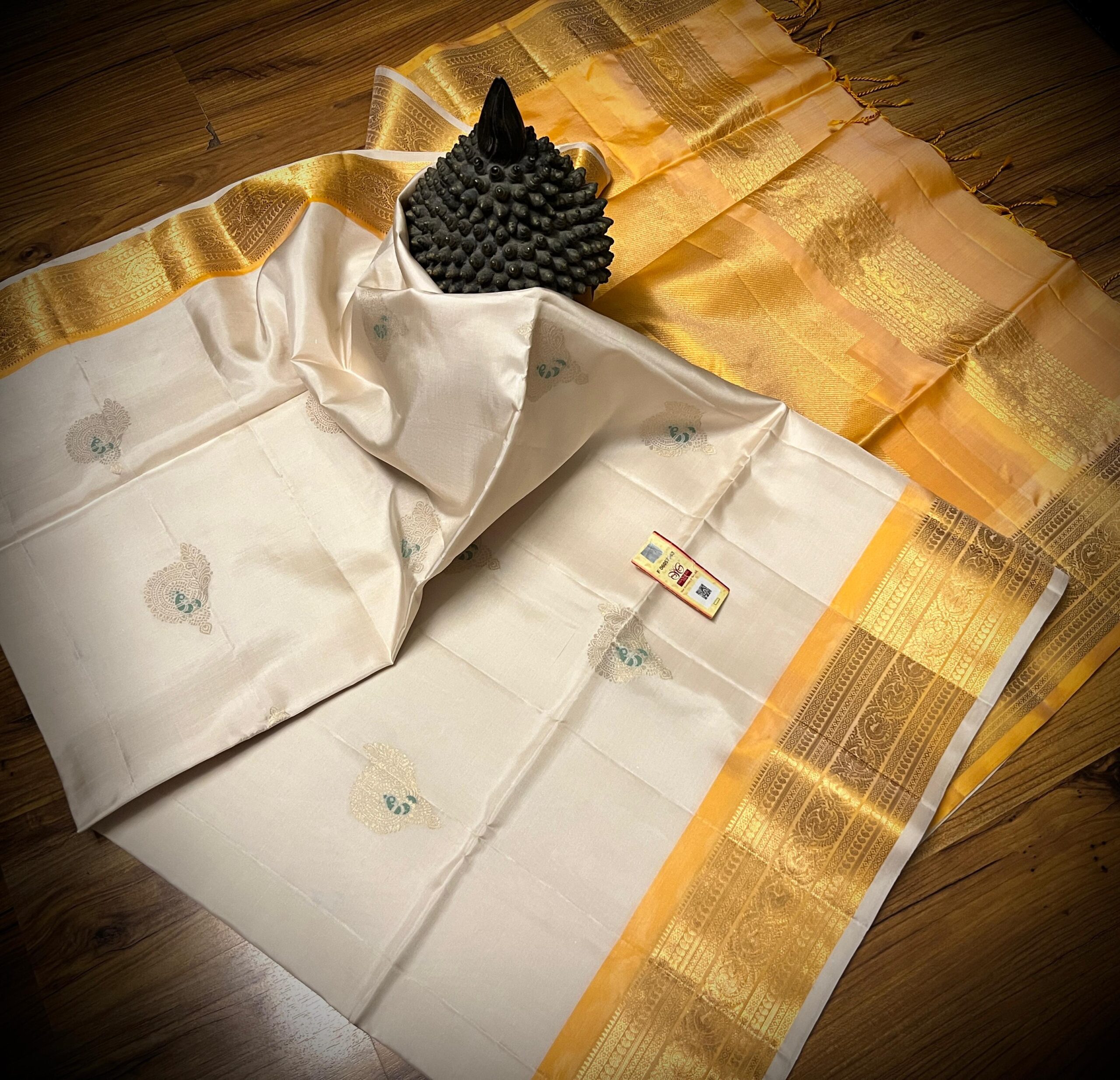Pure handloom soft silk sarees Pure Kanchipuram silk Handloom weaving Double warp silk Meena butta all over the saree Contrast the rich pallu and blouse Both sides Handloom Jaquard weaving Elegant weaves Handicrafted Lightweight Handloom saree