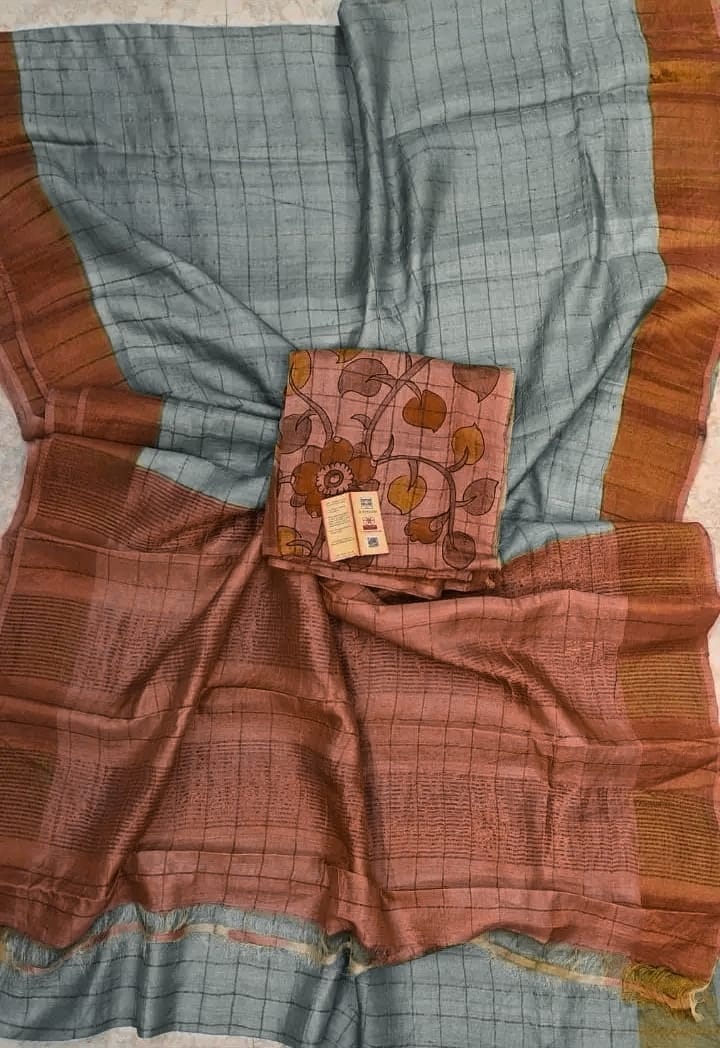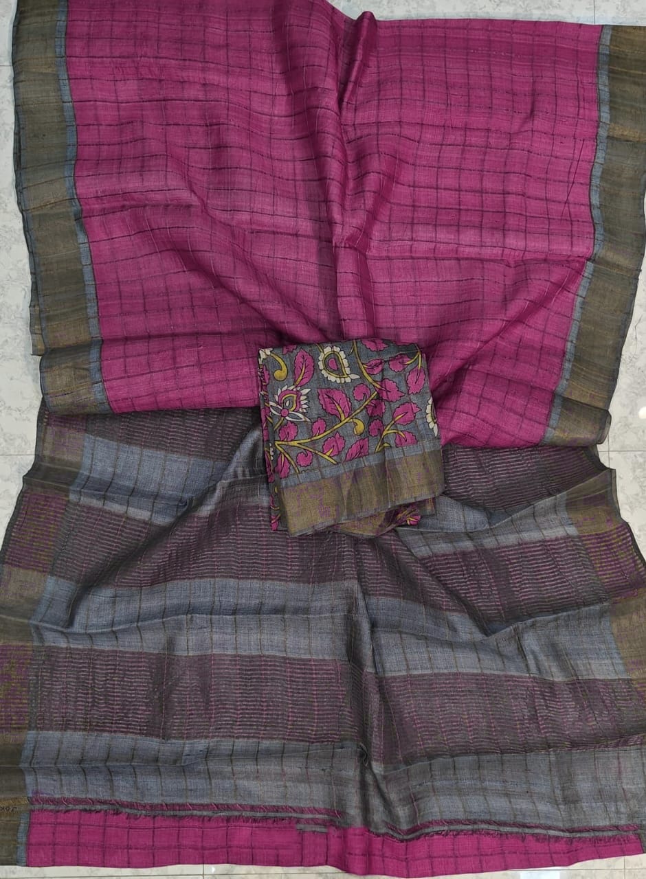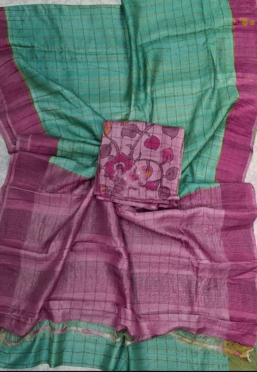 Checks zari border pure handloom tussar saree with kalamkari blouse