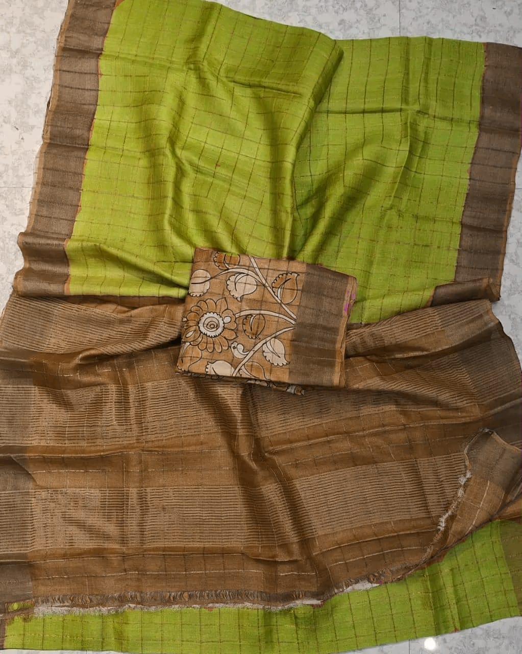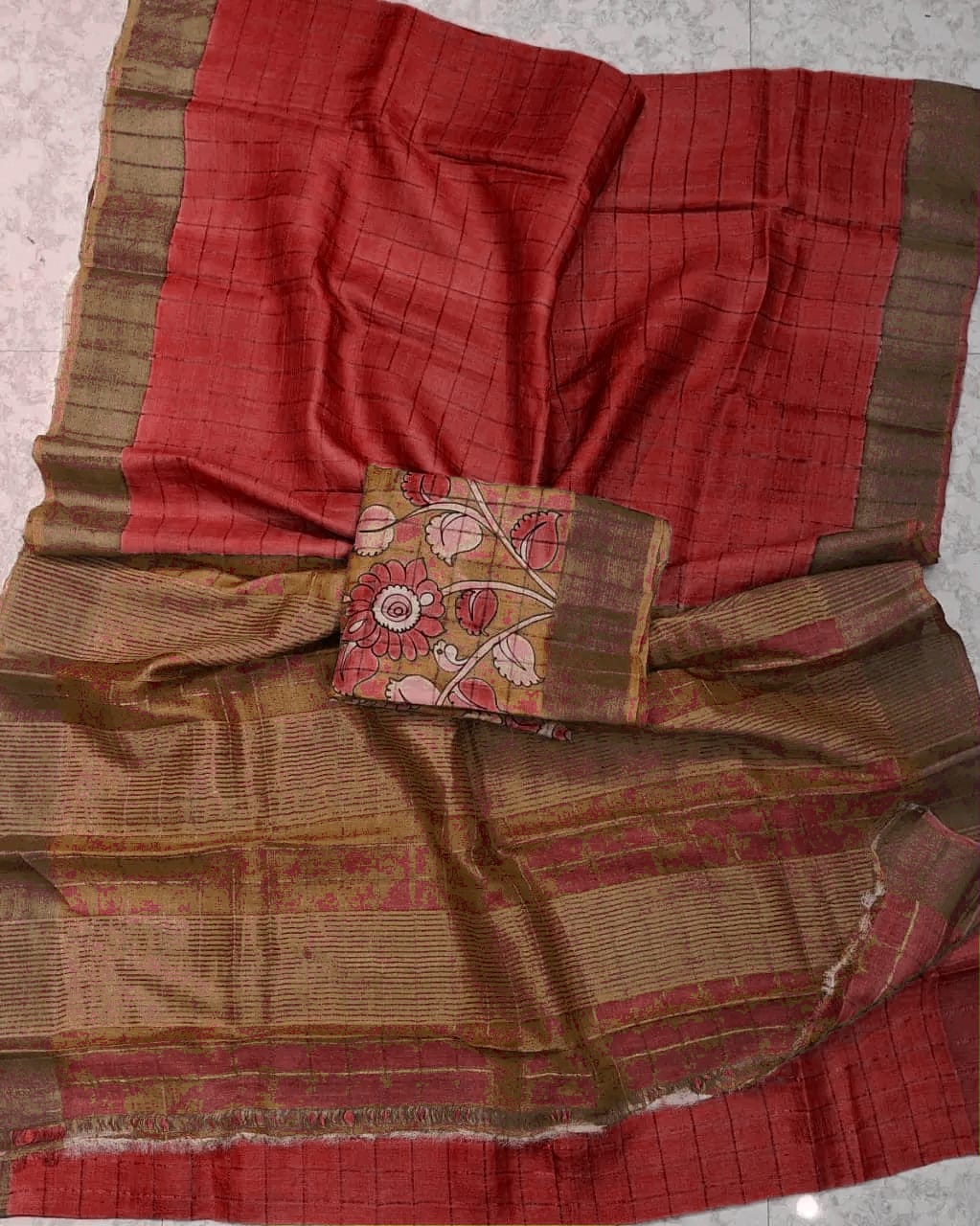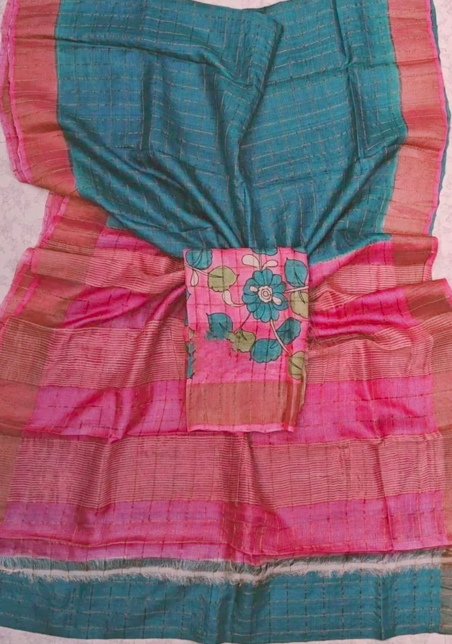 Checks zari border pure handloom tussar saree with kalamkari blouse