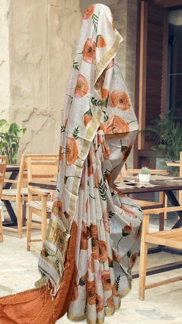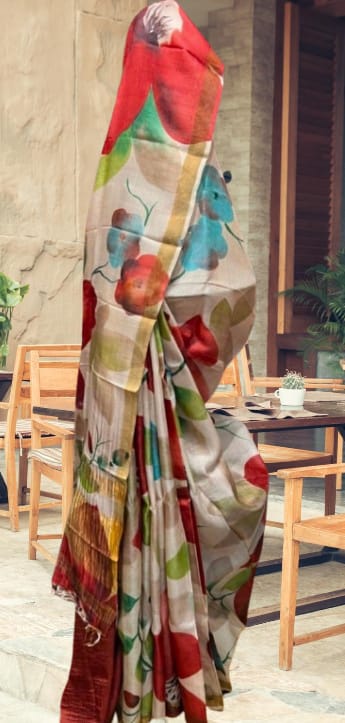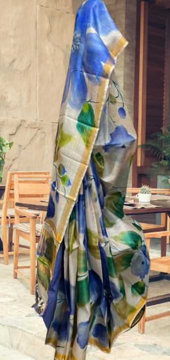 Most trending new design zari border pure handloom tusser saree with free hand hand painted saree Fabric- zari border with one foot solid zari pallu on pure handloom tusser saree Length- 6.5 mtrs with bp Price-5400+ ship with silkmark Wash- normal shampoo wash