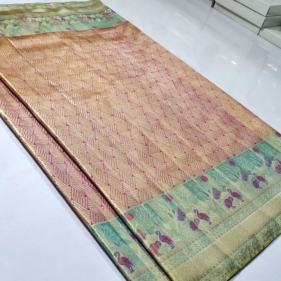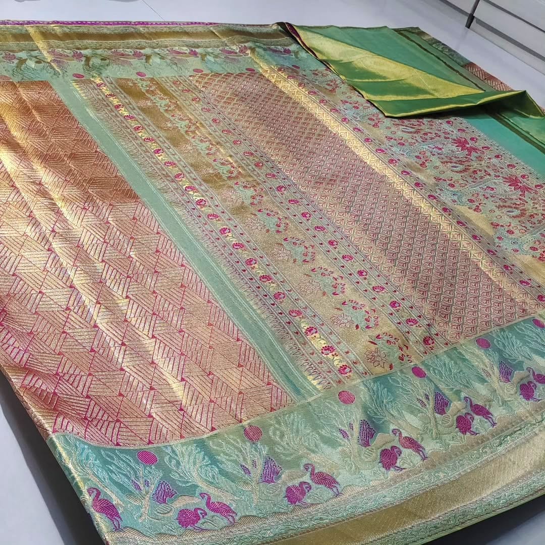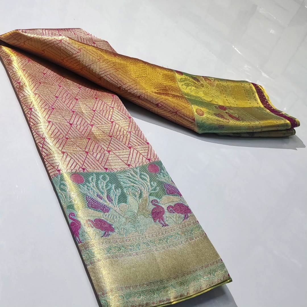 New 1 gm Pure kanchipattu tissue edge to edge Meenakari patterns