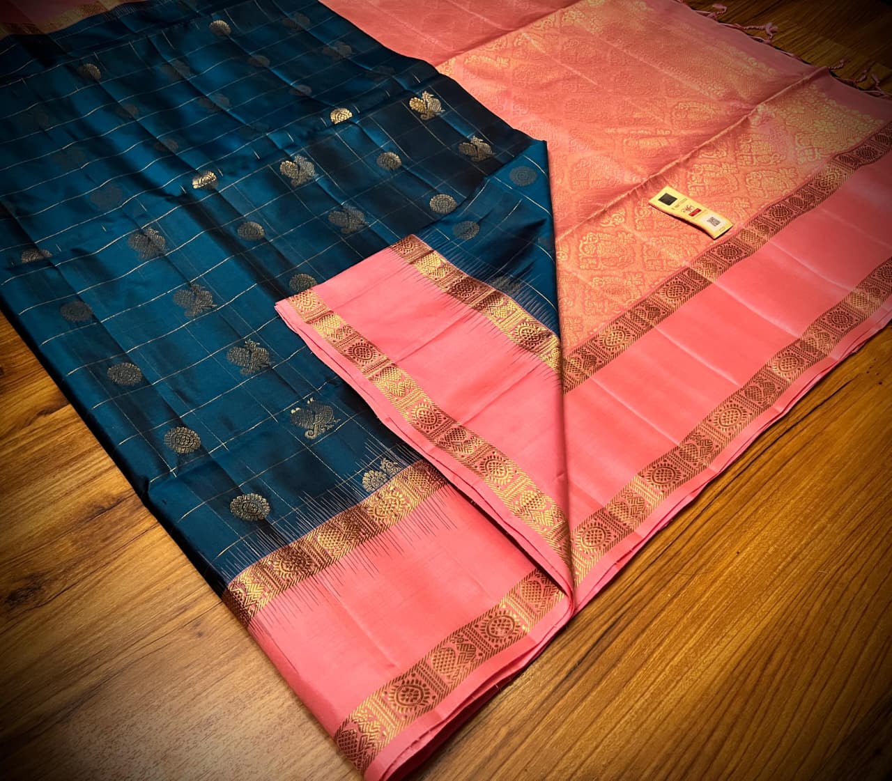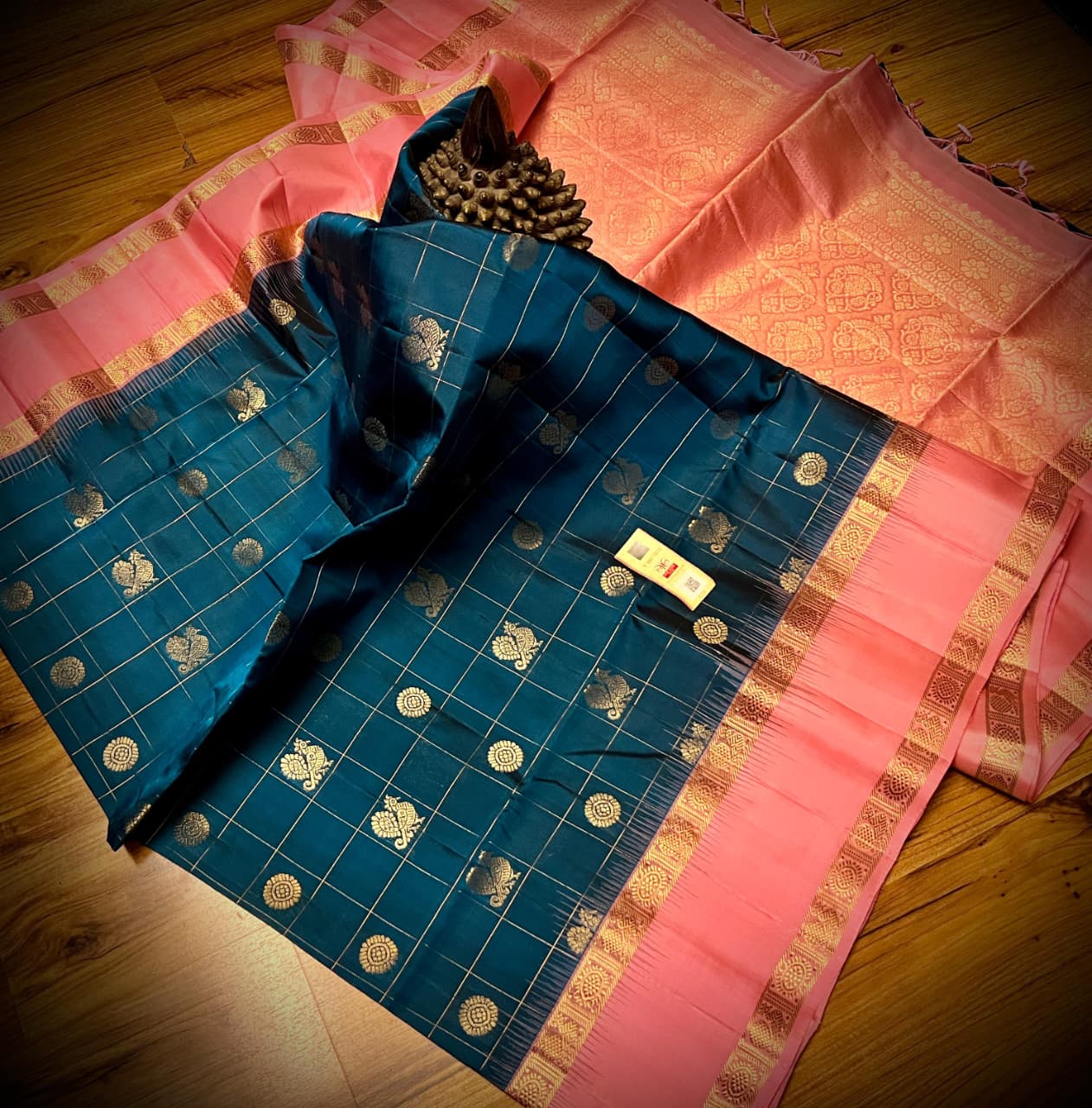 Pure Kanchipuram soft silk Traditional pure silk Retta petta Border Pure Kanchipuram soft silk Lightweight soft silk All over, jarie weaving Beautiful colour combination Contrast Border Both sides Contrast pallu and blouse