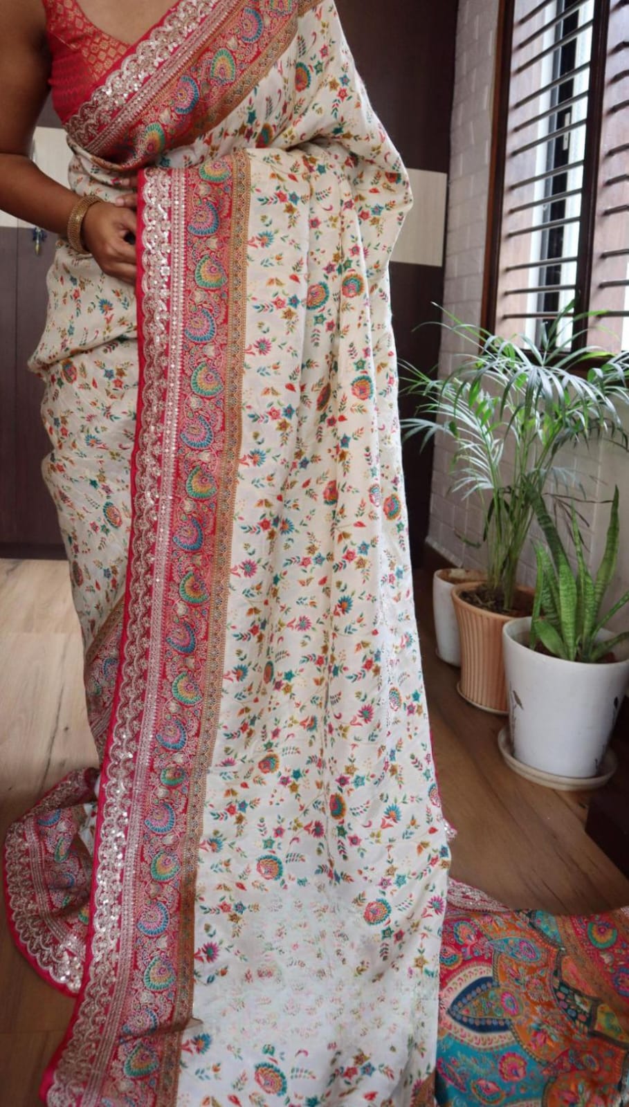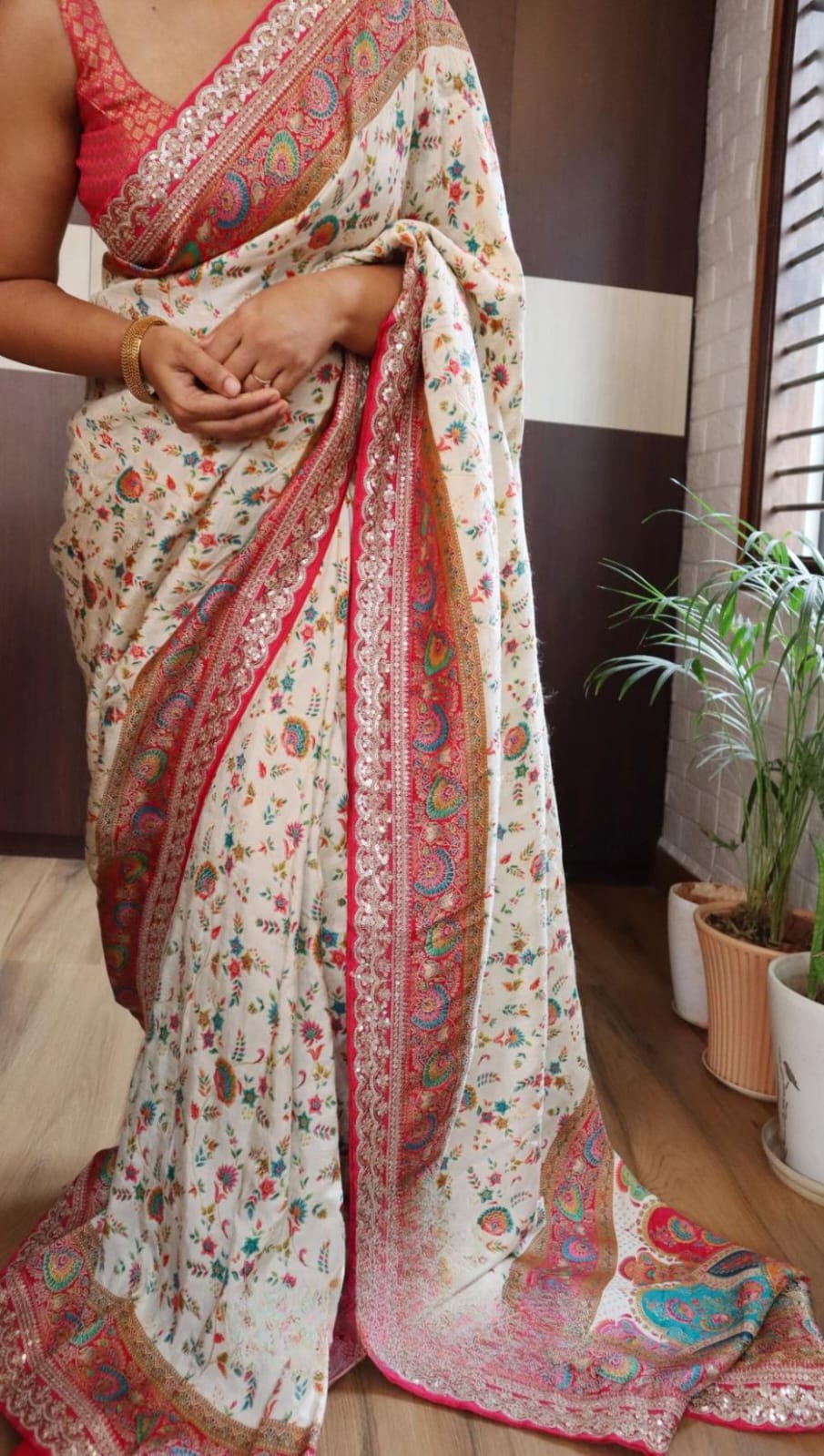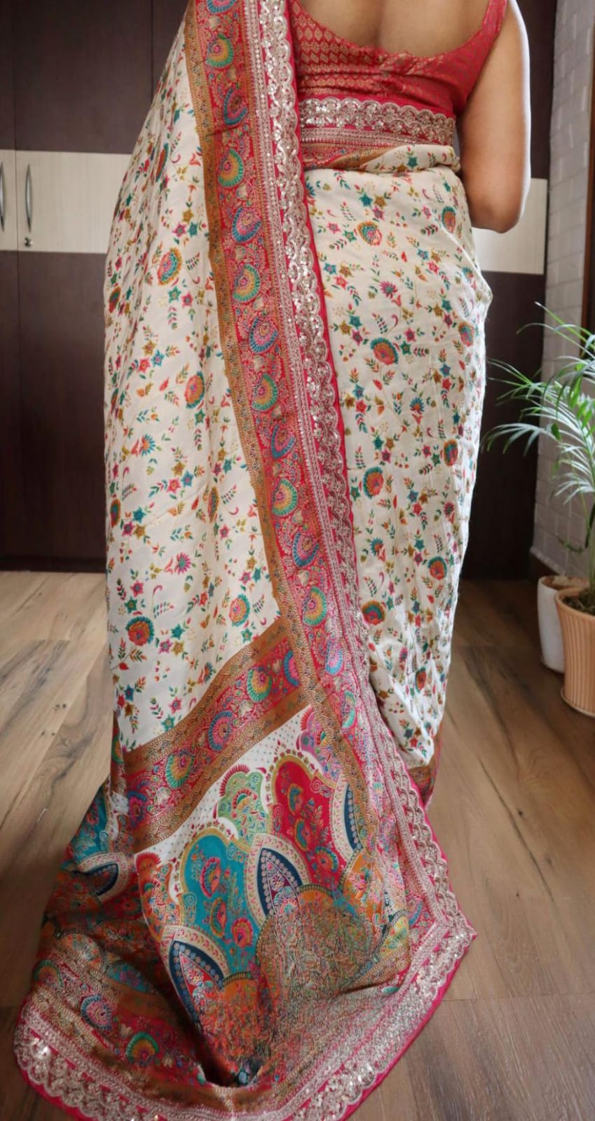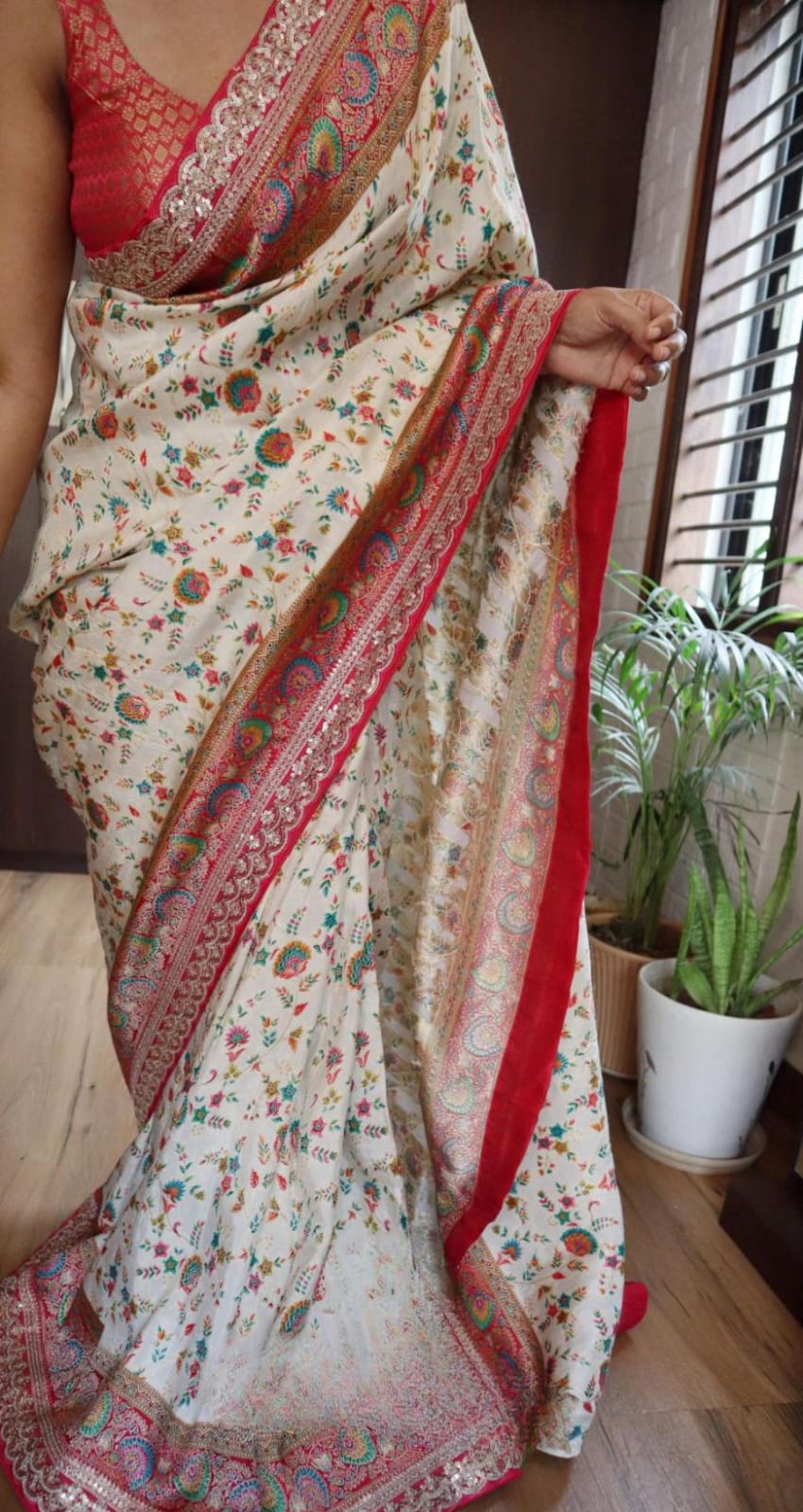 Accompanied by a contrast silk blouse piece that perfectly complements the saree, exuding elegance.