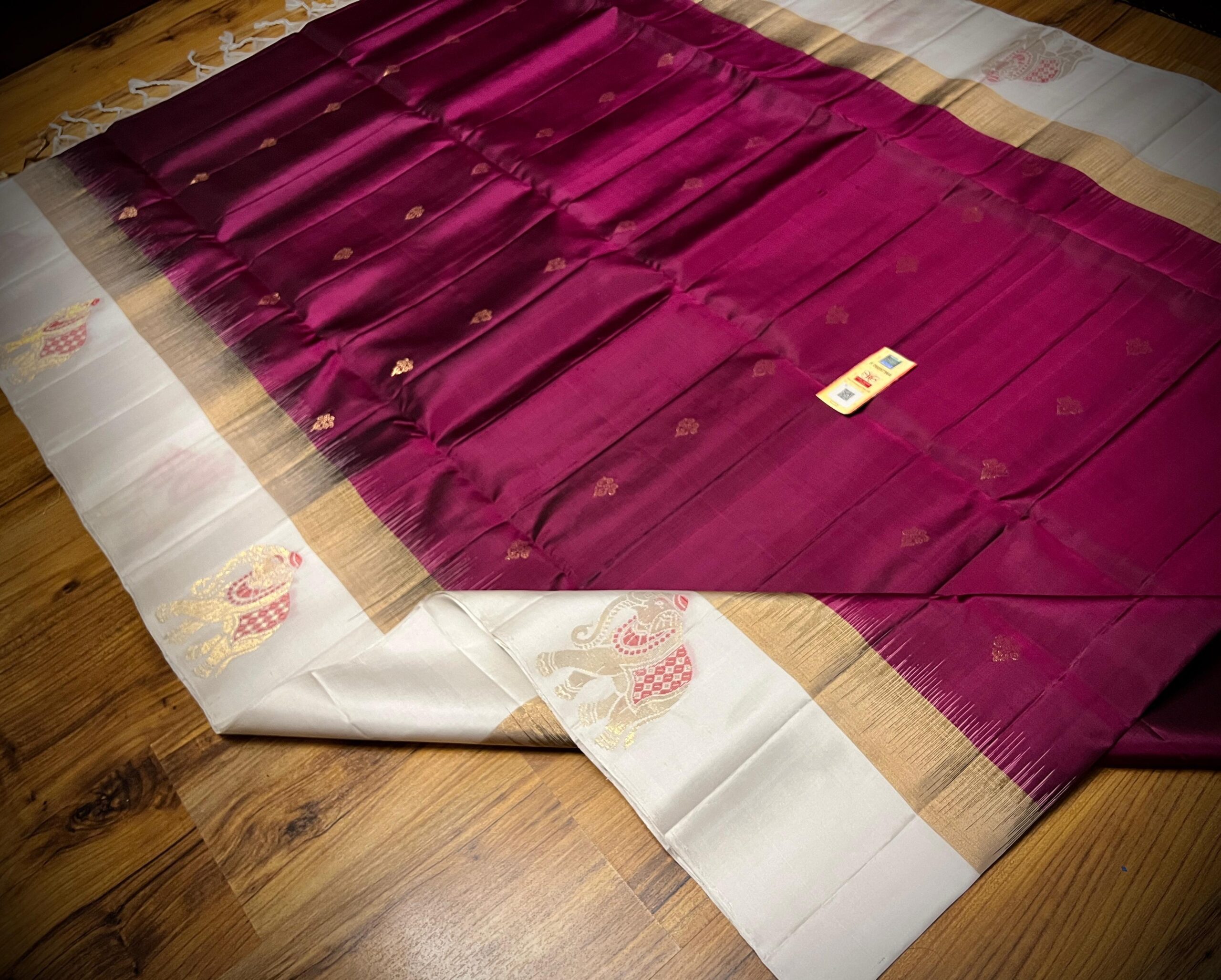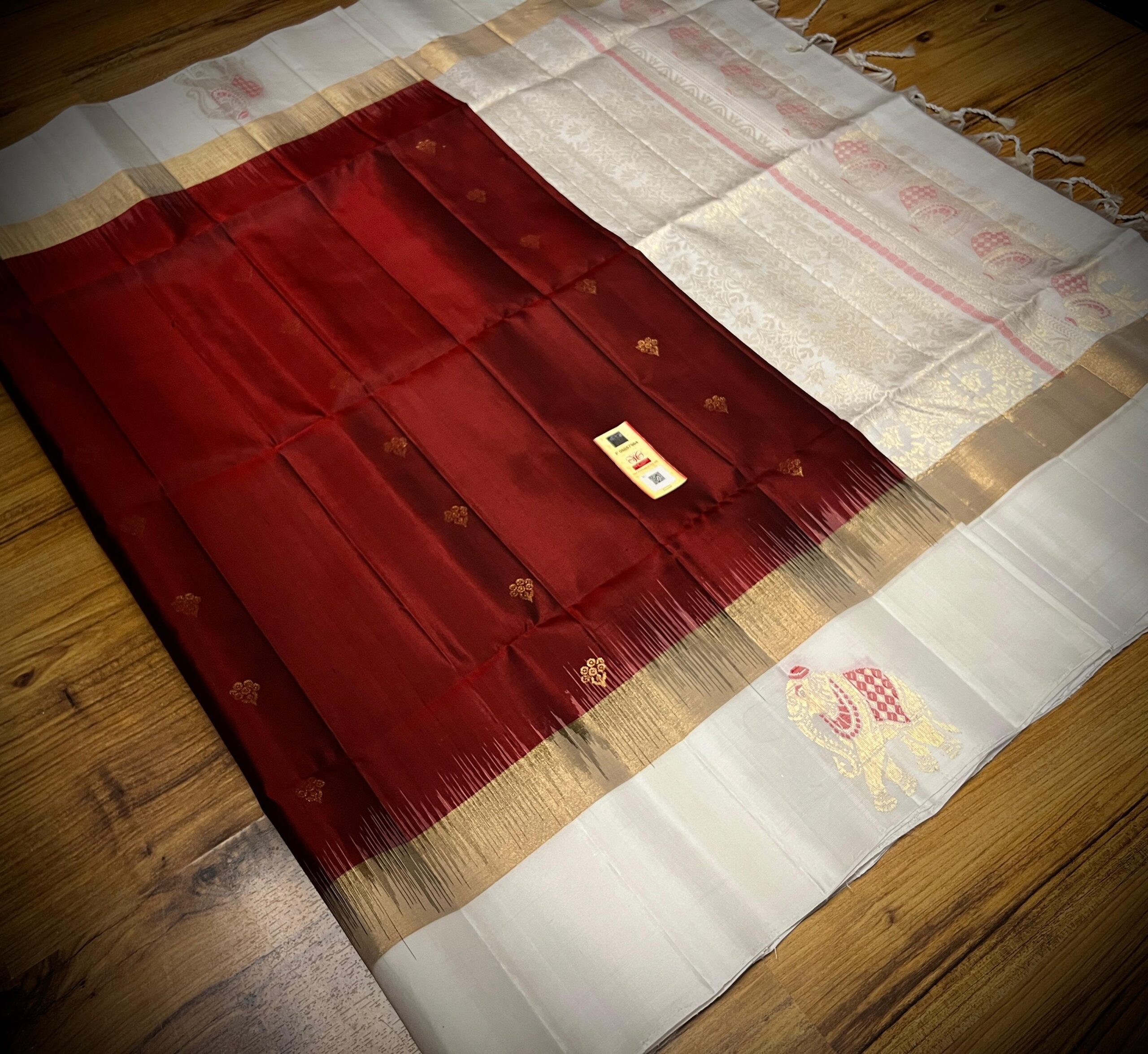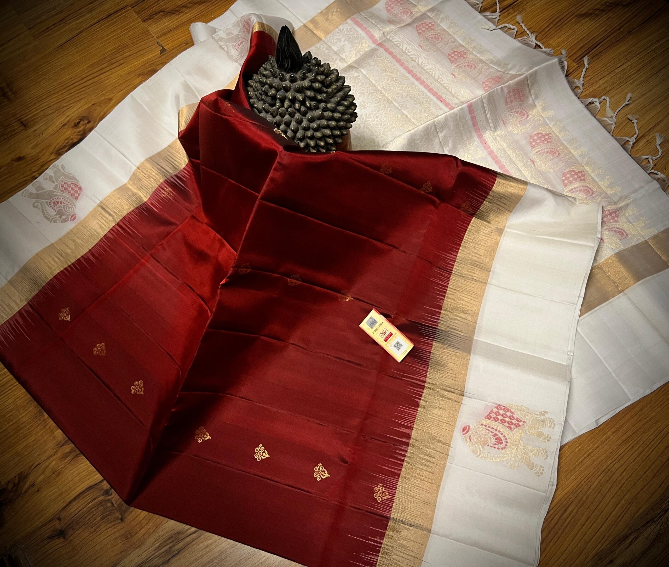Pure silk Handloom Showroom Quality Own production, Customisation of colour possible Contrast Weaving Pure white with Marun combo Double warp silk Elpehant Meena Butta Side butta all over saree Both side border side Butta All over Body Butta Contrast Rich Pallu and blouse