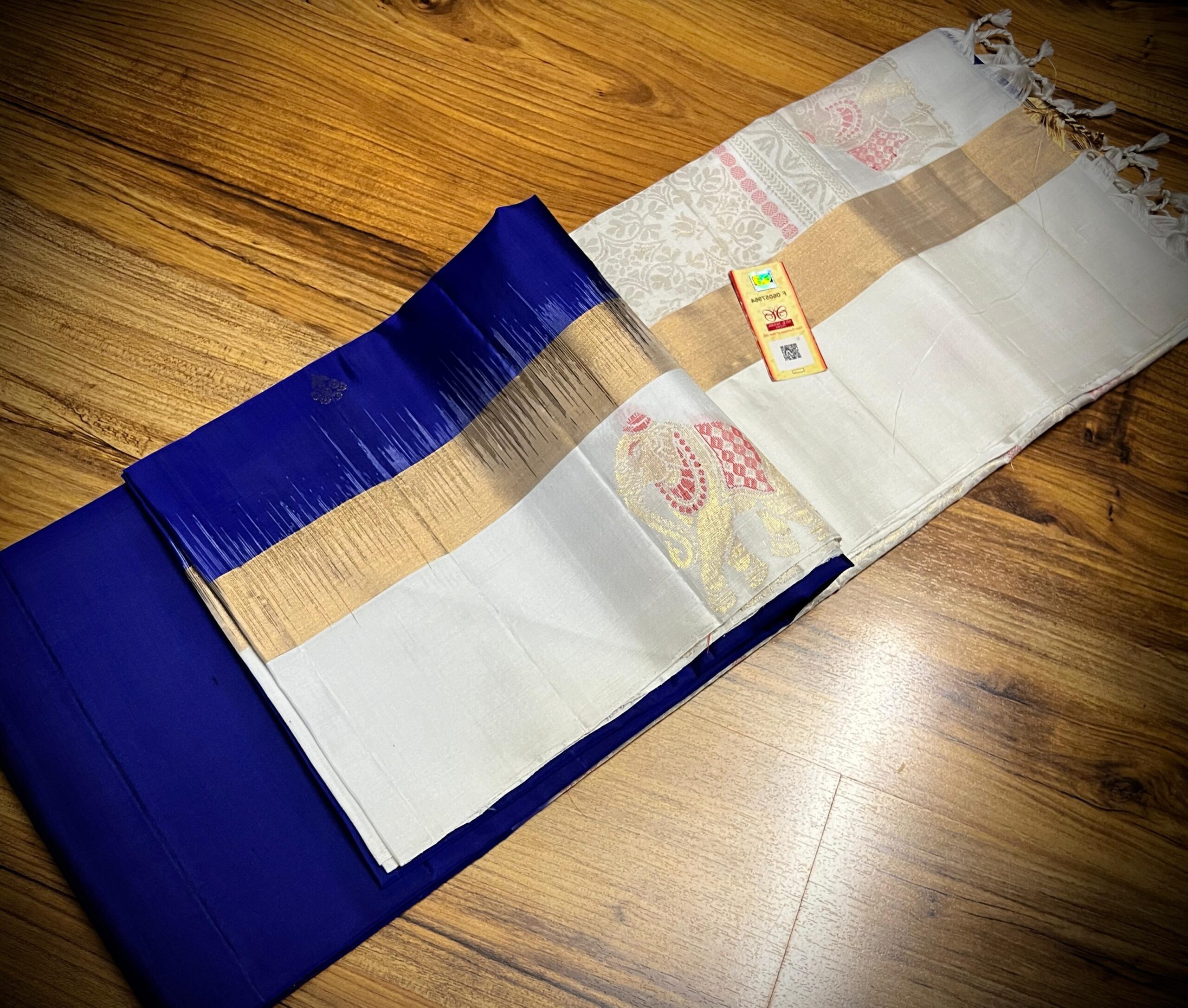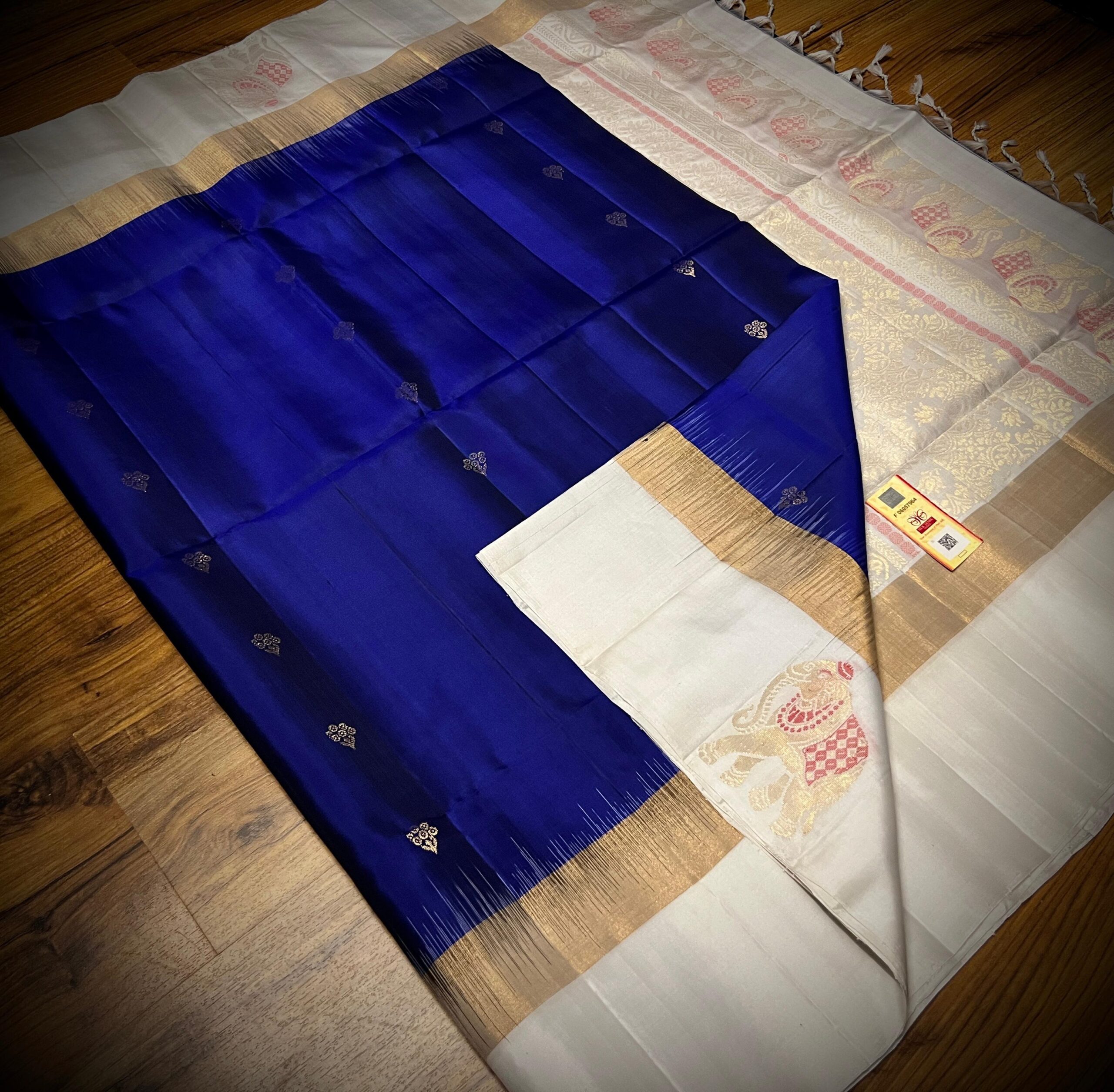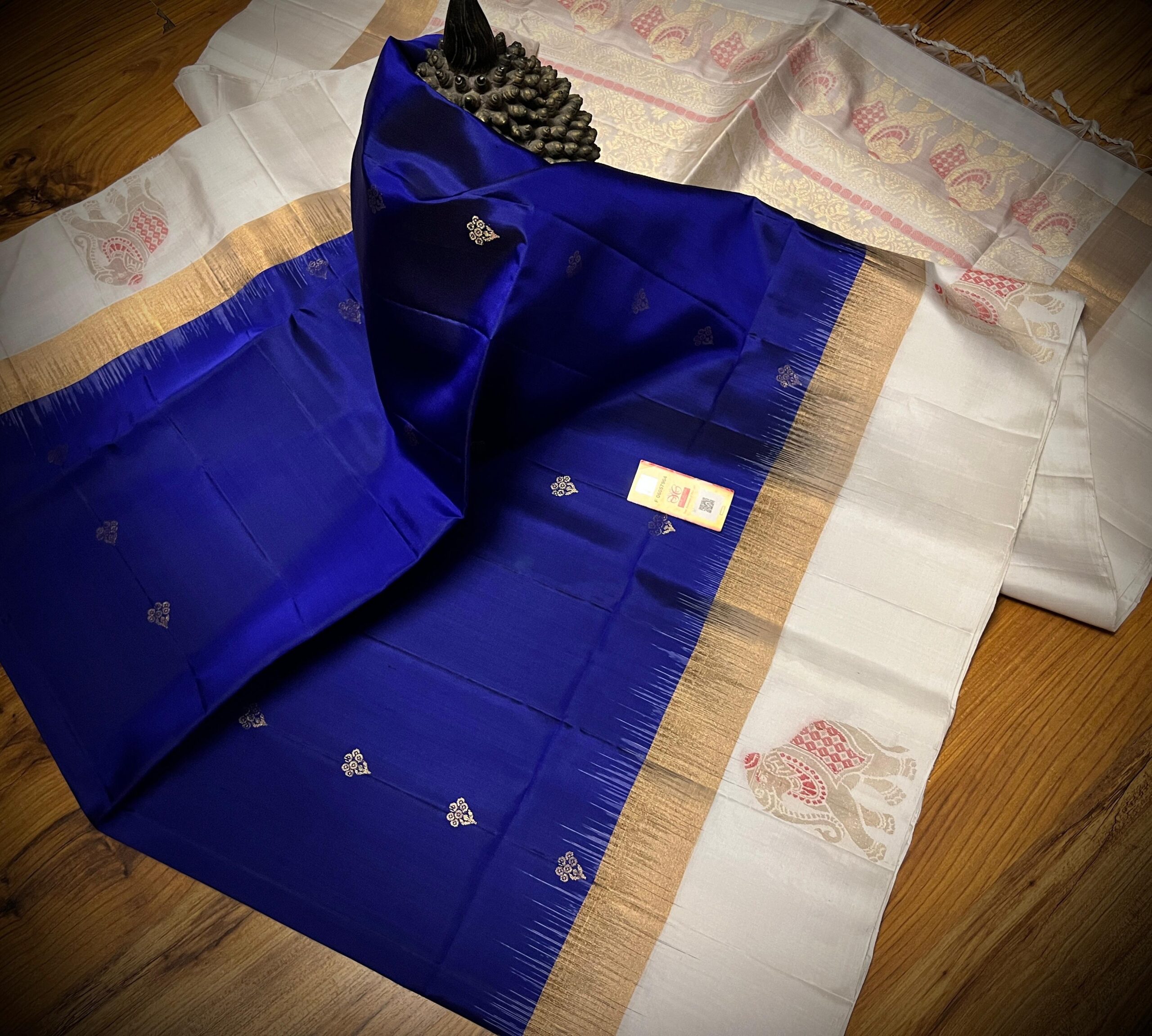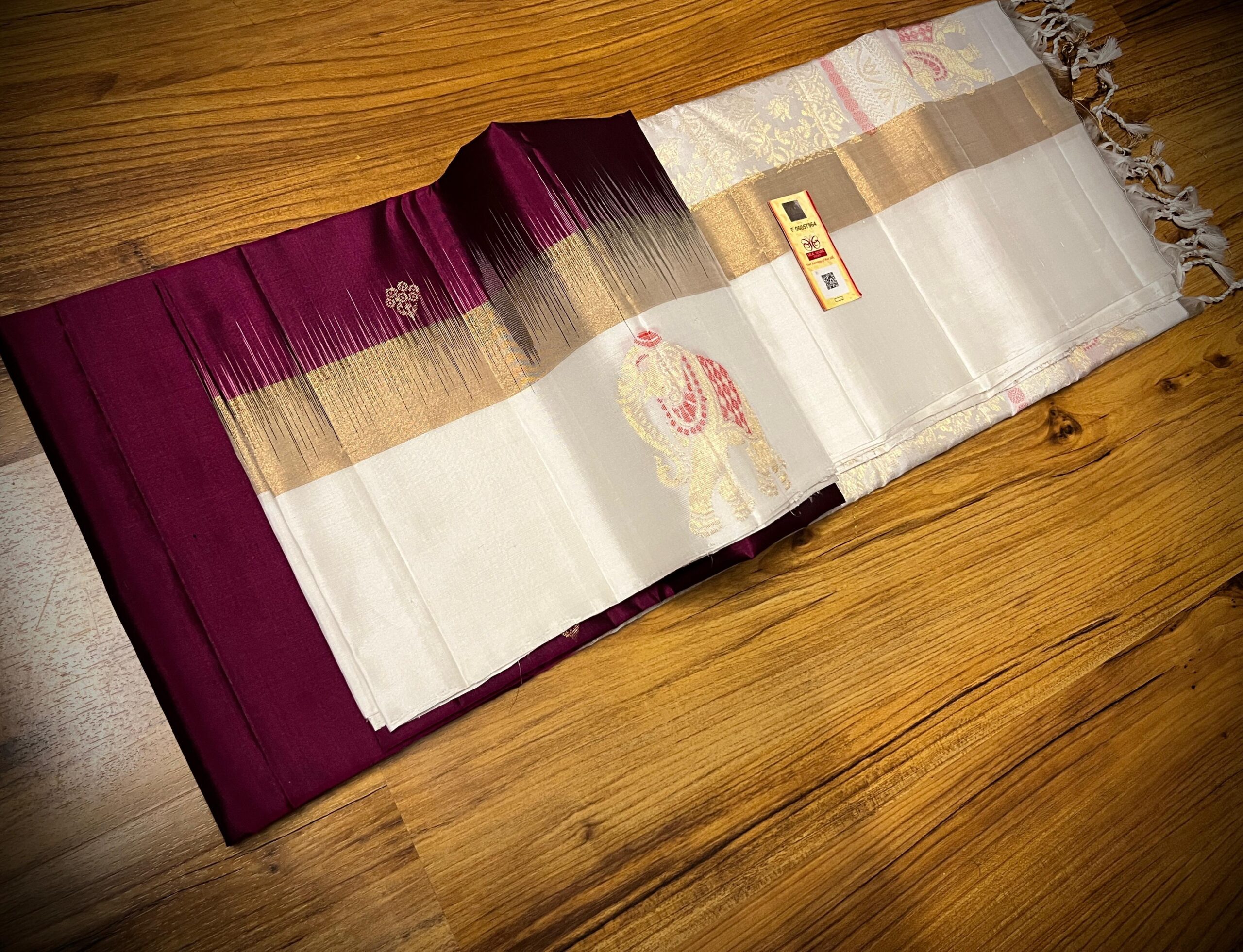 Pure silk Handloom Showroom Quality Own production, Customisation of colour possible Contrast Weaving Pure white with Marun combo Double warp silk Elpehant Meena Butta Side butta all over saree Both side border side Butta All over Body Butta Contrast Rich Pallu and blouse