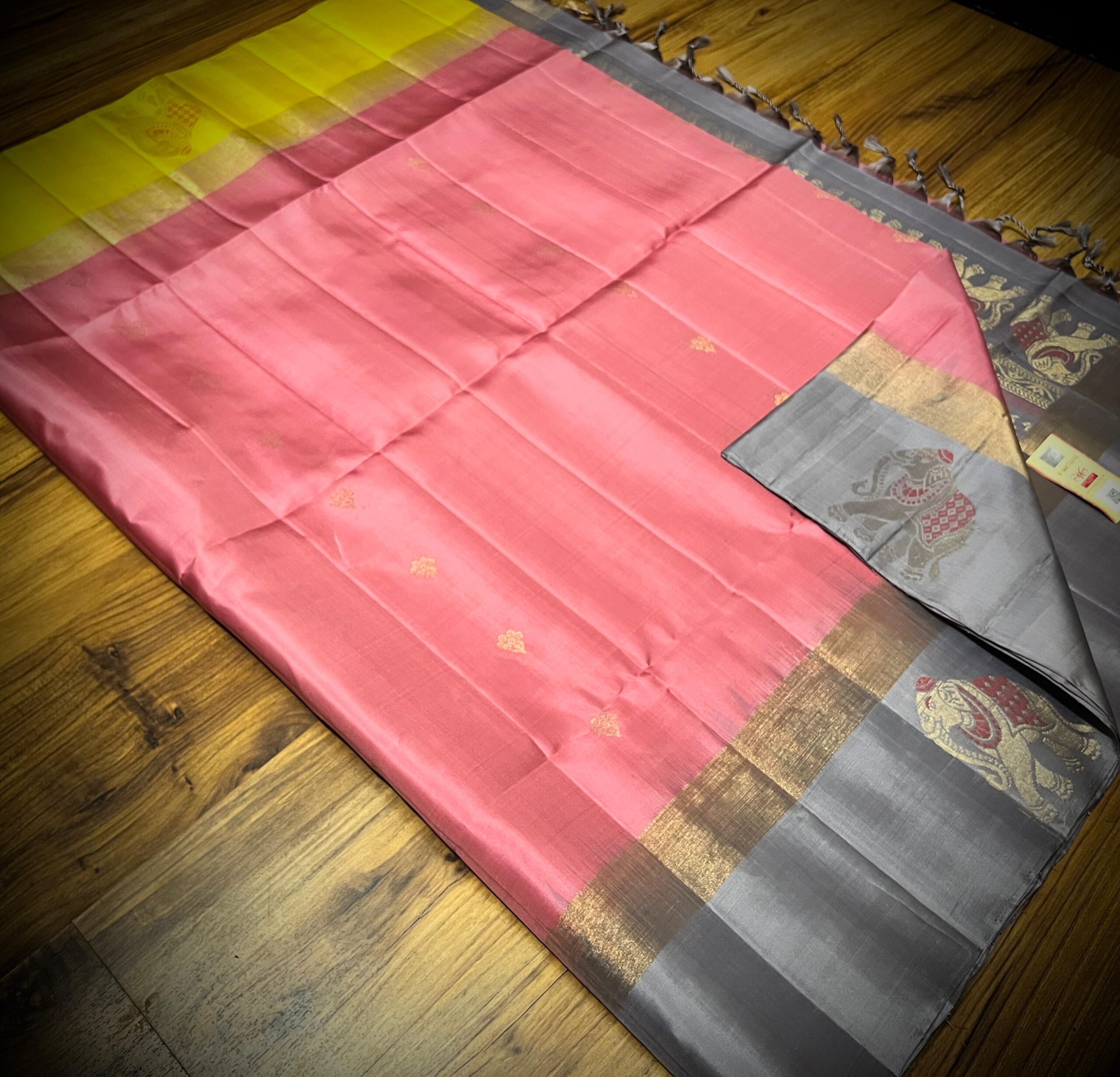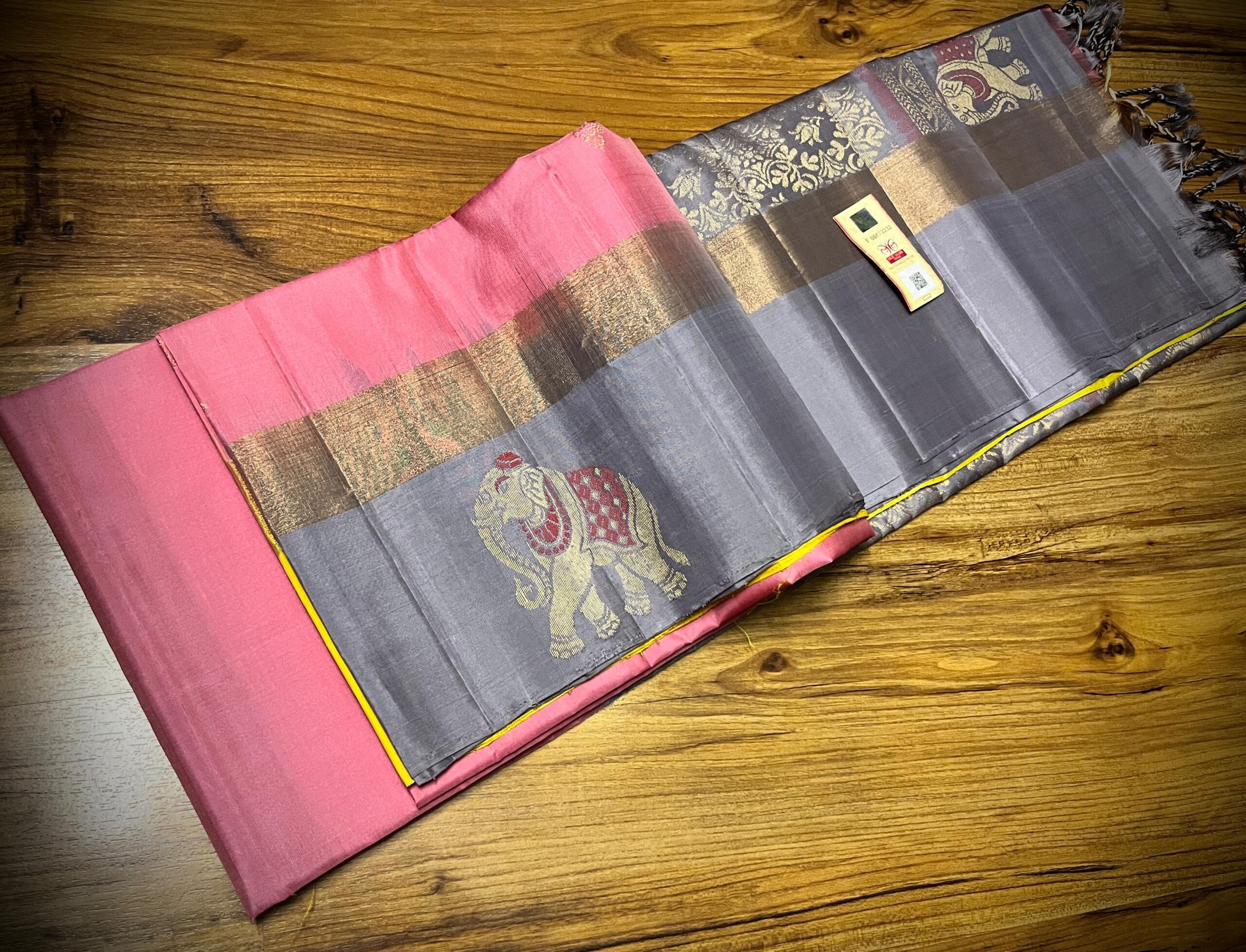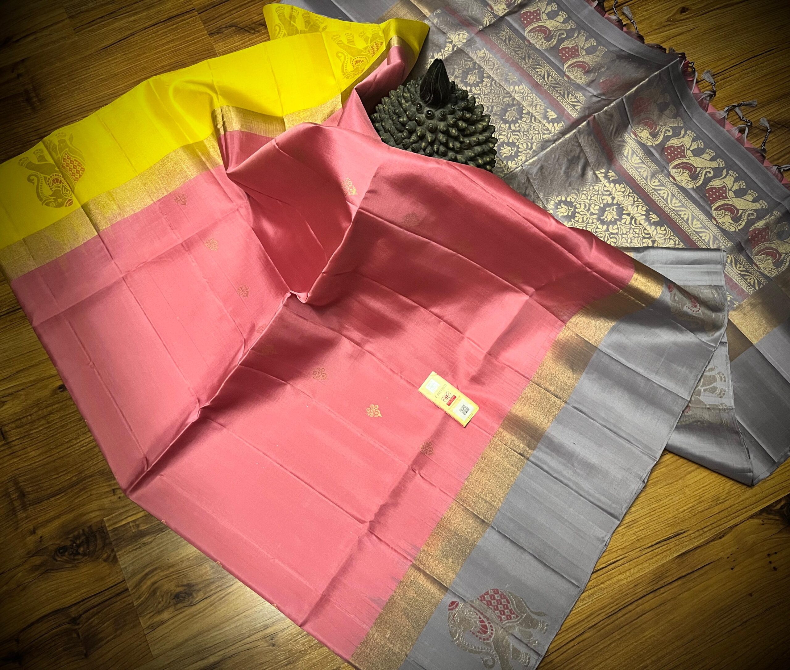 Pure silk Handloom Beautiful colour combination *Showroom Quality* Pure silk Handloom Own production, Customization of colour possible *Grey colour pallu and blouse* Contrast Weaving Ganga Jamuna Border Double warp silk *Elephant Butta* Side butta all over saree Both side border side Butta All over Body Butta Contrast Rich Pallu and blouse