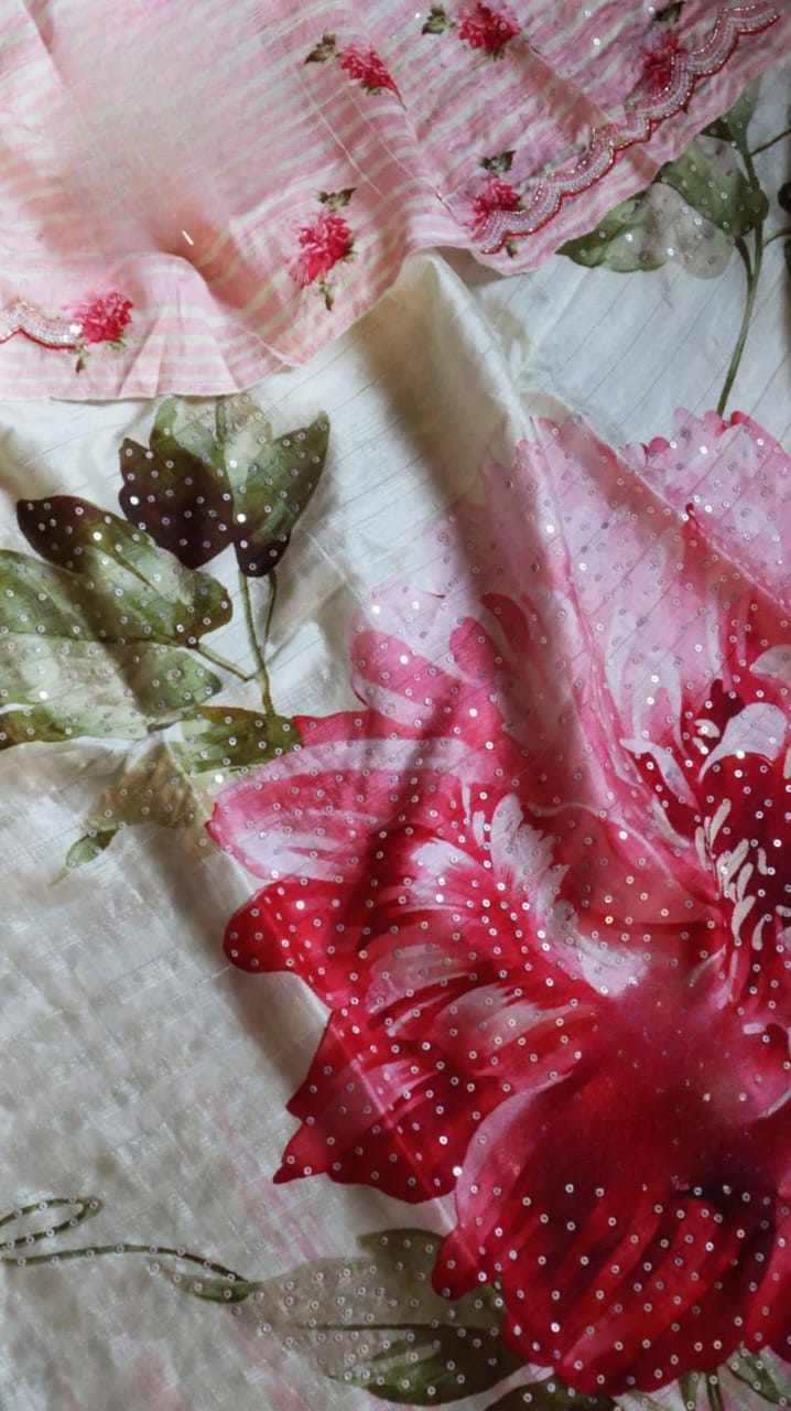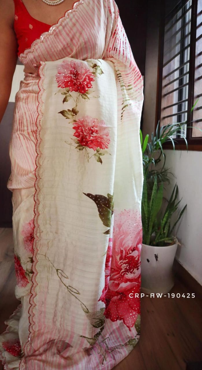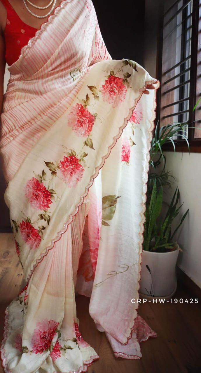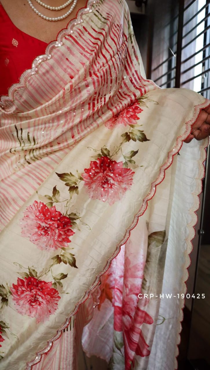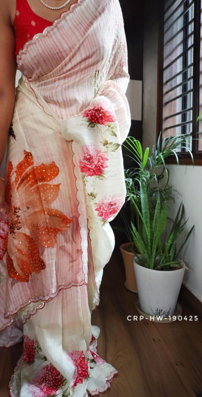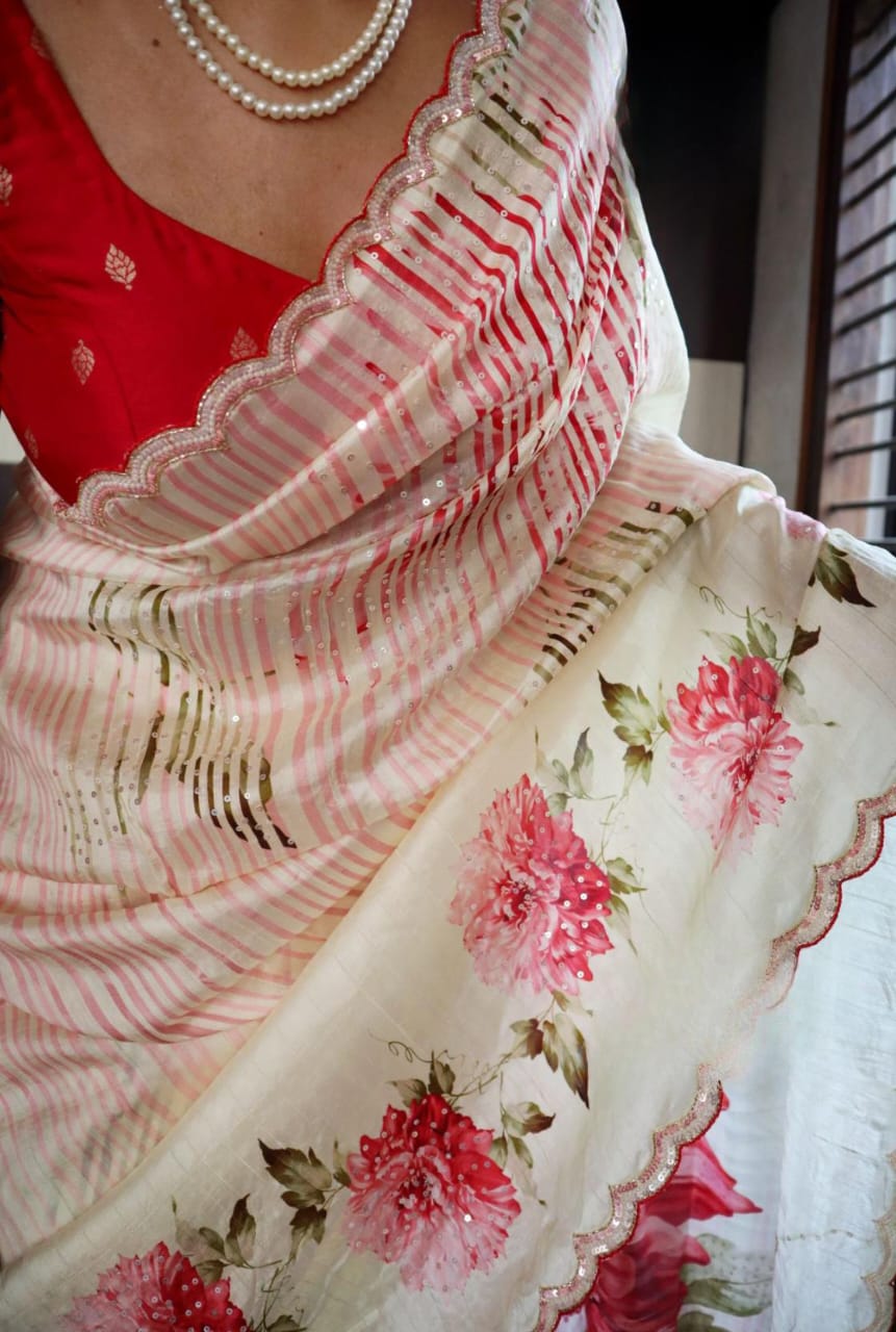 Beautiful floral printed pure tussar silk sarees with sequence and cutdana handwork cutwork borders