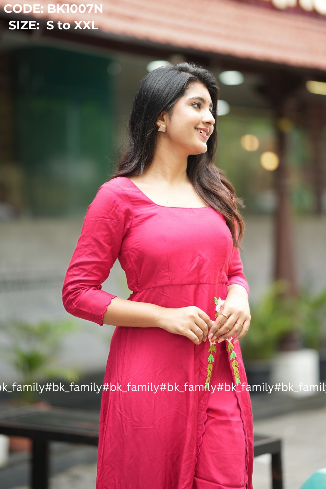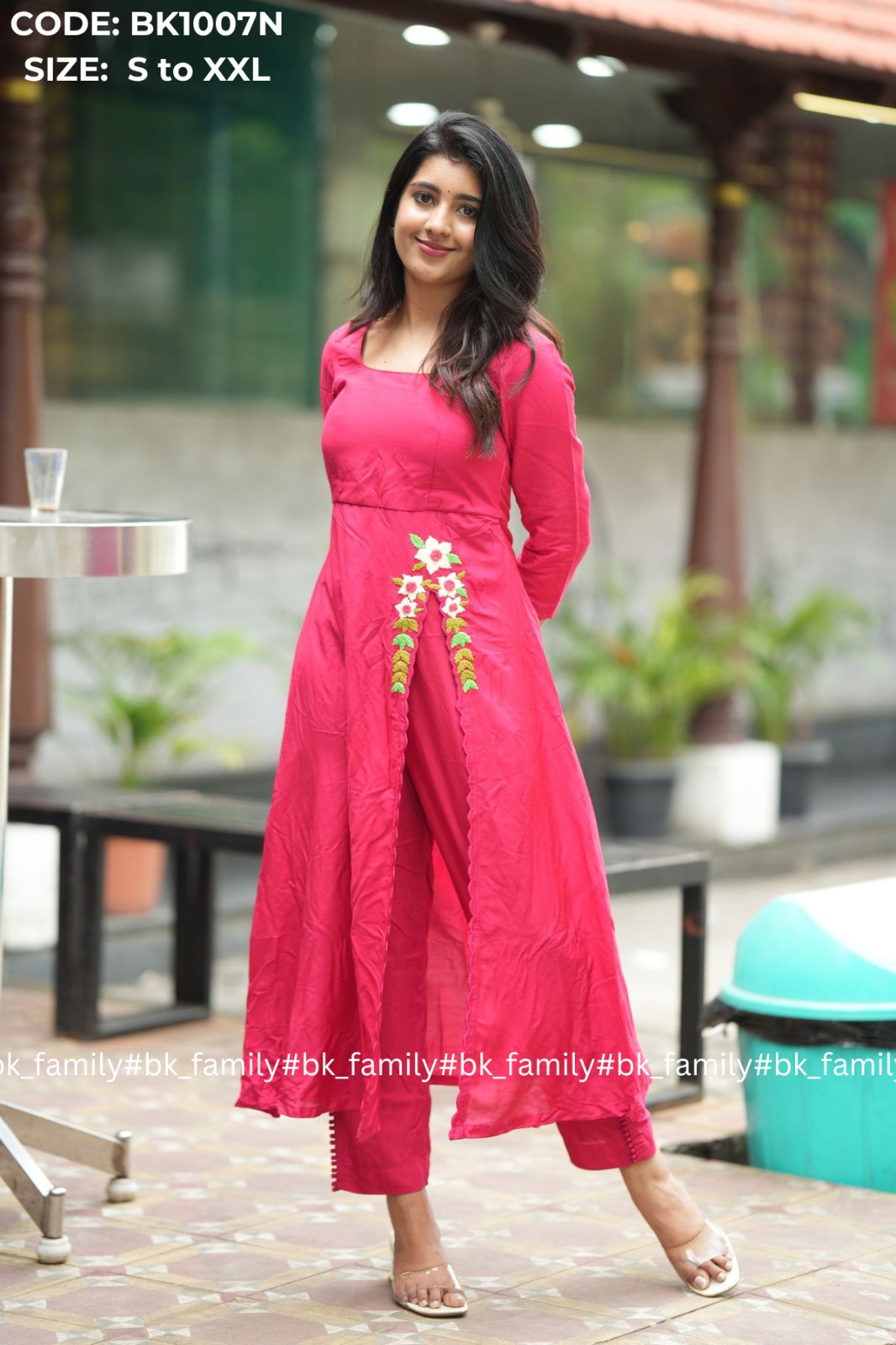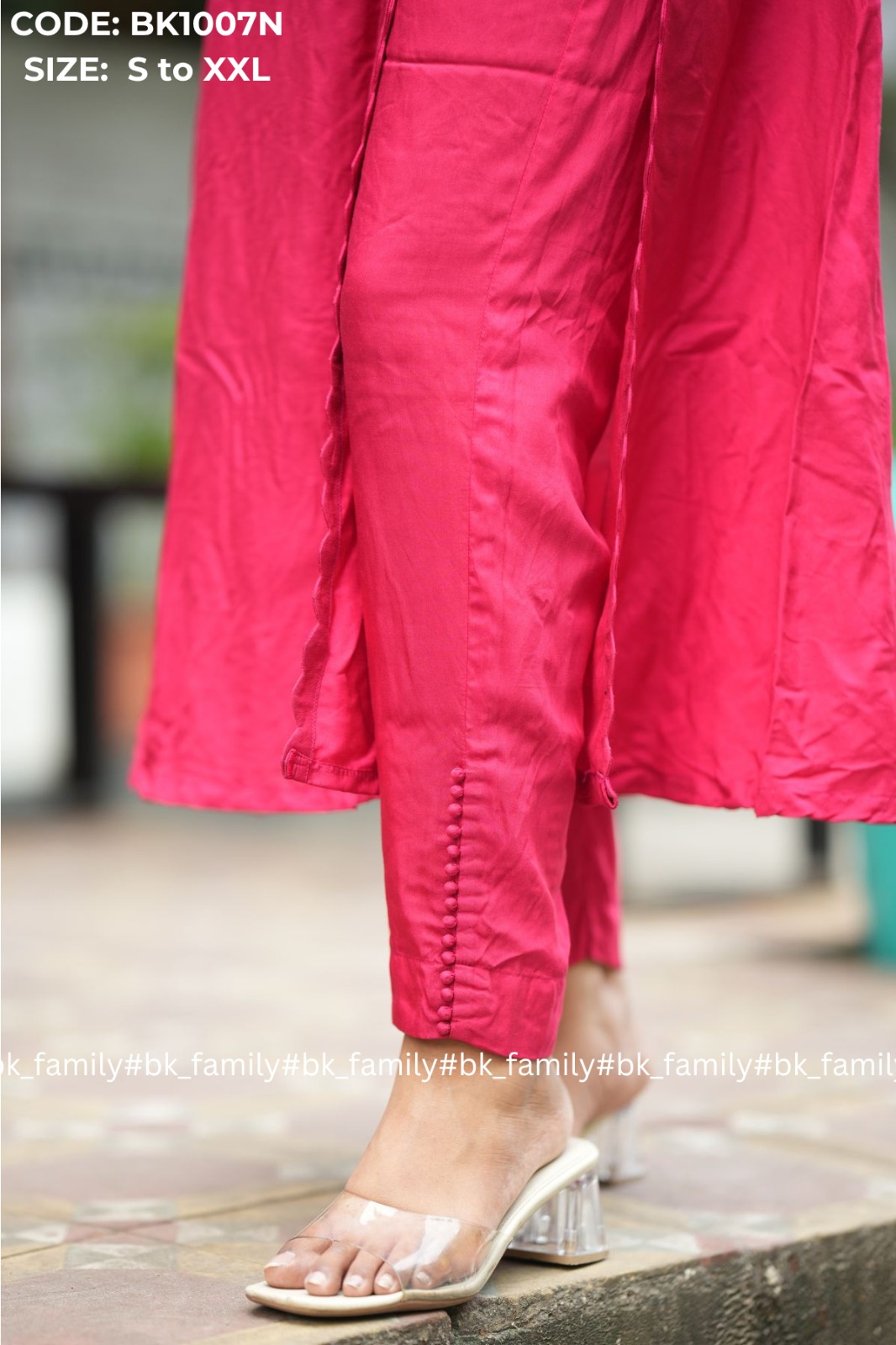 Embrace elegance with this stunning Raspberry color kurta adorned with delicate floral embroidery. Crafted from soft and breathable fabric, it ensures all-day comfort and style. The straight-cut silhouette and three-quarter sleeves add a touch of sophistication, making it perfect for casual outings or semi-formal gatherings. The pants have the same muslin fabric made with a simple potli (fabric button) for a classy look.
