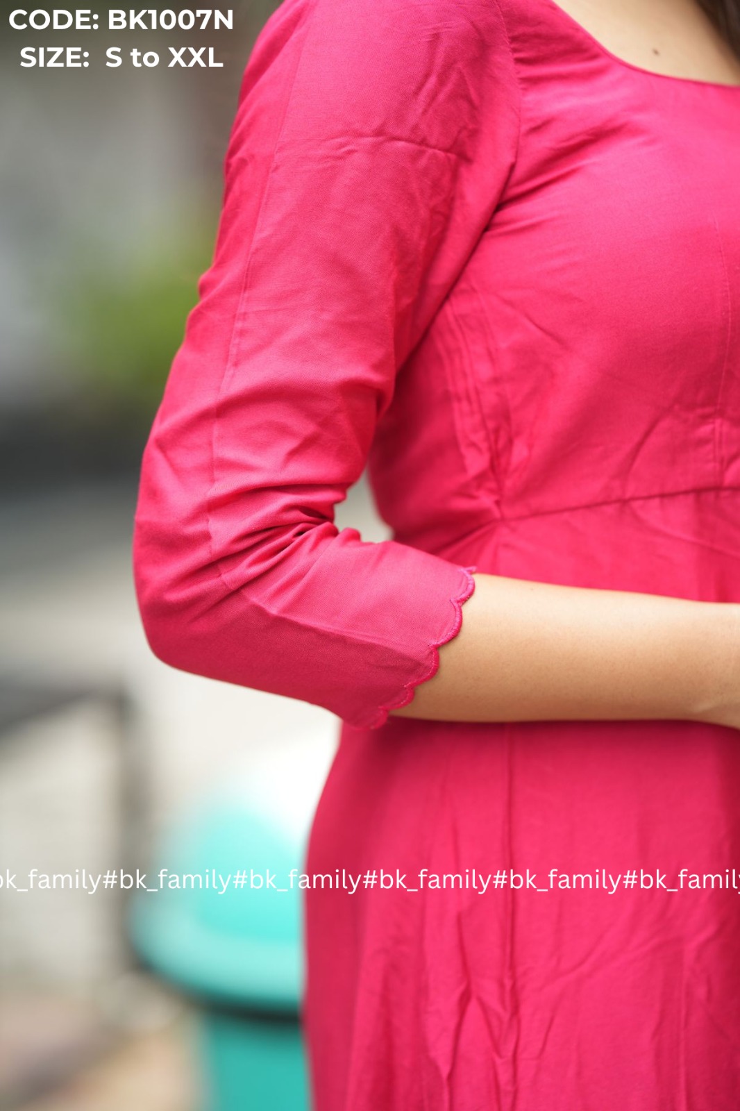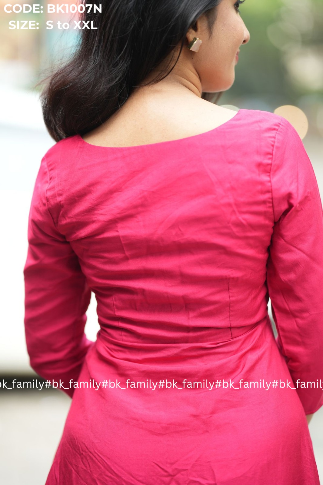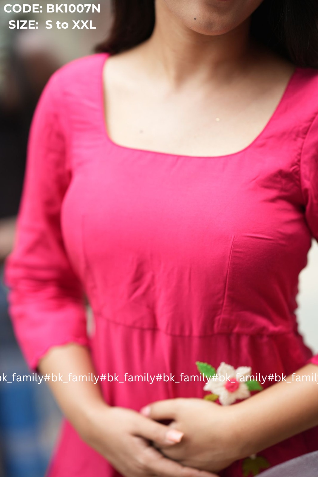 Embrace elegance with this stunning Raspberry color kurta adorned with delicate floral embroidery. Crafted from soft and breathable fabric, it ensures all-day comfort and style. The straight-cut silhouette and three-quarter sleeves add a touch of sophistication, making it perfect for casual outings or semi-formal gatherings. The pants have the same muslin fabric made with a simple potli (fabric button) for a classy look.