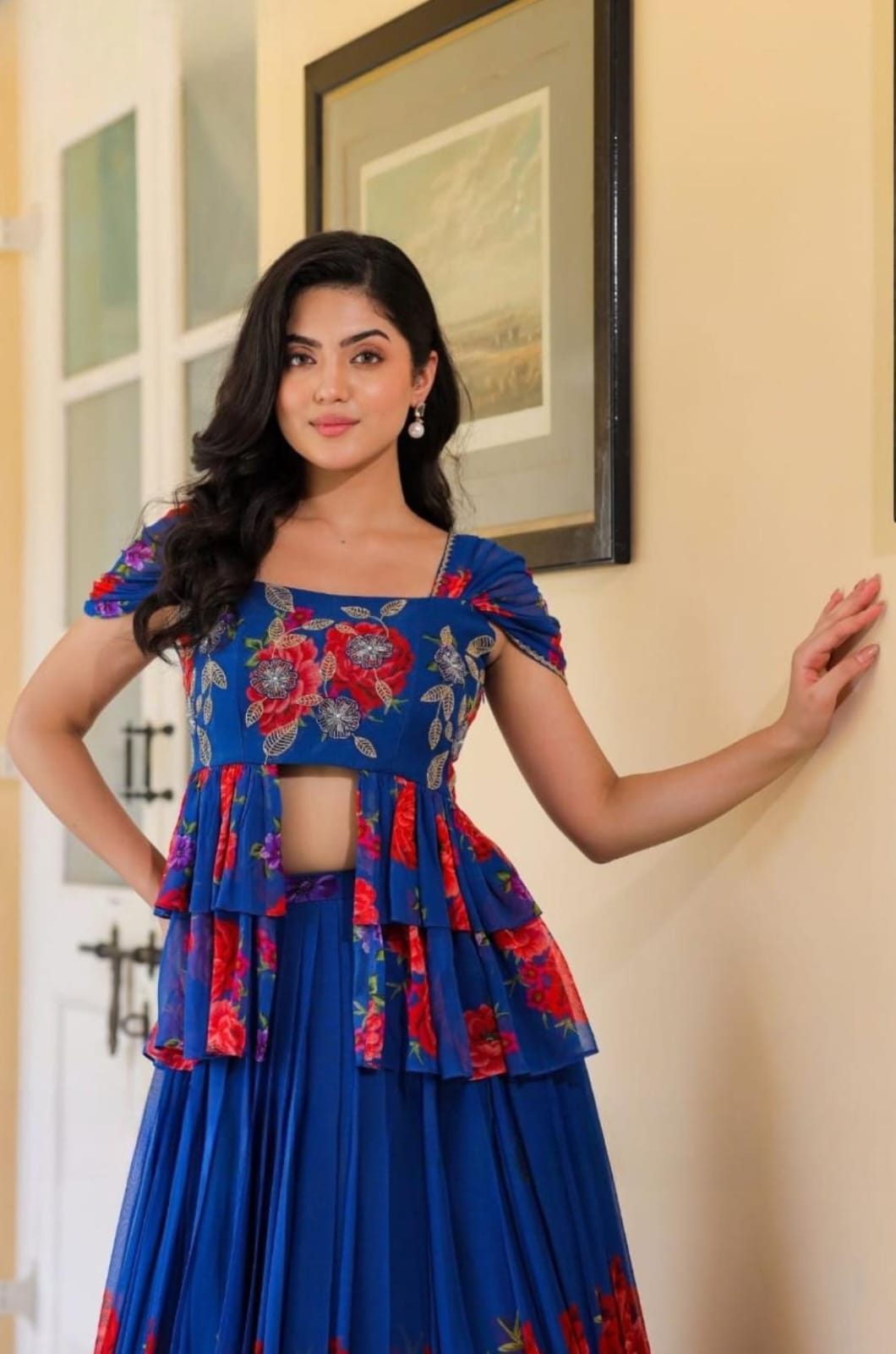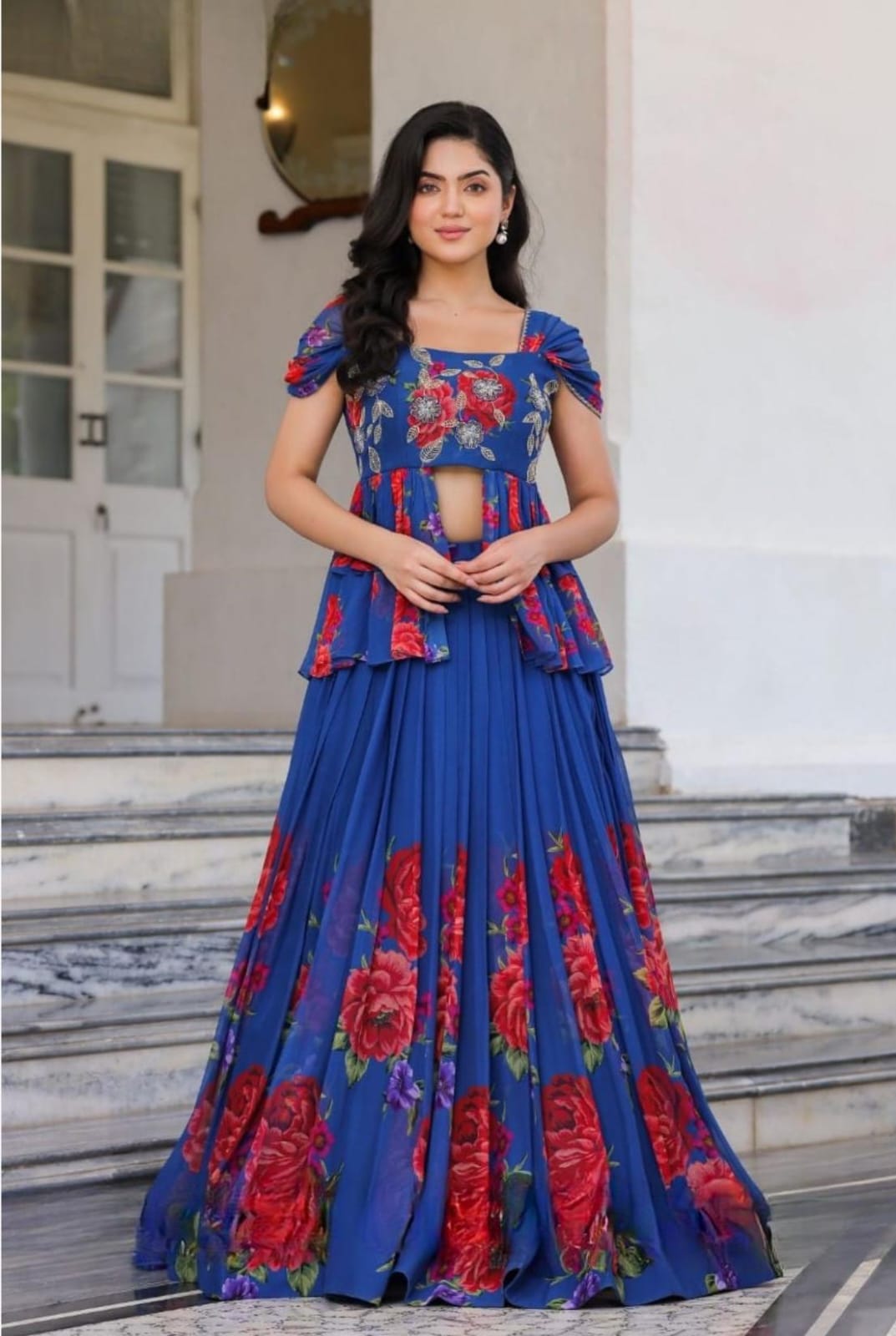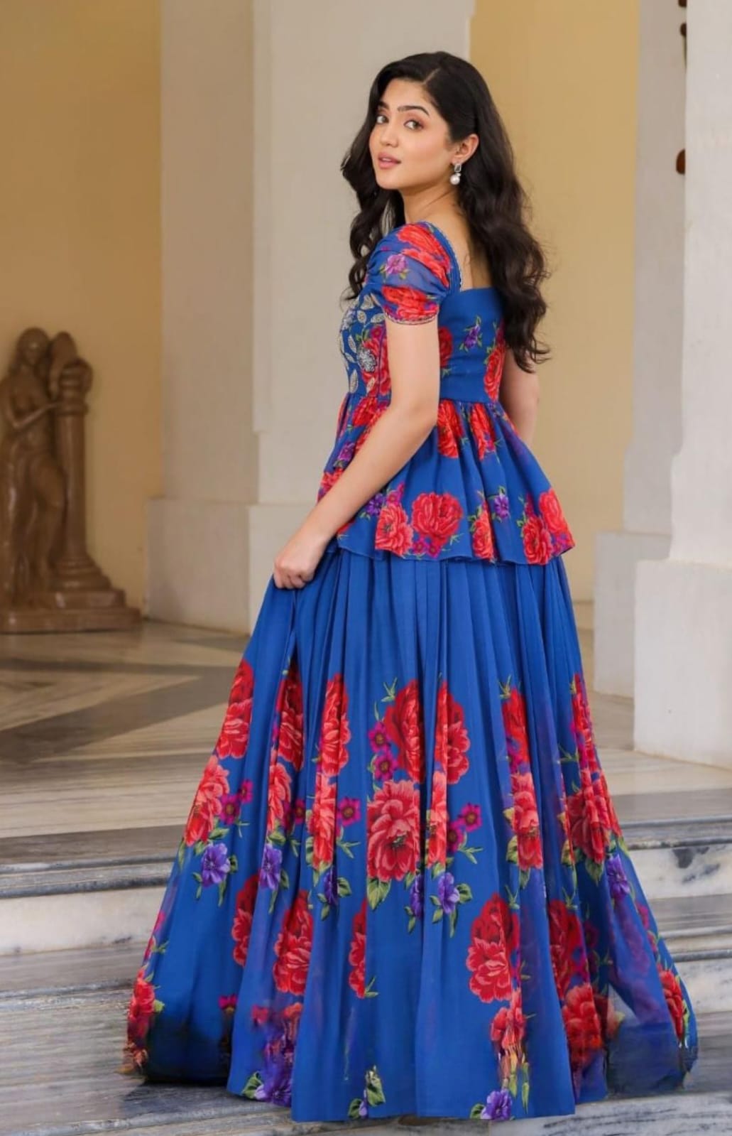 ]Discover your style in this vibrant royal blue Indo-Western outfit, designed with eye-catching floral patterns in red and green. The bodice is crafted with floral hand embroidery and features a trendy cut-out detail at the waist, adding a modern touch. The layered peplum-style top introduces a contemporary twist to the traditional silhouette. Pair it with the flowing skirt, embellished with large floral prints, to create a dramatic and elegant look. I recommend you to wear an accessorizing with pearl-crafted jewelry to complement the grace and charm of the outfit.