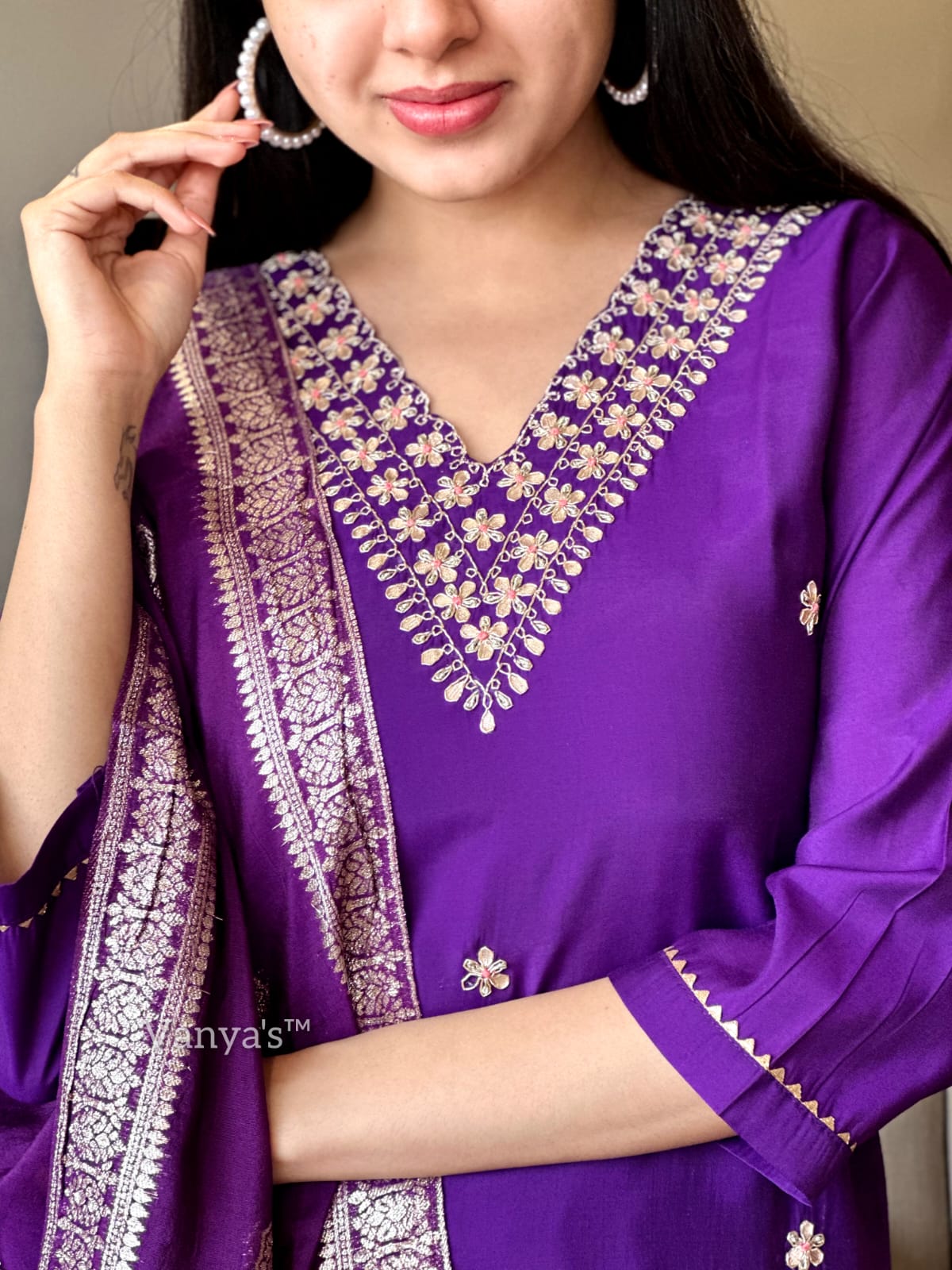 Beautiful roman silk kurta(attached lining)and pant. Hand work embroidery on kurta Paired with jaqurad banarsi silk duppata