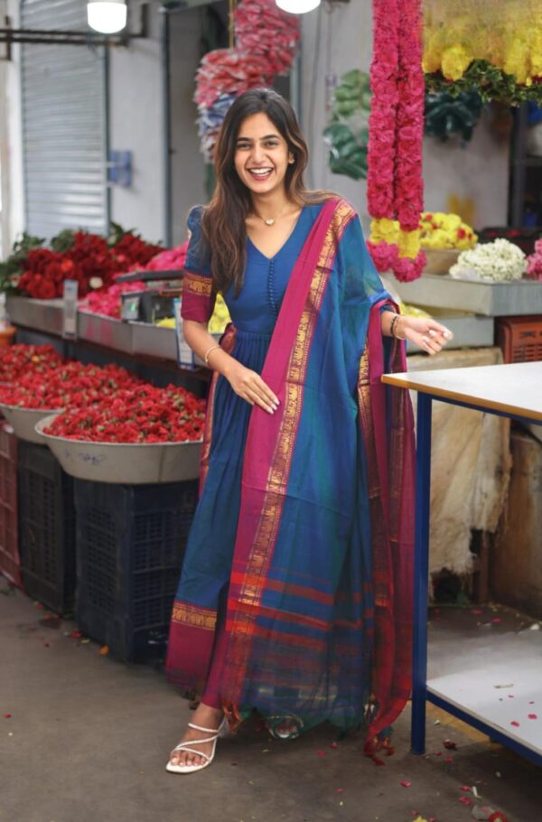 Are you looking for a comfortable yet classy outfit? Then, look at the most comfortable and perfect kurta set. This outfit is in a vibrant peacock blue color. Featuring a V-neckline and potli (fabric button) with a front gathering that ensures comfort while enhancing the dress’s movement, making it perfect for every body type. The puffy sleeves, dupatta, and even bottom have the same contrast, matching zari weaving of golden elephant motifs at the edge of the cotton handloom fabric. Adding a touch of casual and festive vibe and also perfect for formal occasions.