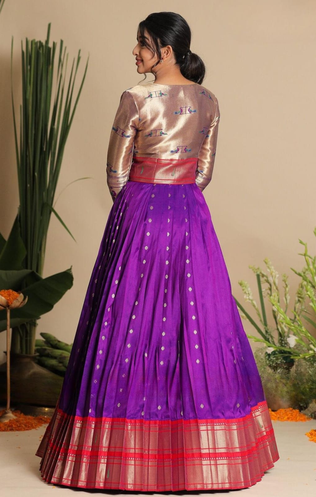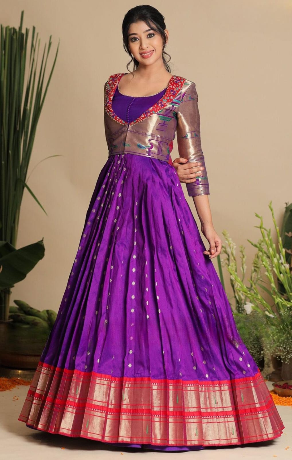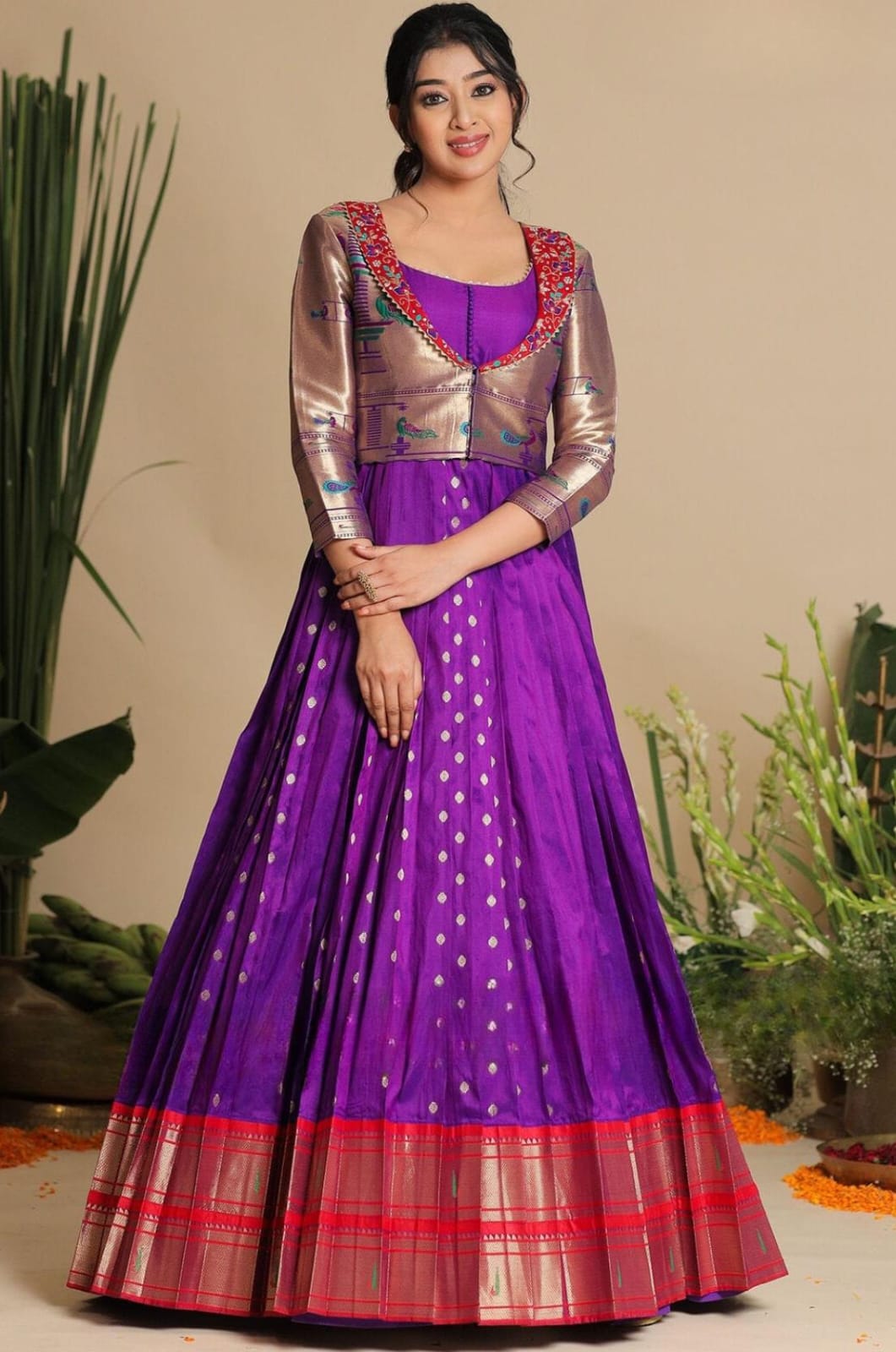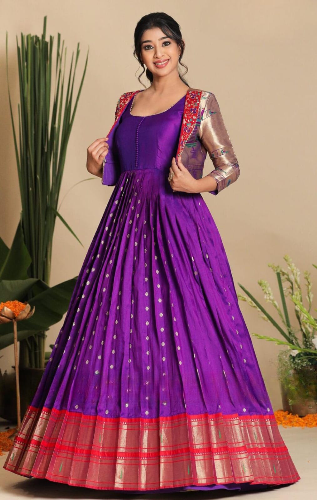 Sachika Pethani Jacket Dress Celebrate festivals with our contemporary Banarasi purple dress, showcasing elegant potli details on the yoke and a pattu border on the flair. The versatile separate Pethani Jacket, with its 3/4th sleeves and collar highlighted by intricate Khatli work, perfectly complements the trendy scoop neckline. (The jacket was Detachable)