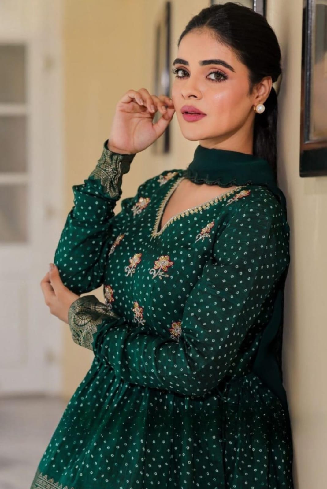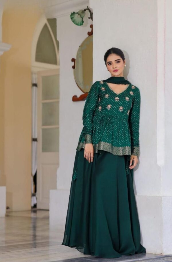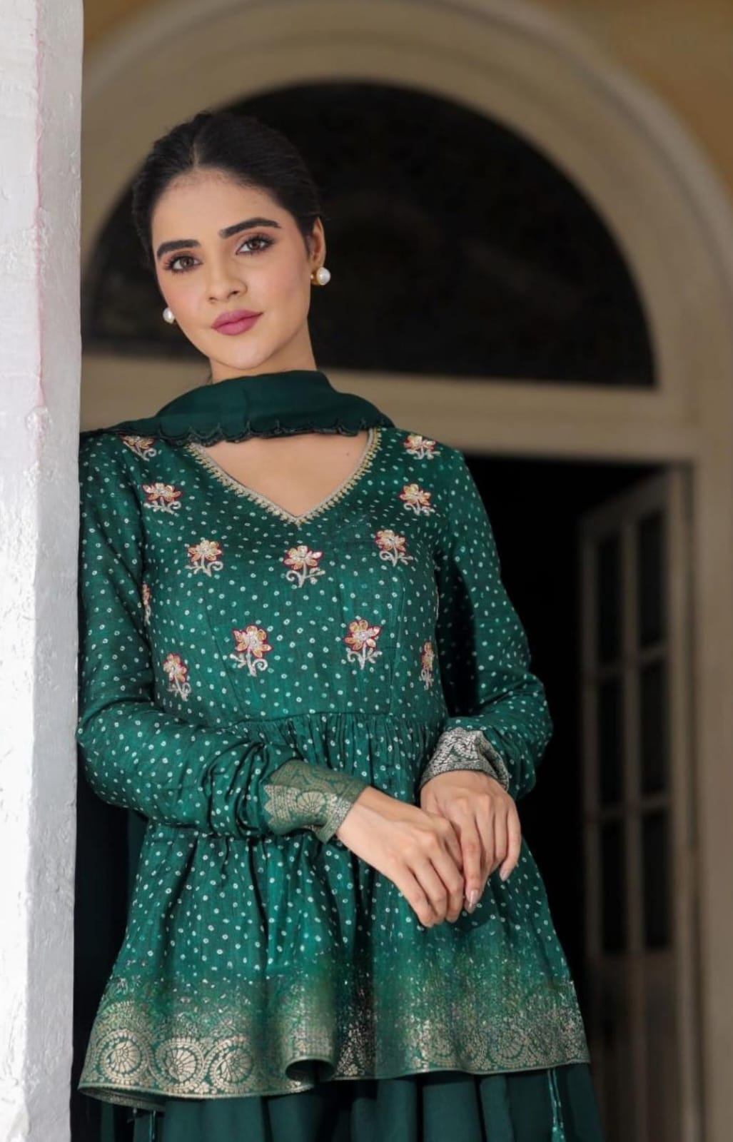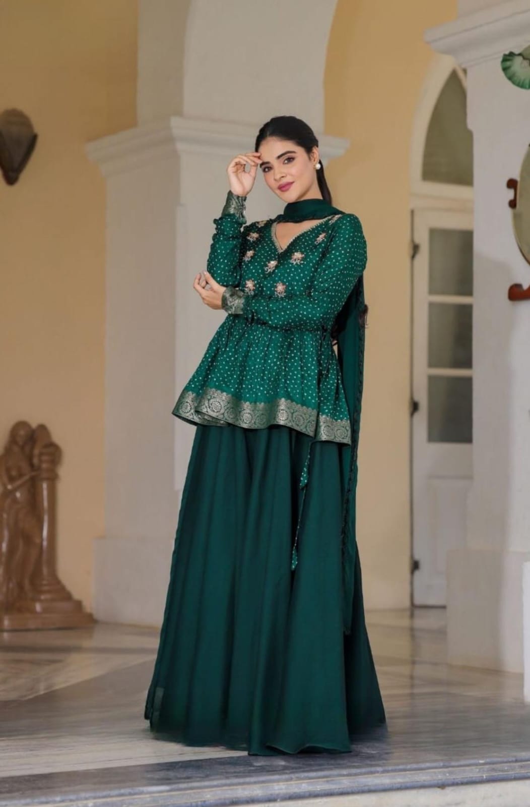 Add a stunning deep-green dress to your wardrobe for a look that’s both beautiful and elegant. This outfit features a long, flowing palazzo paired with a peplum-style top adorned with intricate hand embroidery and delicate bandhej patterns. The top includes full sleeves and a V-neckline, perfectly complemented by a matching dupatta gracefully draped around the neck. This Sanika outfit is perfect for a wedding and adds a touch of grace to a Mehndi function. Complete the look with attractive earrings to make it even more elegant.
