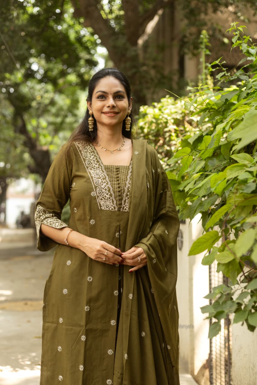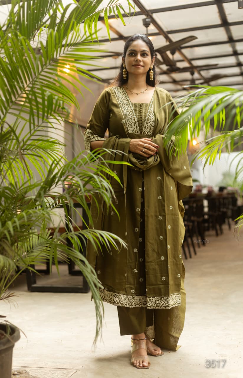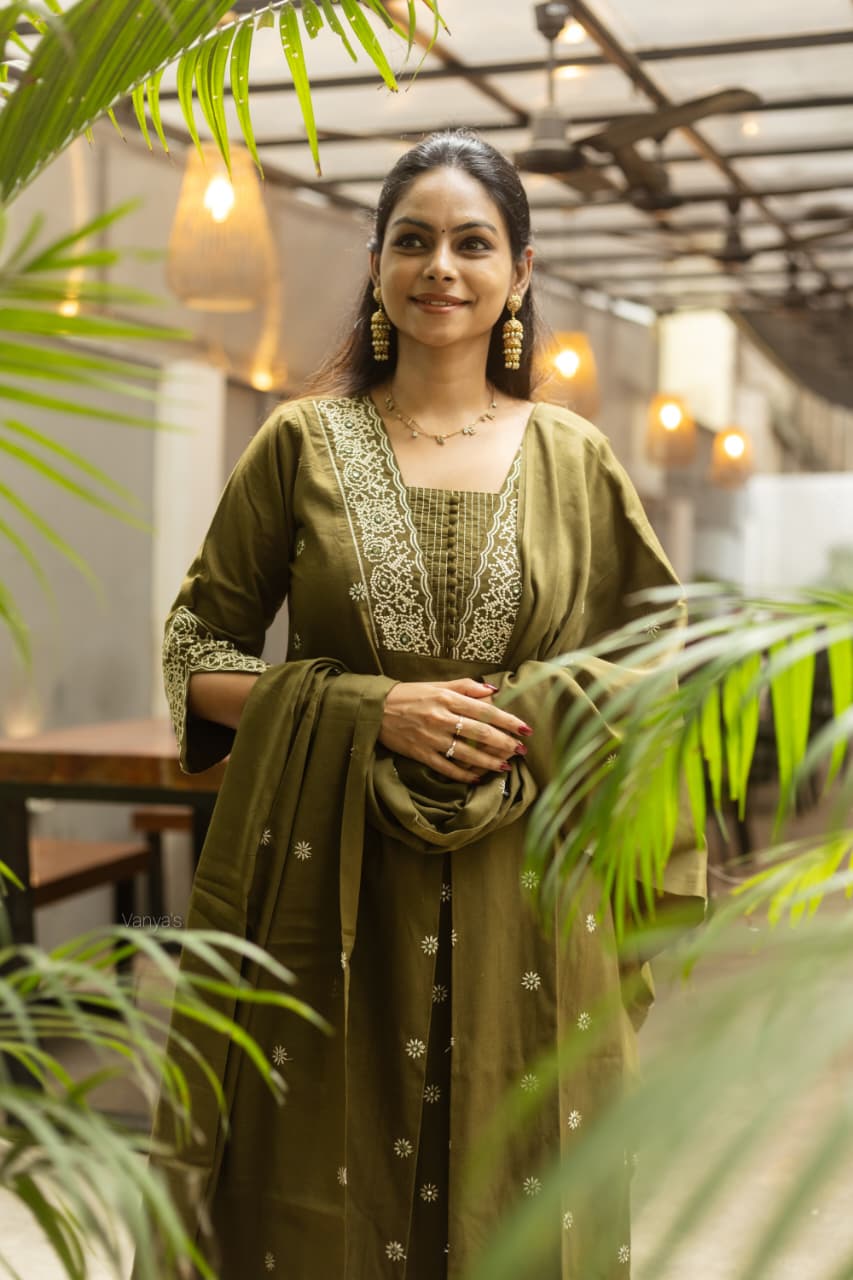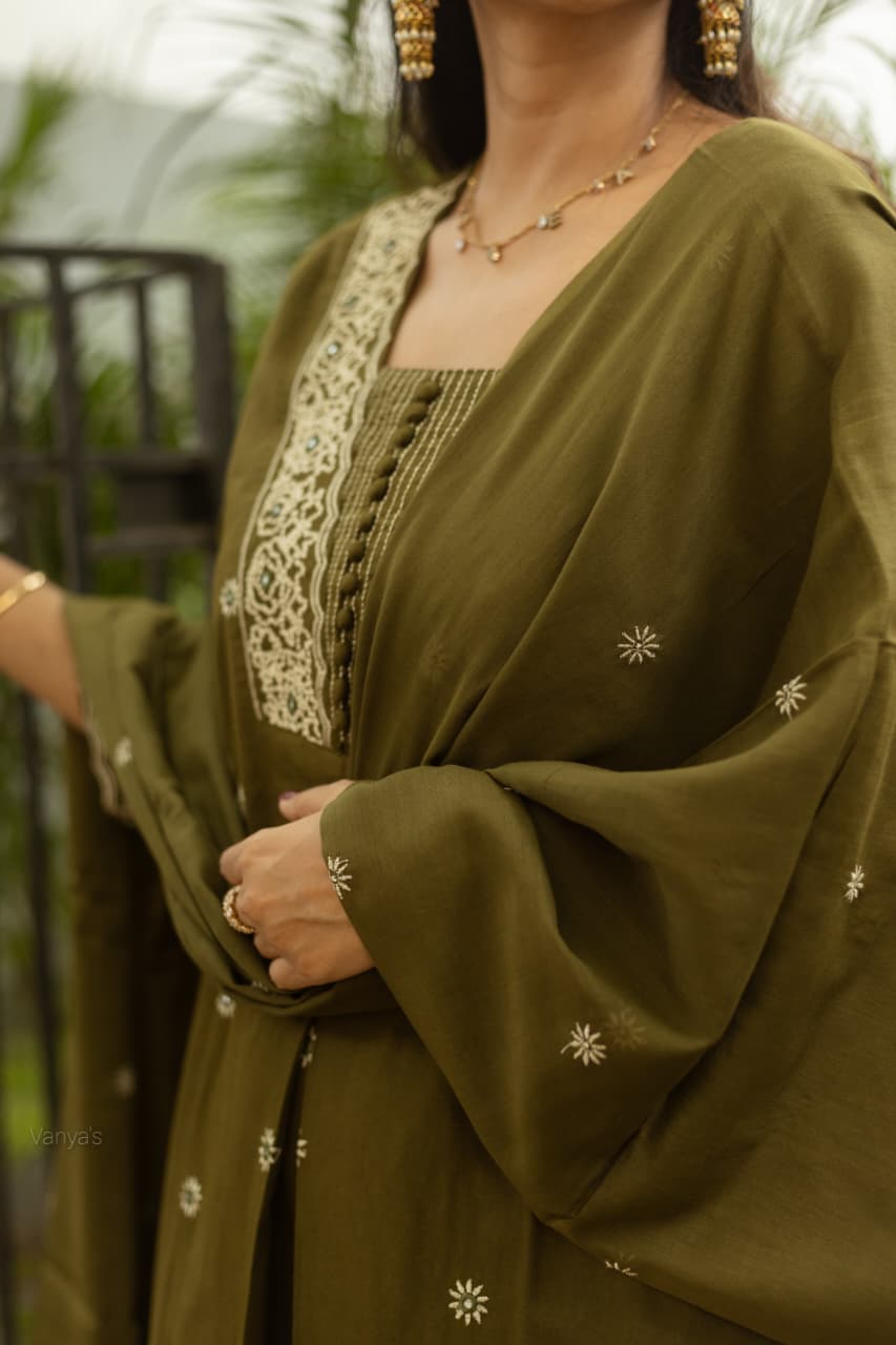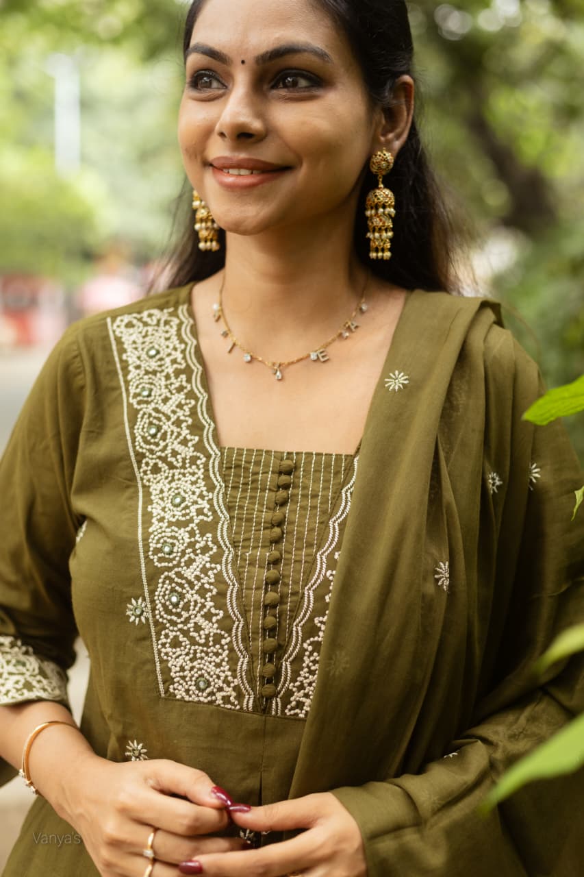 “Seize the day” with a classy self-weave embroidery Mehandi Green suit.