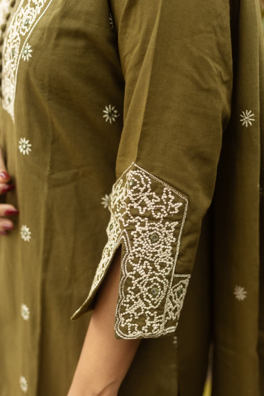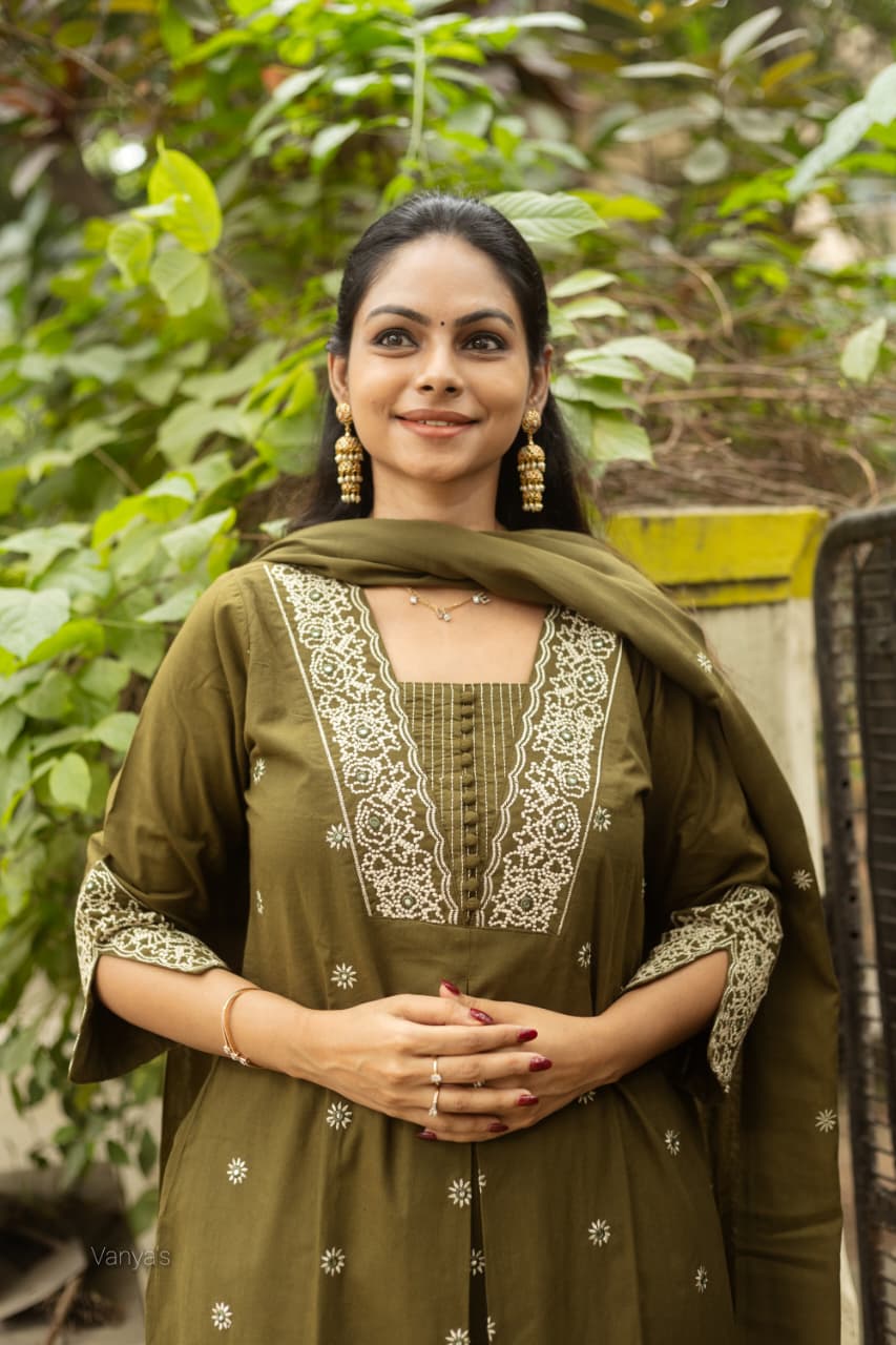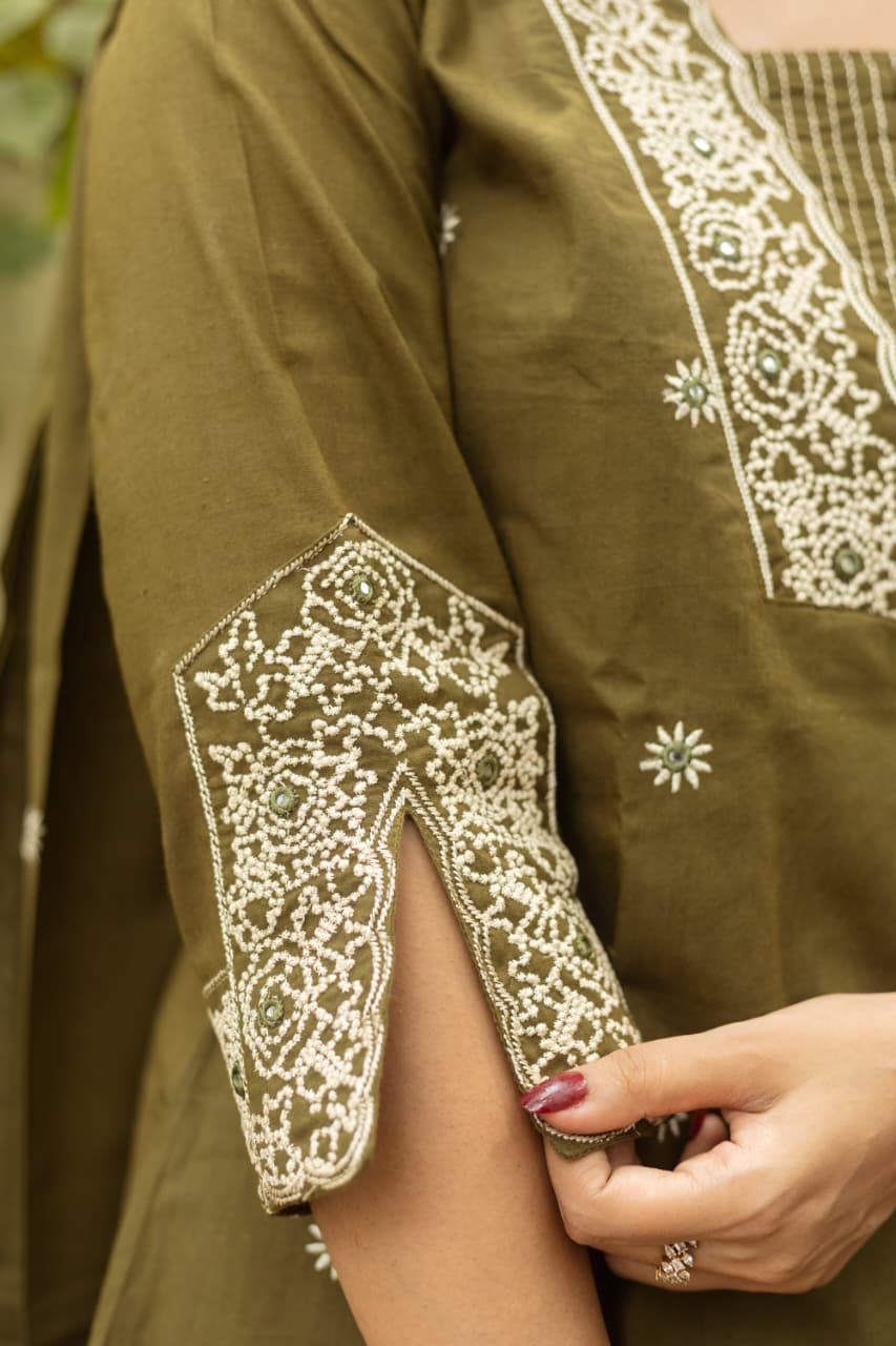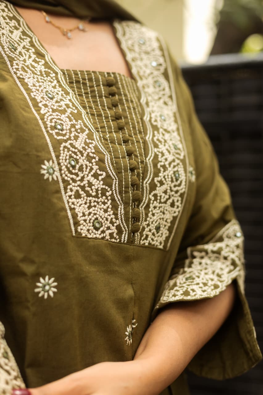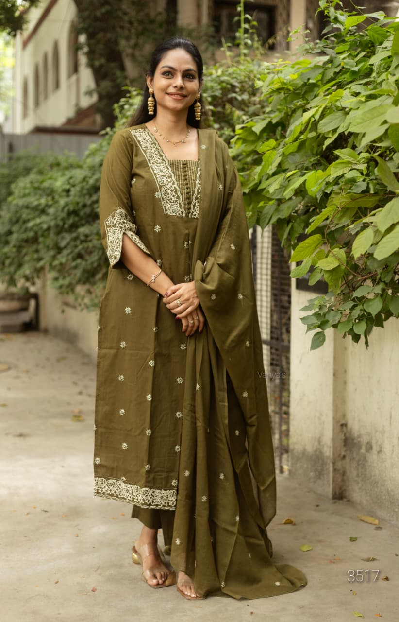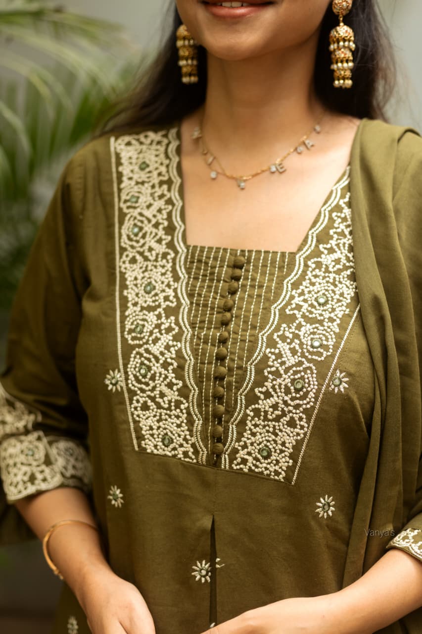 “Seize the day” with a classy self-weave embroidery Mehandi Green suit.