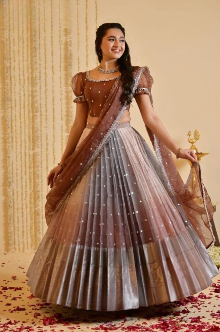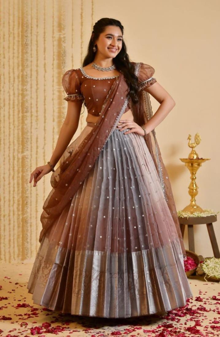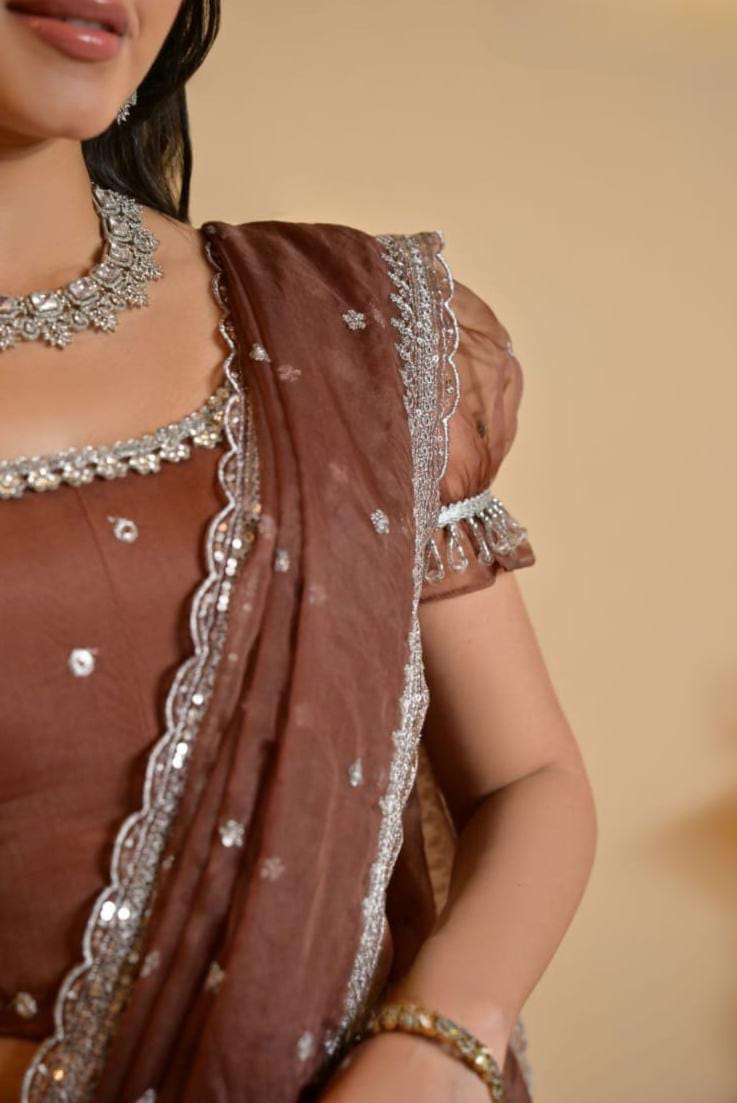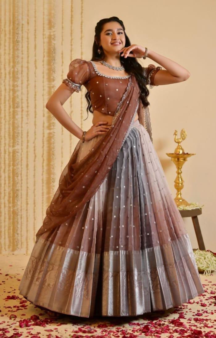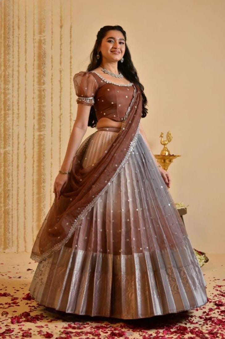 Make heads turn with this stunning mirror work organza lehenga – designed for the modern diva who loves tradition with a twist.This lehenga features a grand 5.5-meter flair with eye-catching mirror work all over and a rich zari border that adds royal charm. The matching organza blouse comes with stylish puff sleeves, delicate diamond lace, and playful hanging latkans – giving it a festive yet elegant look.The 3-meter dupatta is beautifully embroidered and finished with pretty latkans, completing the look with grace. Styled in a trending co-ord set pattern and shaded in classy tones of brown, grey, and silver – this outfit is perfect for weddings, sangeets, receptions, and festive occasions.