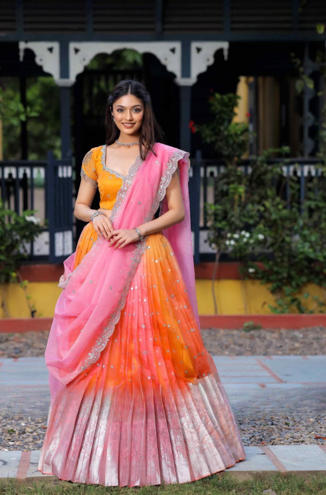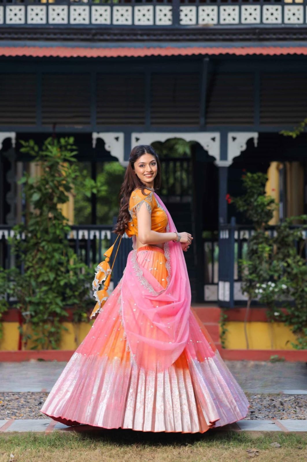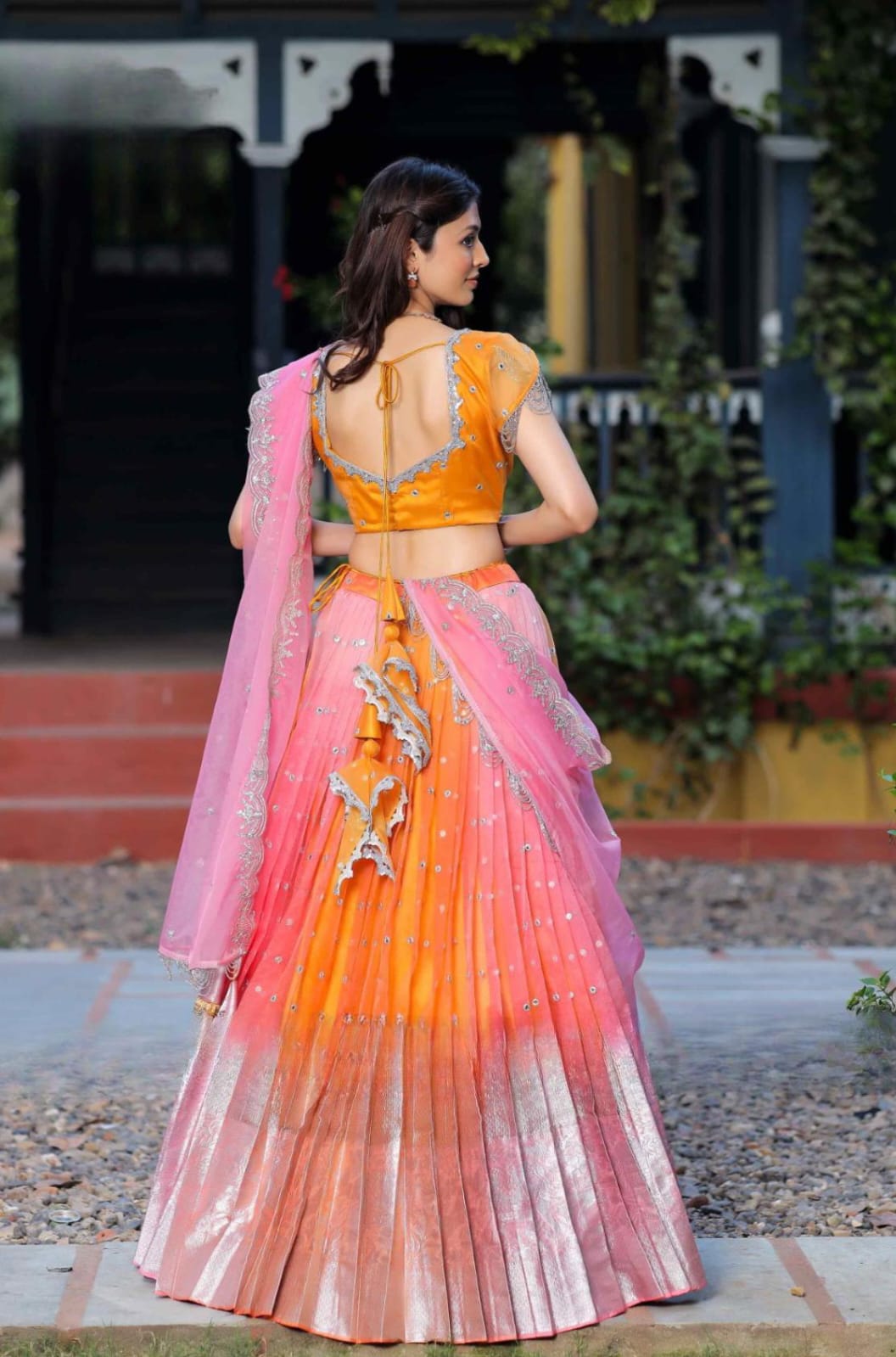 Draped in opulence, our Silver Elegance Tyohar Lehenga Set is a masterpiece that exudes timeless charm and luxury. Crafted with meticulous attention to detail, the lehenga is a work of art. Its base is adorned with intricate mirrorwork, creating a mesmerizing play of reflections as you move. The lehenga’s voluminous flair and intricate zari border add an extra layer of grandeur. The blouse is designed with a modern twist, perfectly combining tradition and contemporary style.