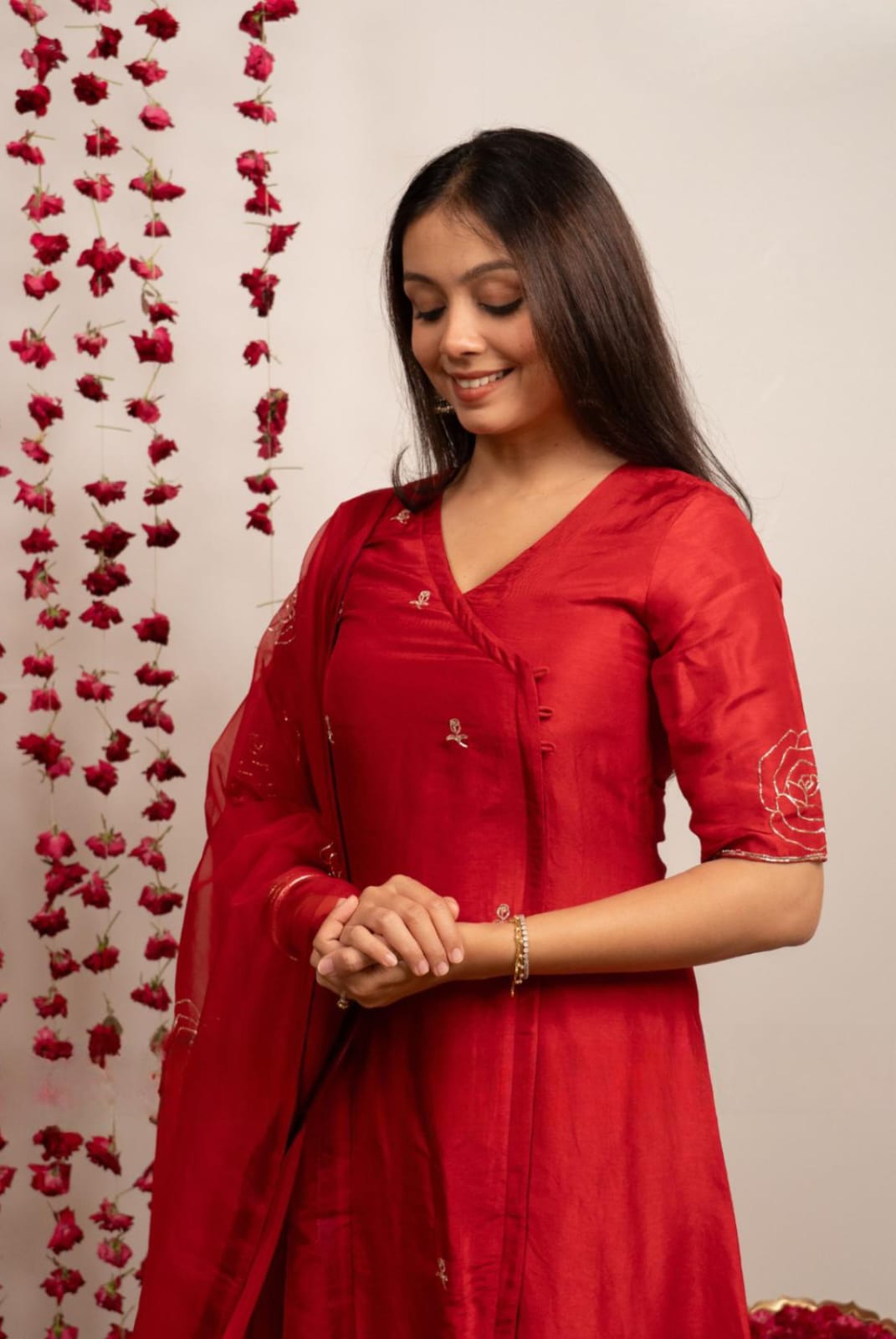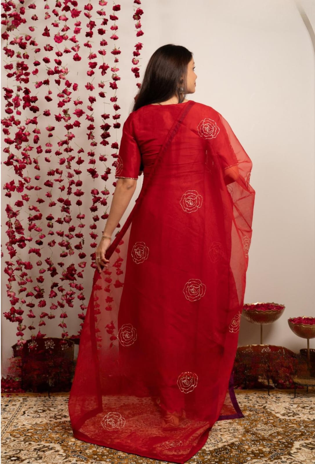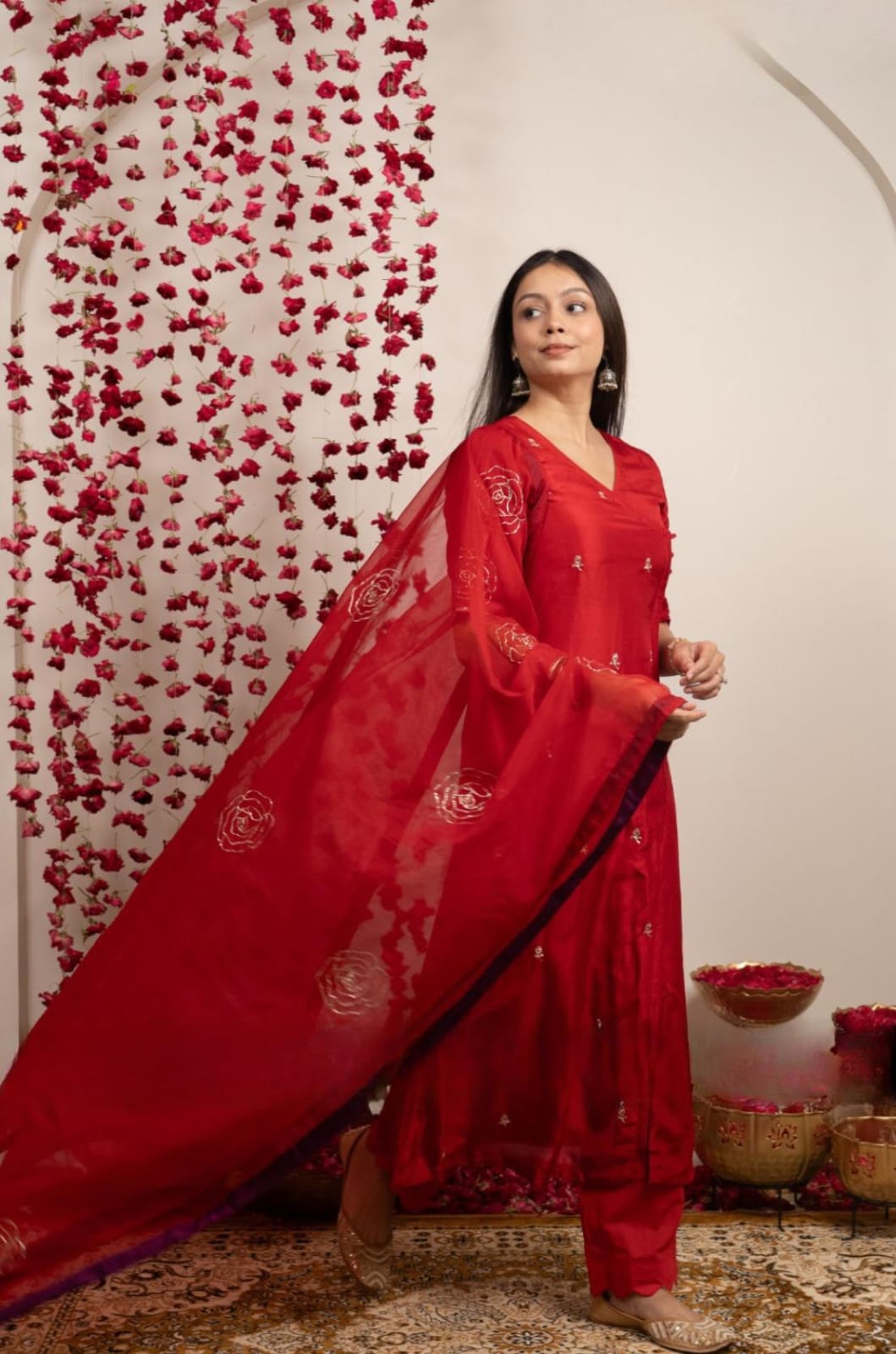Step into sophistication with this stunning A-line kurta set in a bold and beautiful red Russian silk. The front line is gracefully adorned with exquisite rose motif pitta handwork, adding texture, shimmer, and artisanal charm to every step you take.This 3-piece ensemble is completed with a soft organza dupatta, offering a lightweight drape with an ethereal touch, and sleek pencil pants that balance the look with a modern silhouette.