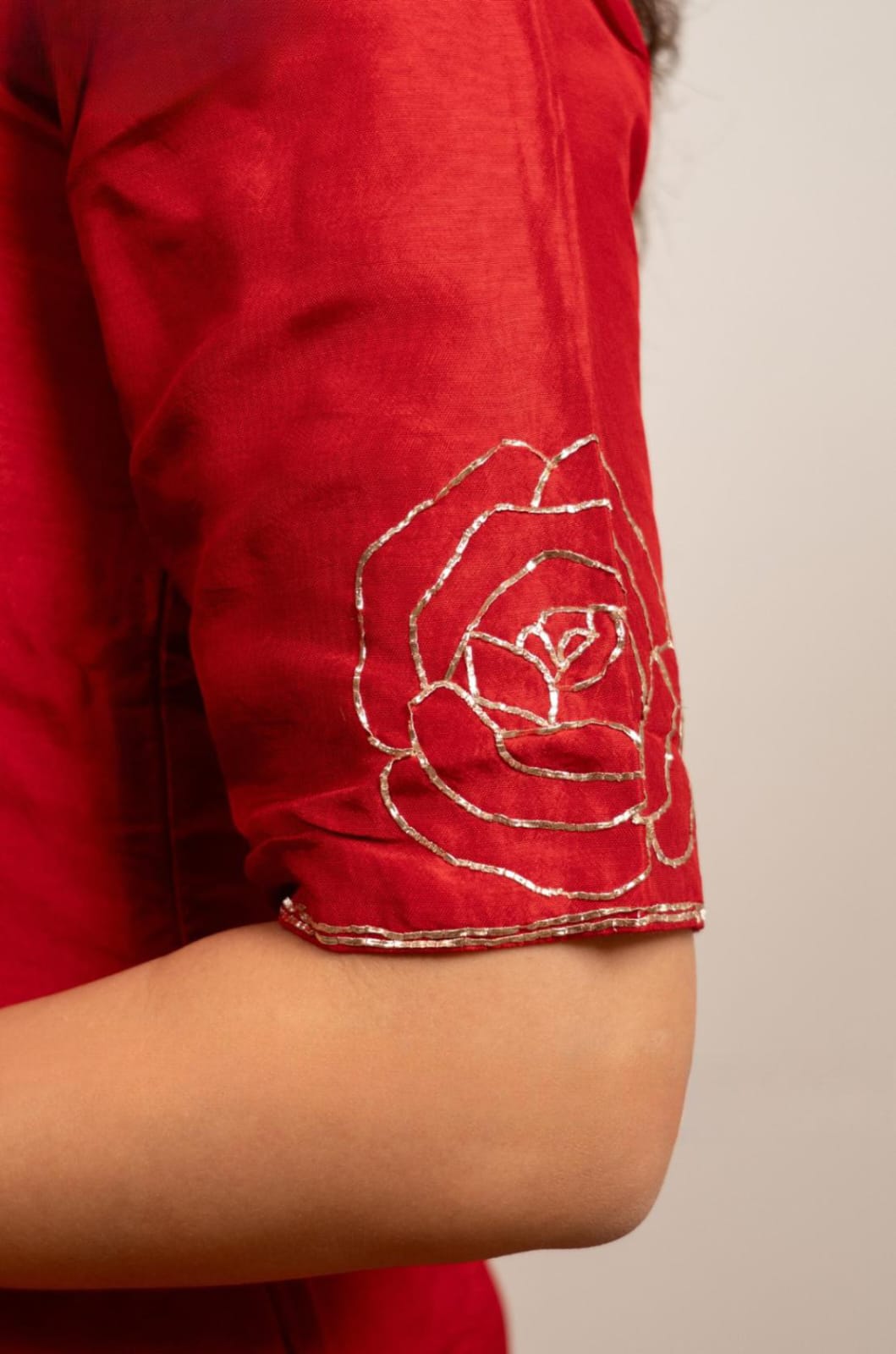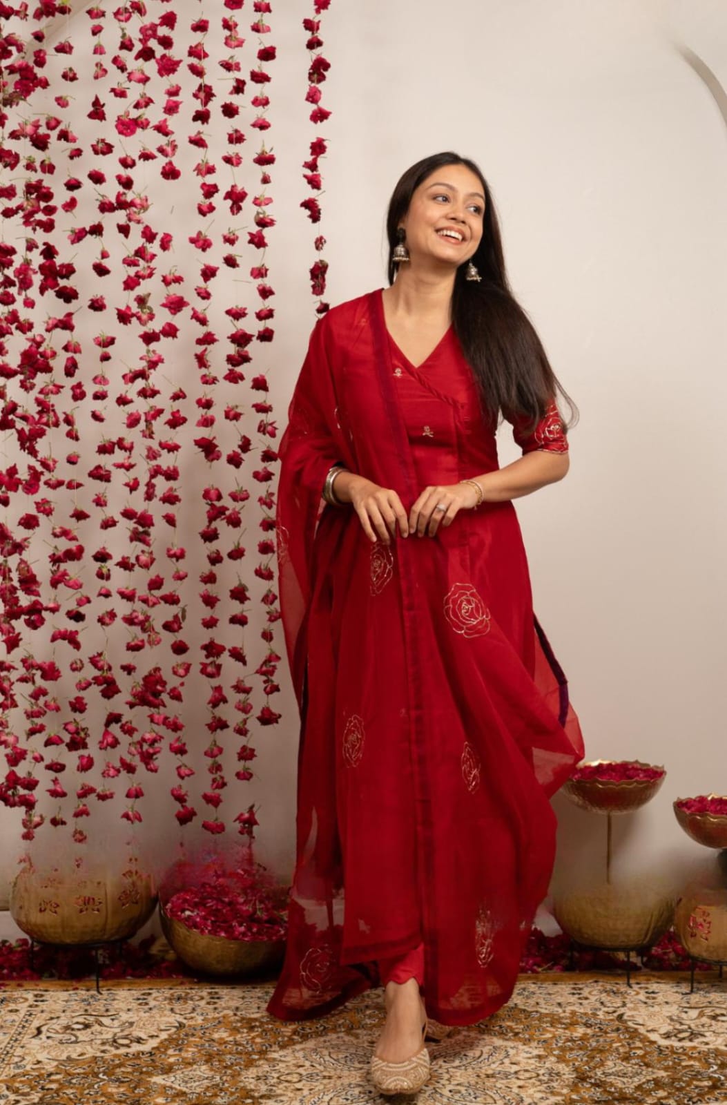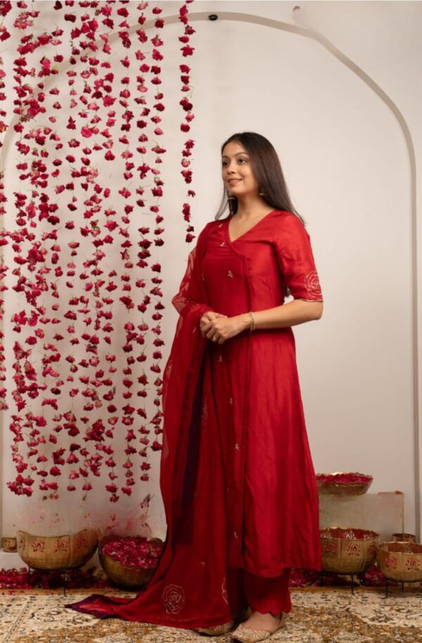 Step into sophistication with this stunning A-line kurta set in a bold and beautiful red Russian silk. The front line is gracefully adorned with exquisite rose motif pitta handwork, adding texture, shimmer, and artisanal charm to every step you take.This 3-piece ensemble is completed with a soft organza dupatta, offering a lightweight drape with an ethereal touch, and sleek pencil pants that balance the look with a modern silhouette.