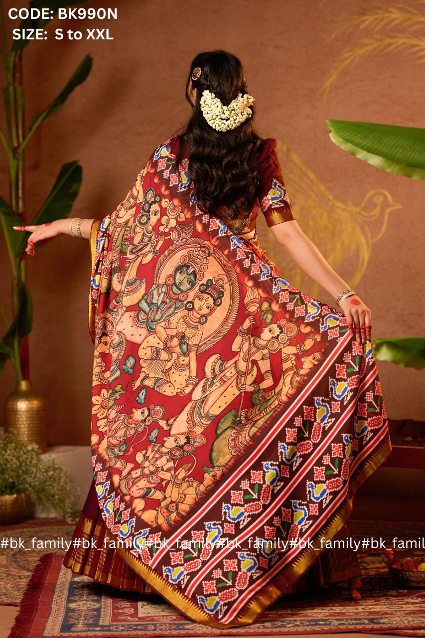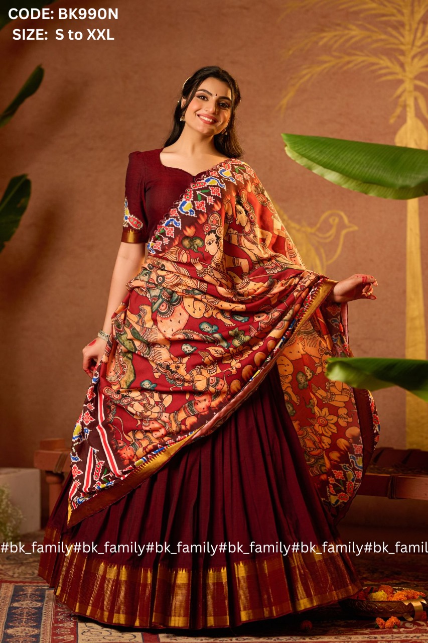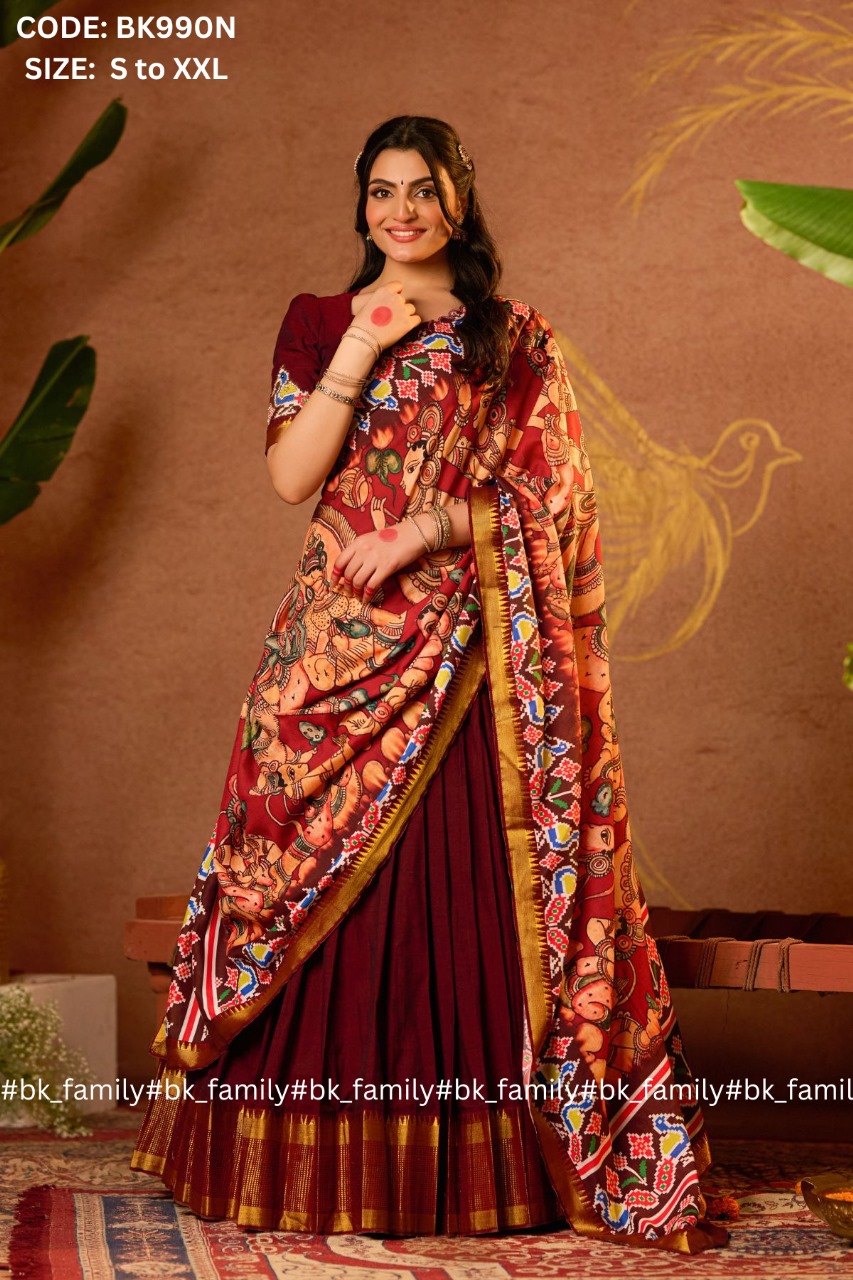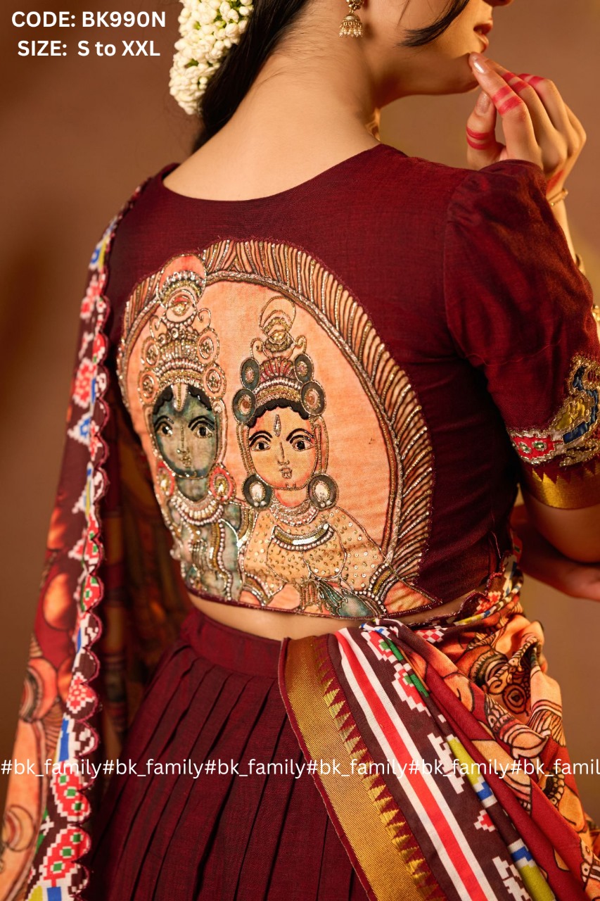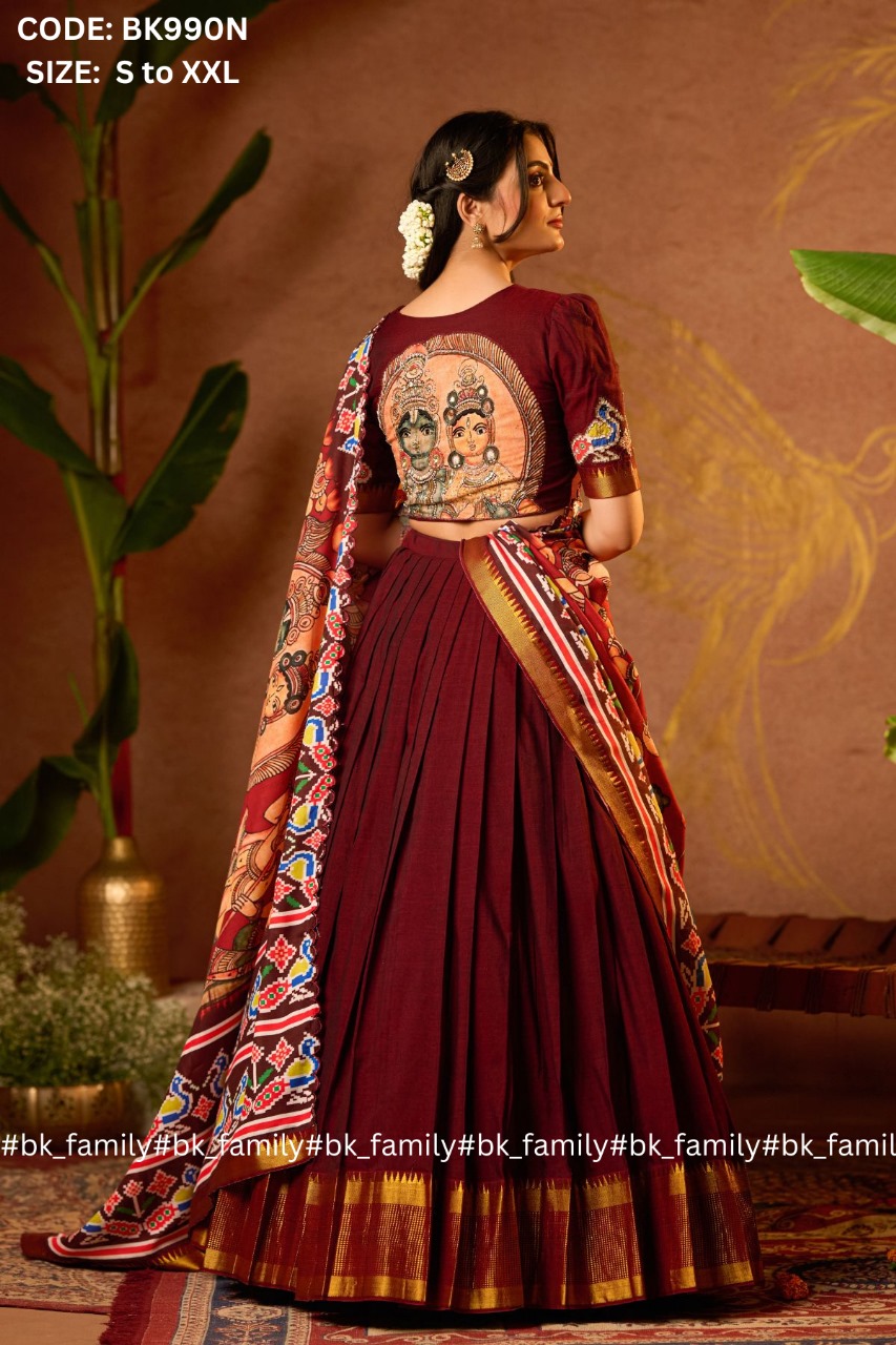 The one who loves to wear a traditional lehenga set. This Sitaramam lehenga voni is the best blend of traditional yet modern looks. The handloom cotton blouse is made out of softness and comfort, the heart-shaped neckline pattern with a handwork patch of peacock and the back pattern of lord RAM and SITA will add a cultural touch to the entire lehenga voni. The patola and Ramayana print scalloped dupatta with a 5-meter flare pleated skirt adds an overall chic look to the whole attire. This Sitaramam is perfect for cultural events, traditional functions, and pooja or temple visits.